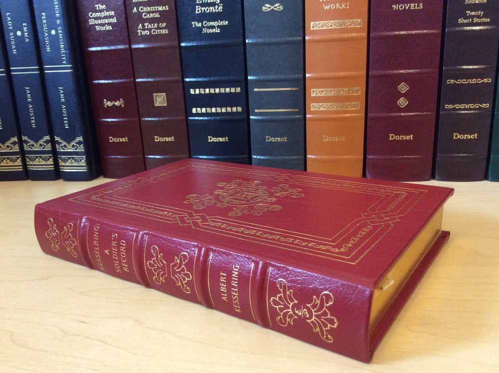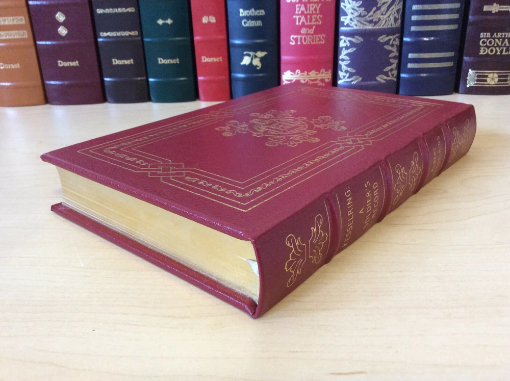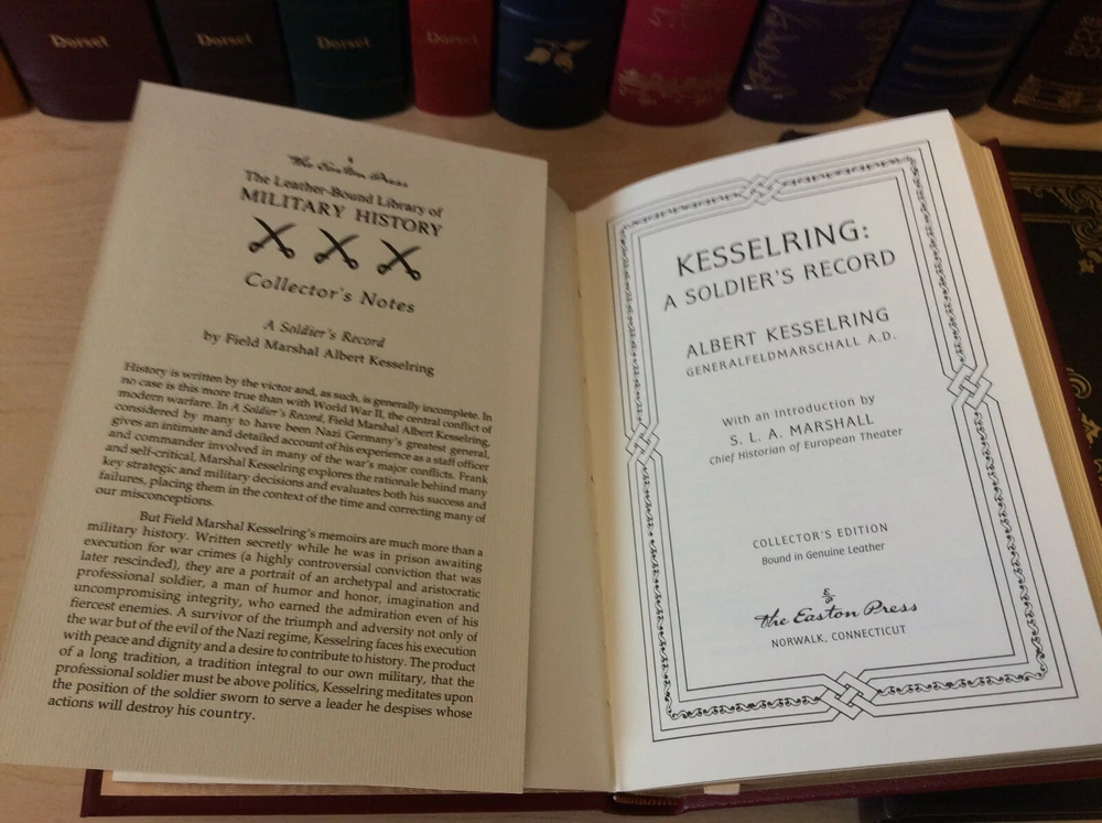 Kesselring: A Soldier's Record by Albert Kesselring from The Leather-Bound Library of Military History series bound in leather, with gilt page edges, a ribbon marker, moire endpapers and a ribbed spine Item Condition: An Easton Press leatherbound in Very Good condition, with the Collector's Notes included. There are no names, bookplates or stamps from previous owners inside. The binding is tight, and the pages are clean. The leather binding is in great condition, with little wear, and the gilt page edging is bright and shiny with just a few marks. Dimensions are approx: 8.75" x 5.75" x 1.25" This book will ship in a box with bubble wrap. Photos are of the actual book that will be shipped.
