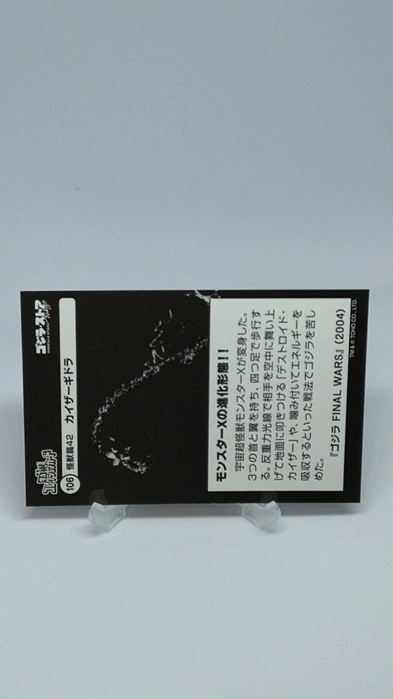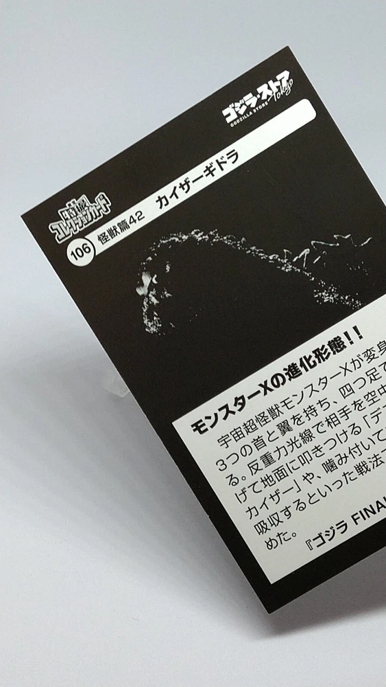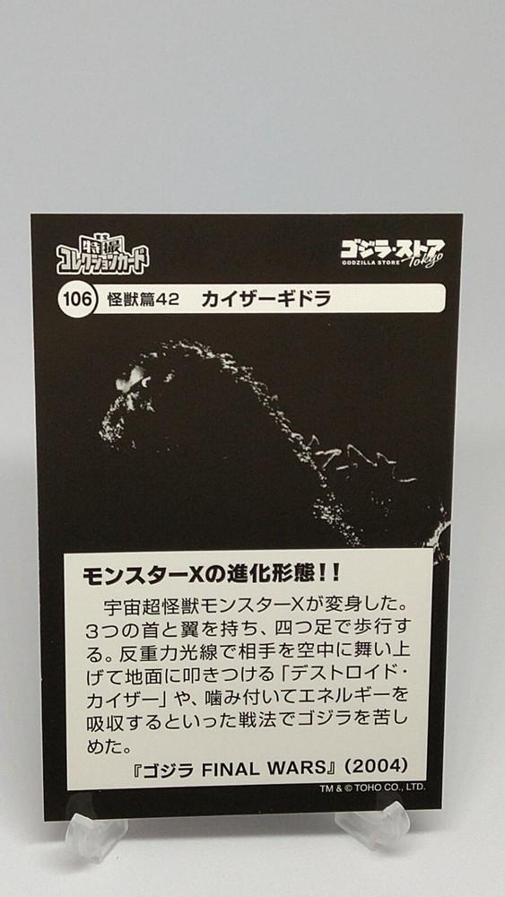King Ghidora Toho Tokusatsu Collection Card No.106 Godzilla Store Tokyo Japanese Description Please see the picture for the details of damages and dirt or ask us before your purchase. 100% Authentic or Money Back Guaranteed. (Do not worry you are protected by eBay and eBay Managed Payments) See the pictures for more details. If you have any question about the condition, accessories, or anything about the product, please feel free to message us. We are glad to answer all your concerns. Payment Same as ebay payment method. Shipping Economy shipping: Delivery time will be about 11 - 23 days. Standard shipping: Delivery time will be about 5 - 10 days. Expedited shipping: Delivery time will be about 1 - 4 days. Terms of Sale Money back guarantee within 30 days if returned by customer. We would not be able to accept your bid if you; 1) Don't have a PayPal account. 2) Have unpaid items reported. 3) Have a primary shipping address in countries you don't ship to. 4) Have reportedly violated eBay policies. 5) Have a Feedback score lower than the number you specify. International Buyers - Please Note: Import duties, taxes and charges are not included in the item price or shipping charges. These charges are the buyer's responsibility. Please check with your country's customs office to determine what these additional costs will be prior to bidding/buying. These charges are normally collected by the delivering freight (shipping) company or when you pick the item up - do not confuse them for additional shipping charges.