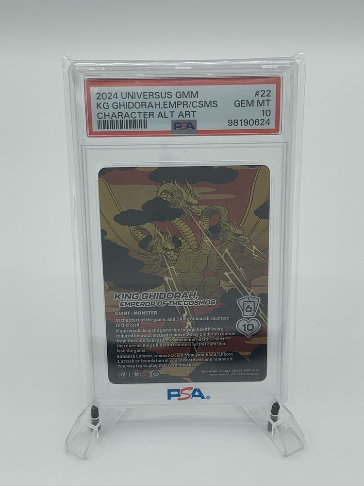 Dive into the cosmic realm with the King Ghidorah Emperor of the Cosmos card from the Universus Challenger Series: Godzilla. This collectible features the formidable creature in stunning alternate art, offering a unique addition to any collection or deck. The card, numbered CHA03-KRM 1/22, showcases the meticulous craftsmanship of UVS Games and comes professionally graded as a GEM MINT PSA 10, ensuring its premium quality.With its certification number 98190624, this King Ghidorah card is a testament to both collectors’ and enthusiasts’ passion for the iconic monster and the Universus game. Manufactured in 2024, it represents the latest in collectible card gaming and is a must-have for fans seeking to enhance their gameplay or preserve a piece of pop culture history.