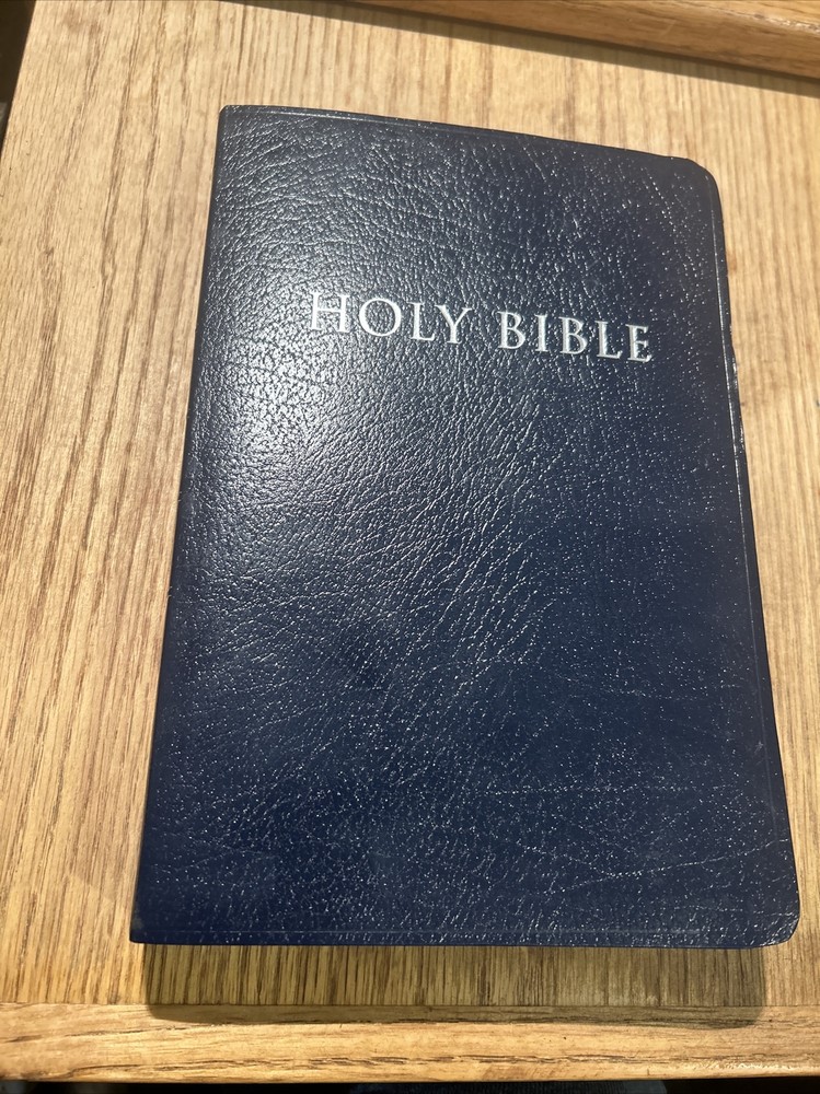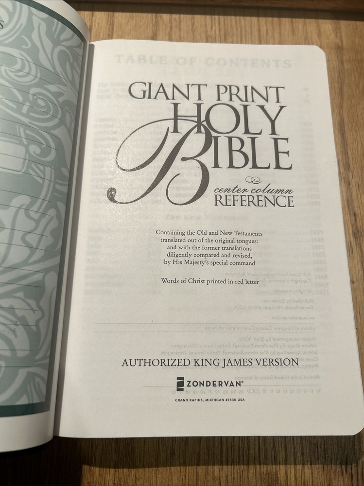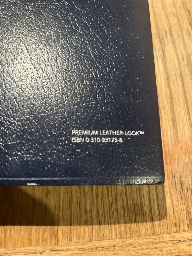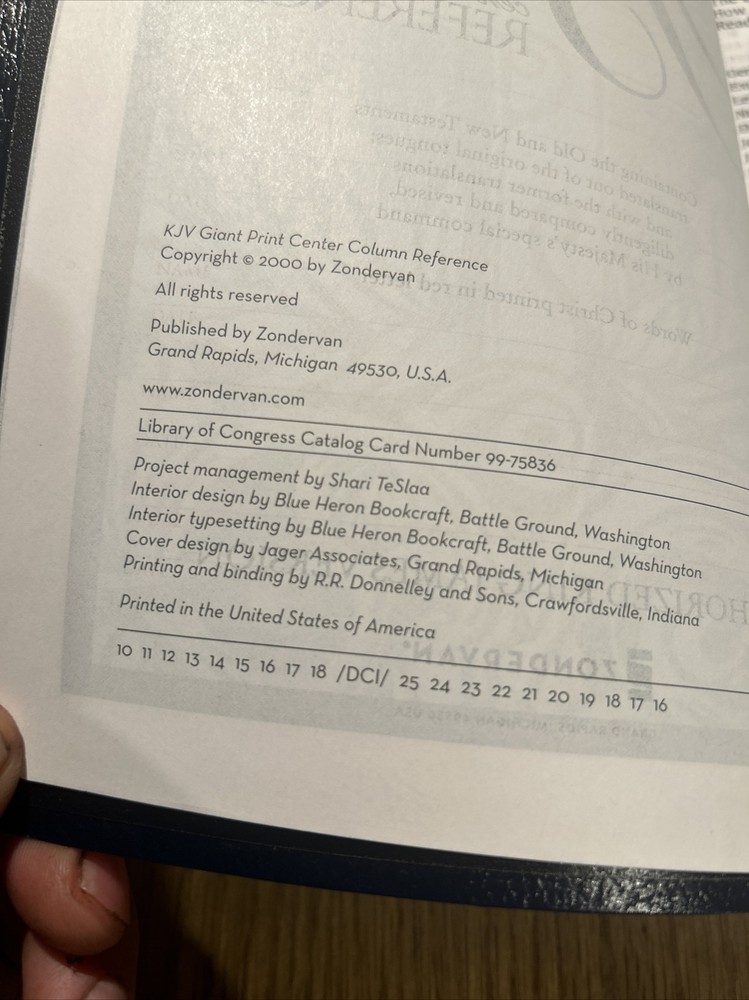 For your careful consideration here is a nice clean copy of the King James Reference Bible by Zondervan Staff (C. 2004) bound in navy blue 'Premium Leather Look' Imitation Leather. It is a 'Giant Print' edition with a 12 point type face. It is a Red Letter Edition. Cover Measurements: 9.5" H x 6.5" W x 1.3" T ITEM CONDITION NOTES: Excellent pre-owned copy. Clean and unmarked including unused presentation & family record pages. The cover has minimal wear. PLEASE SEE ALL PHOTOS BEFORE BUYING. FREE USPS MEDIA MAIL DELIVERY IS INCLUDED WITH YOUR PURCHASE. UPGRADE TO PRIORITY MAIL (DOMESTIC ONLY) FOR $4.00.