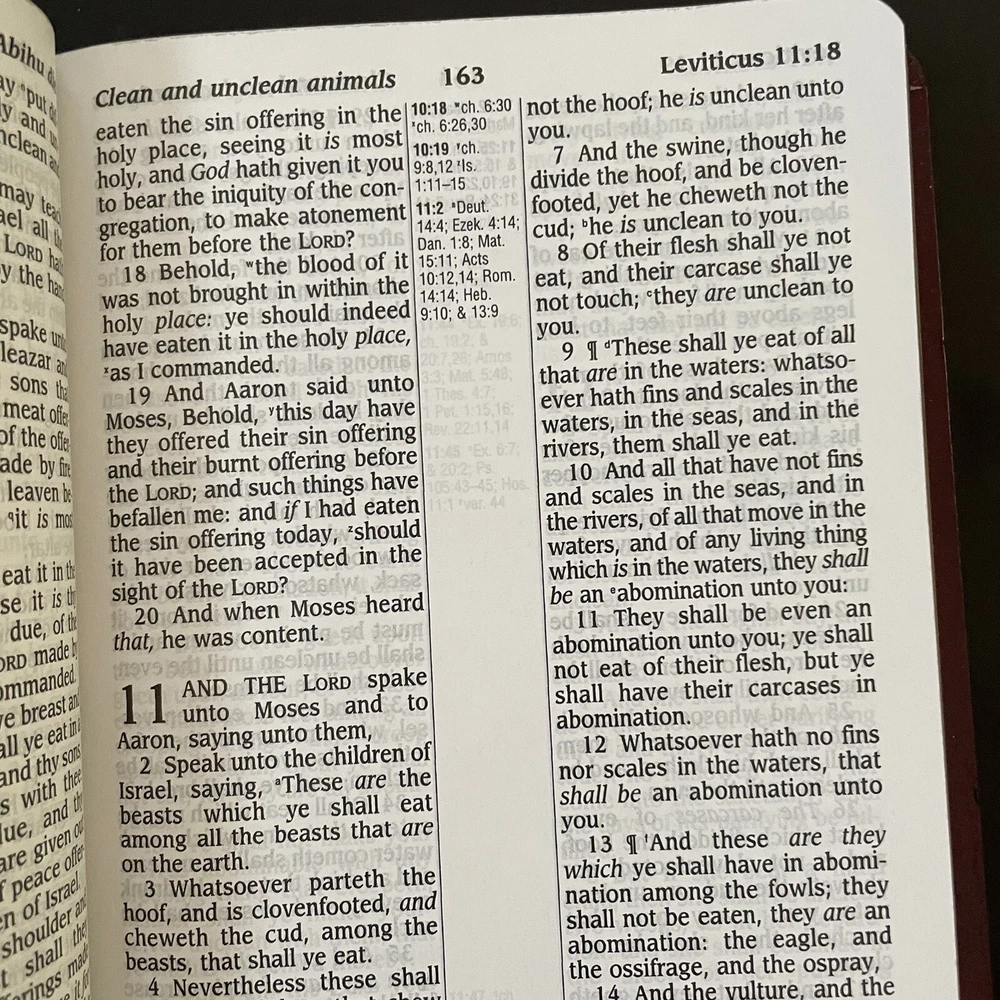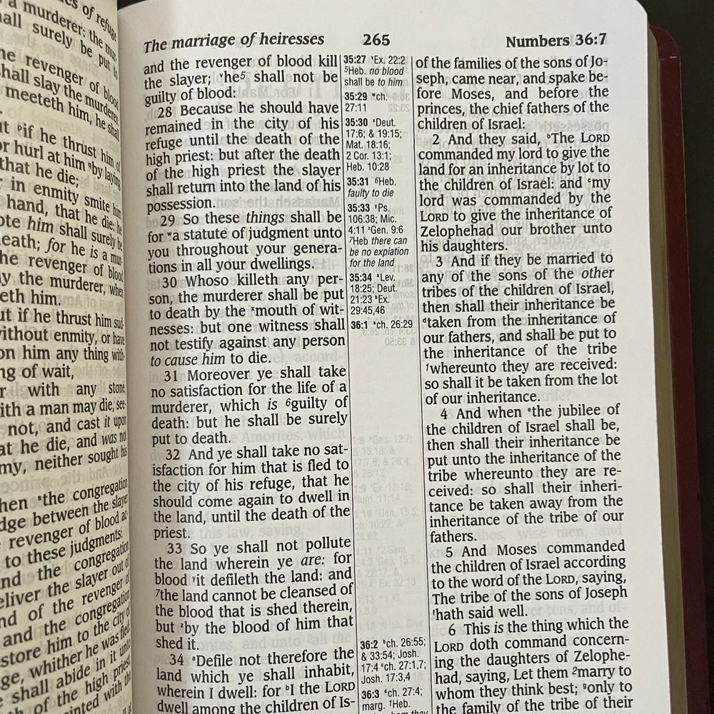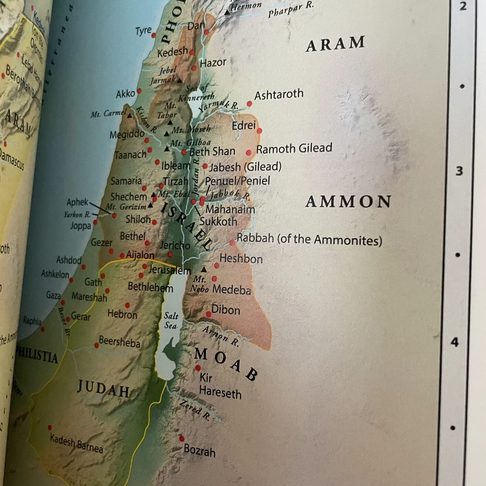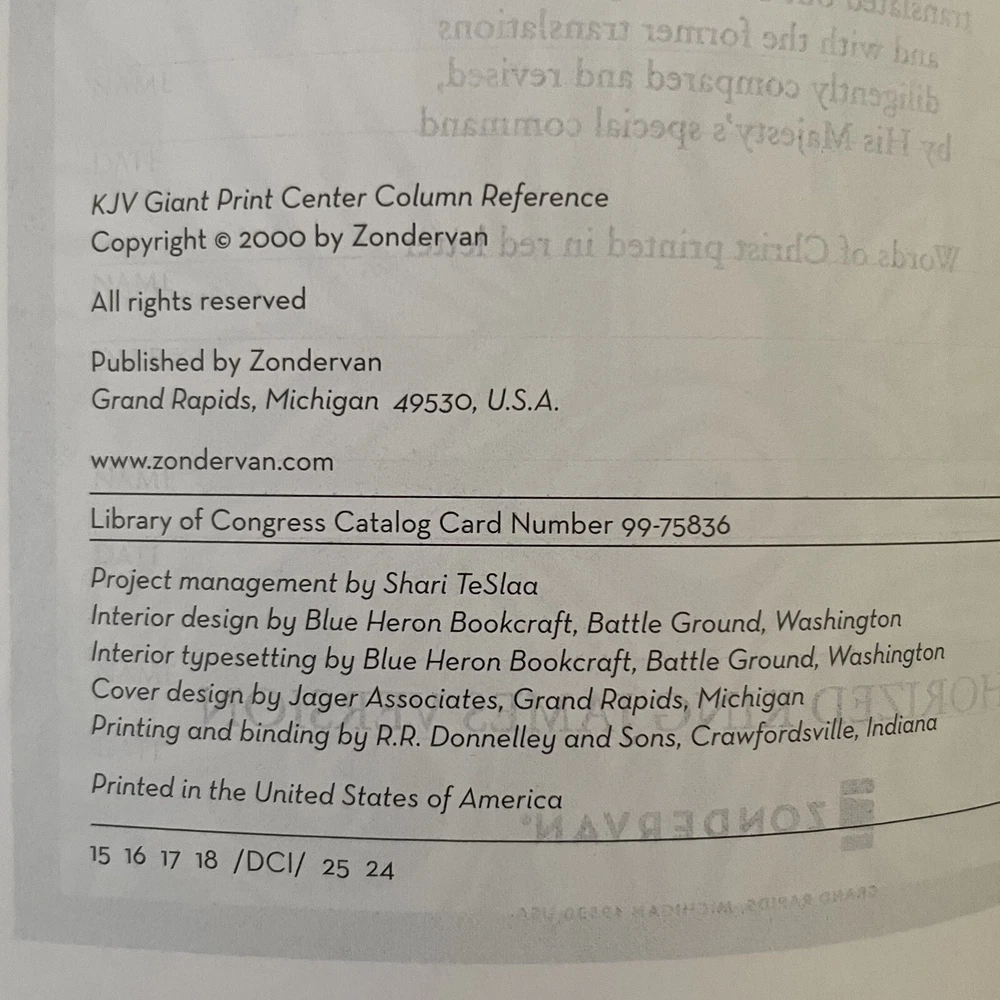 Excellent near new condition of the King James Version of the Bible, published by Zondervan. Large print is easy to read. Lovely color maps in the back. Reference column in the middle for ease of looking up references and explanations. Imitation leather cover. Spine is intact and book has not been used much, if ever. See pics for approximate dimensions.