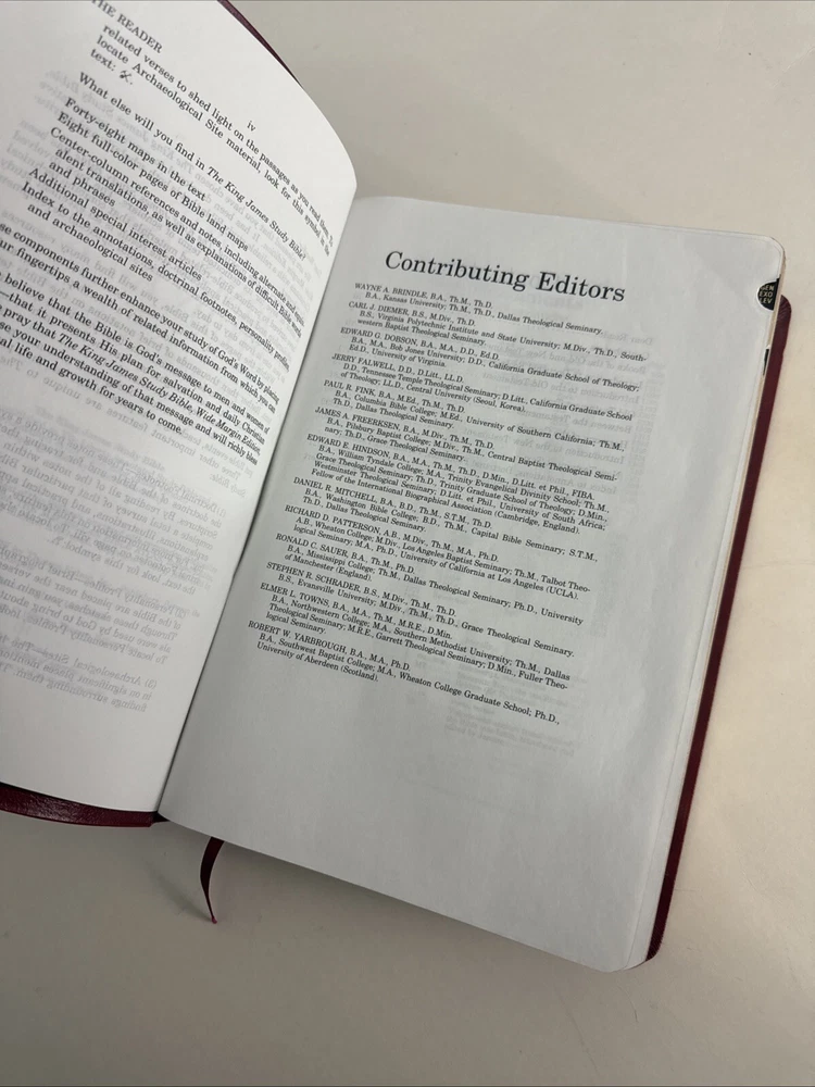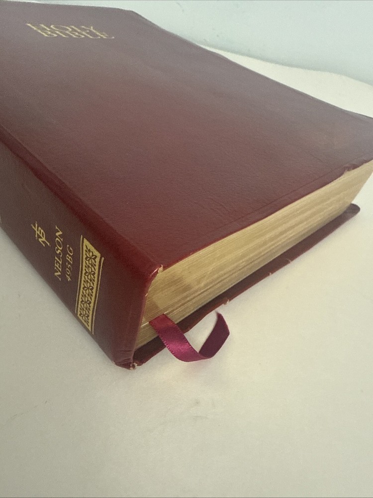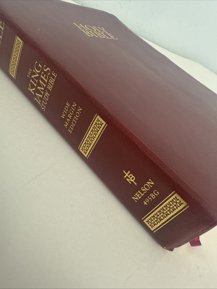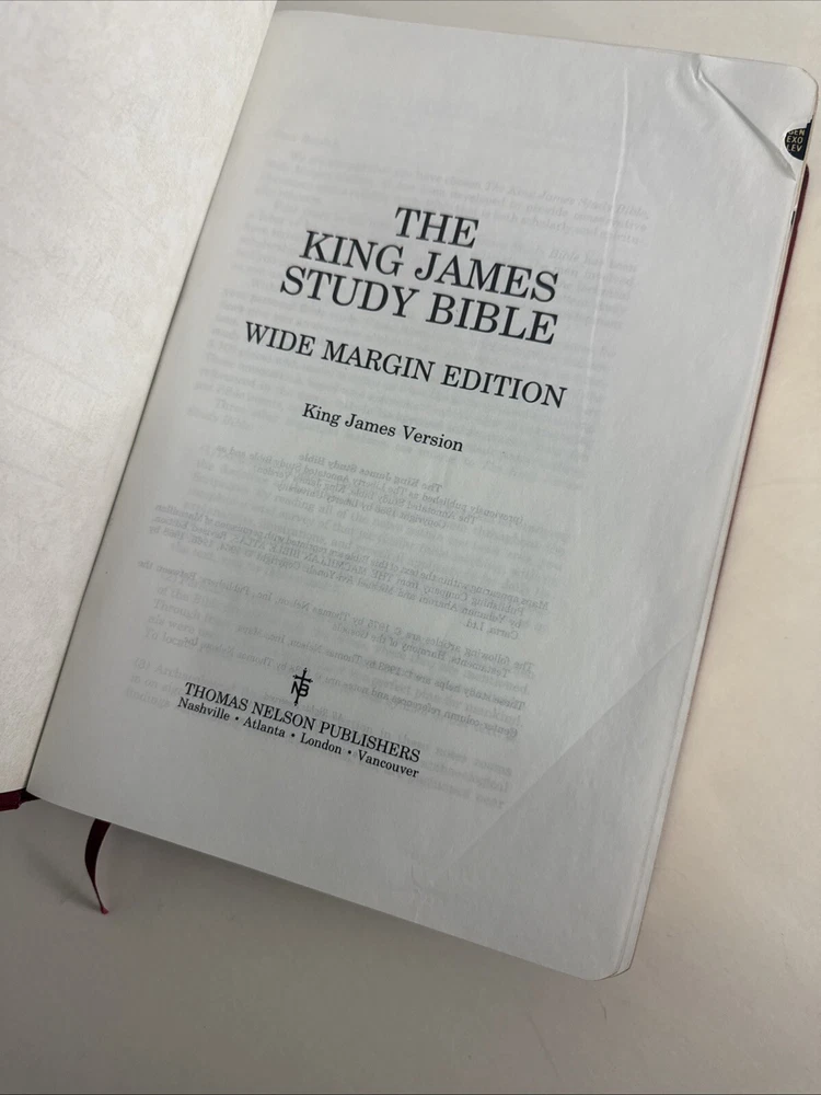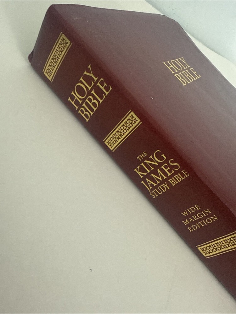 The product is "The King James Study Bible" by Thomas Nelson, published by Nelson Publishing in 1988. It is a Bible in English with a wide margin and maroon leather cover. The Bible is indexed for eas...