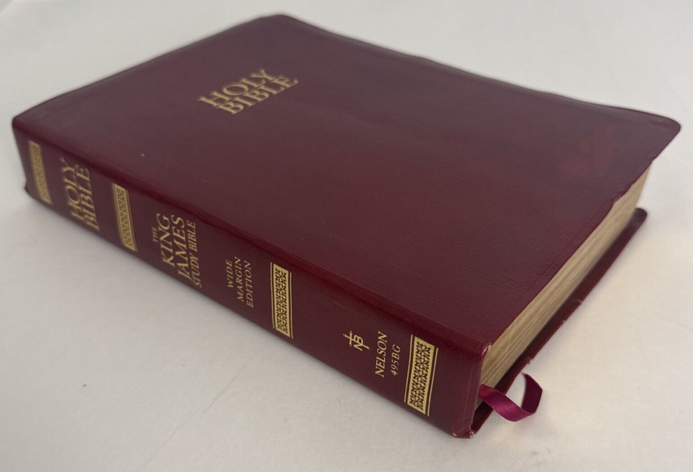 The product is "The King James Study Bible" by Thomas Nelson, published by Nelson Publishing in 1988. It is a Bible in English with a wide margin and maroon leather cover. The Bible is indexed for easy reference and study.