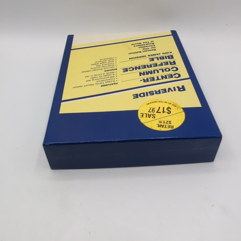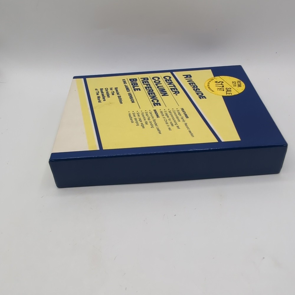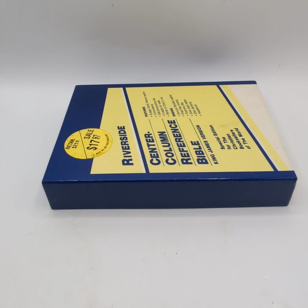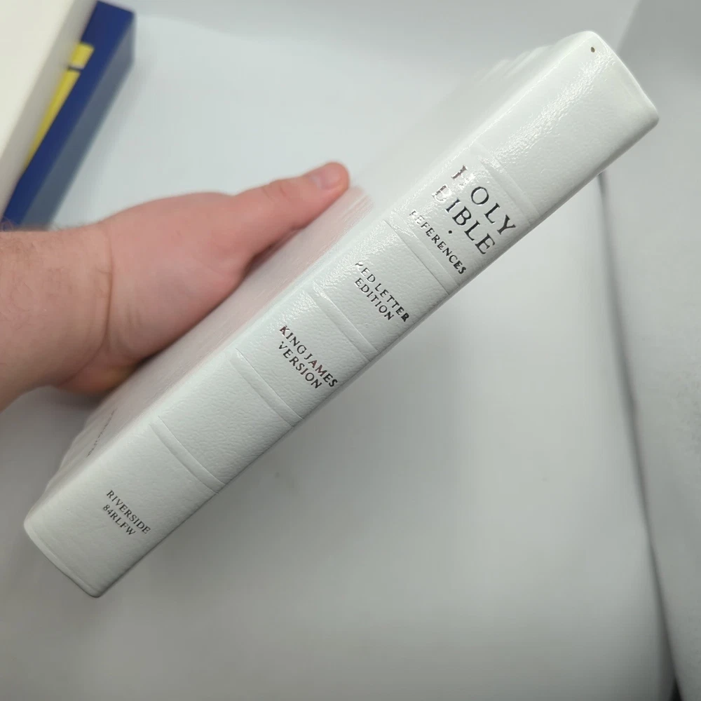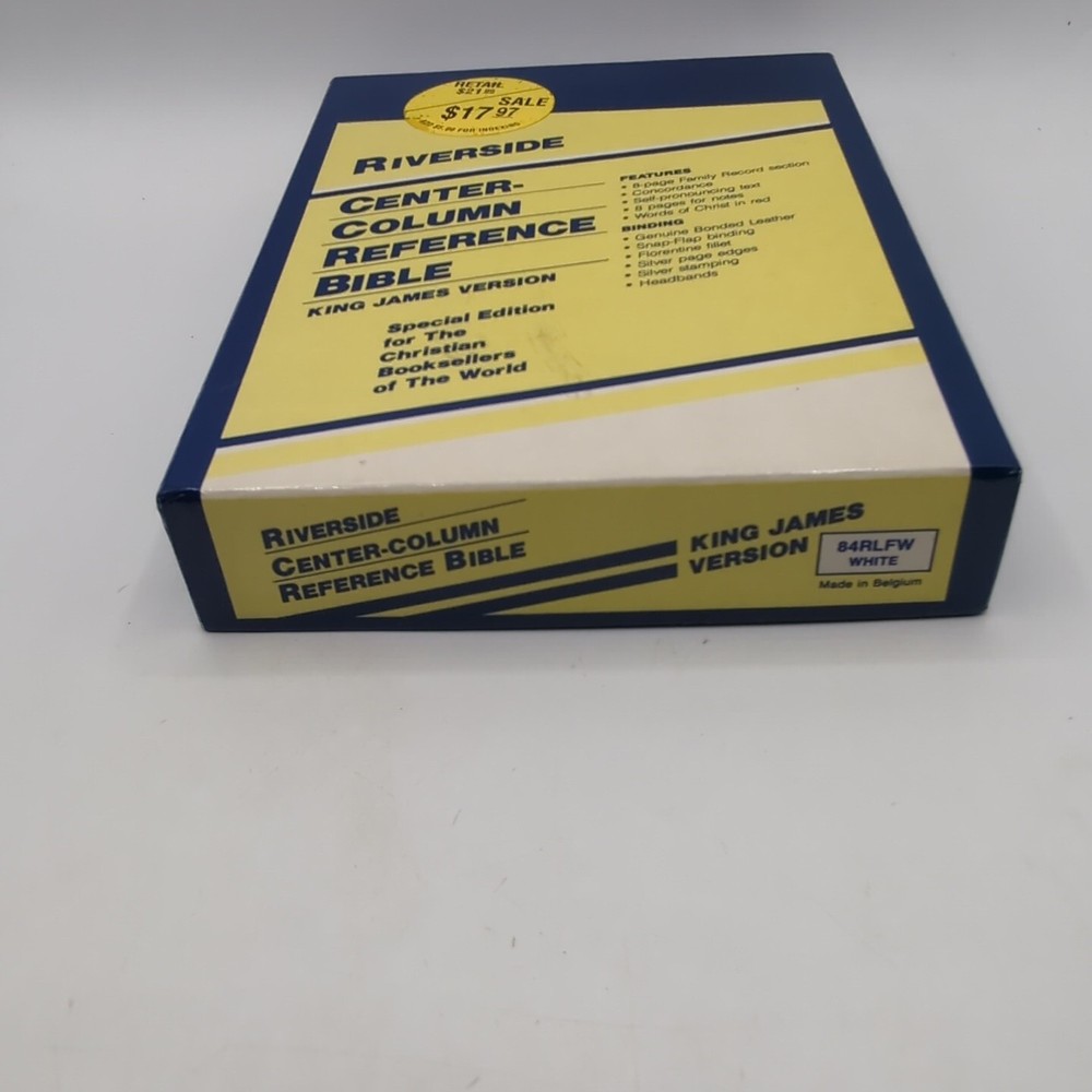 King James Version Holy Bible Center Column Reference~White Leather Snap Flap LN. Really clean bible. Doesn't look used at all. Box has a few marks from storage. Please see photos for condition.
