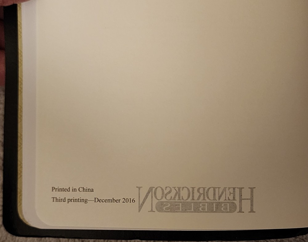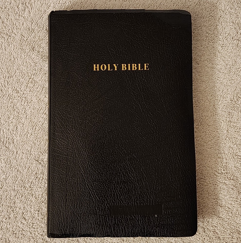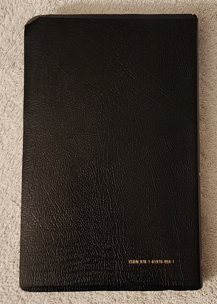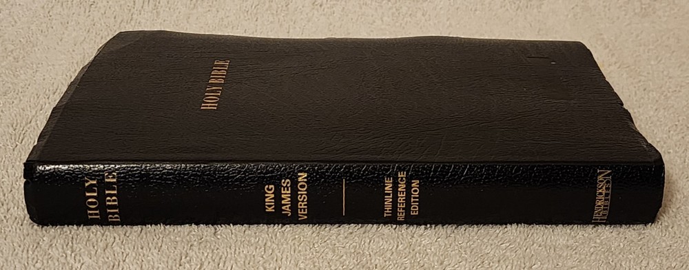 HOLY BIBLE KING JAMES VERSION • THINLINE REFERENCE EDITION • END OF VERSE REFERENCE EDITION • RED LETTER EDITION • CONCORDANCE • BLACK RIBBON MARK / BOOKMARK • MAPS Published by Hendrickson Bible; in its 3rd printing in 2016. Very good gently handled condition; binding solid; covers and all pages intact and in very good condition. Name embossed near bottom of front cover. No marks or writing inside. Simulated leather bound; measures about 5.75" x 9.75.