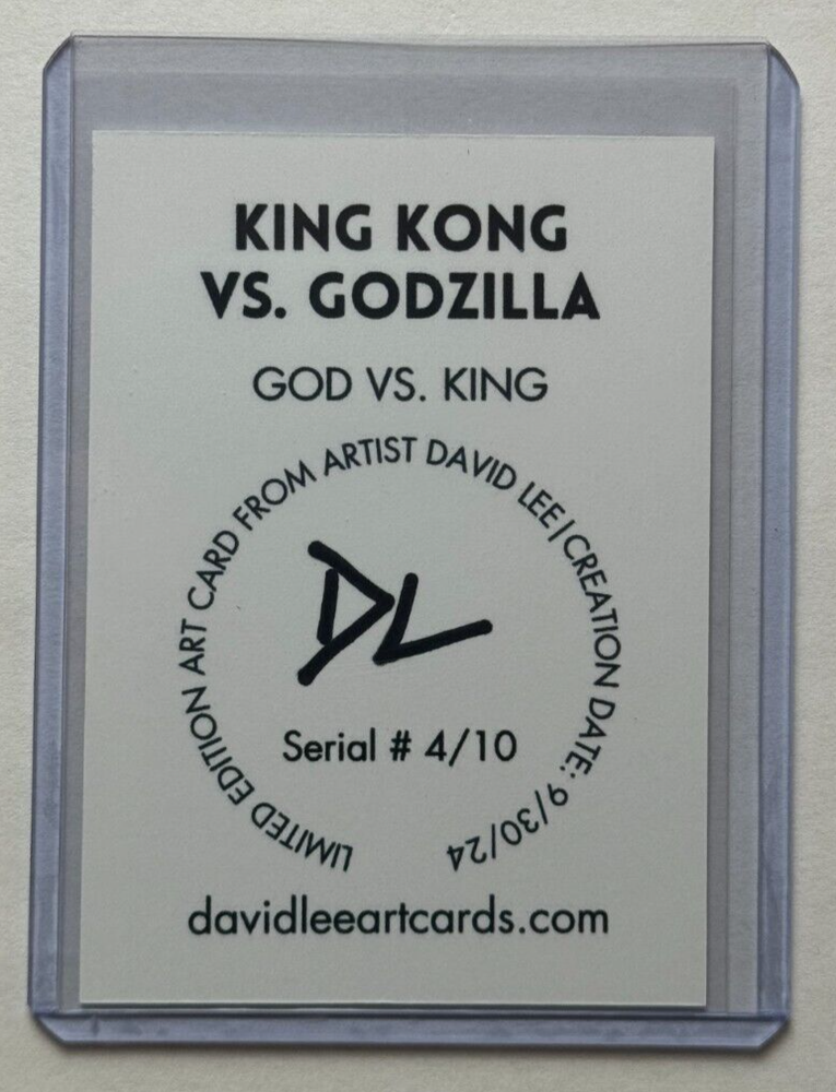 The product is a limited edition non-sport trading card featuring the iconic battle between King Kong and Godzilla, titled "God Vs. King." It is numbered 4 out of 10 and is artist signed by David Lee of David Lee Art Cards. The trading card belongs to the franchise "King Kong Vs. Godzilla" and is a highly collectible item for fans of the classic monster movies. The card showcases artwork related to the film and is a unique and rare piece for enthusiasts of trading card singles and non-sport trading cards.