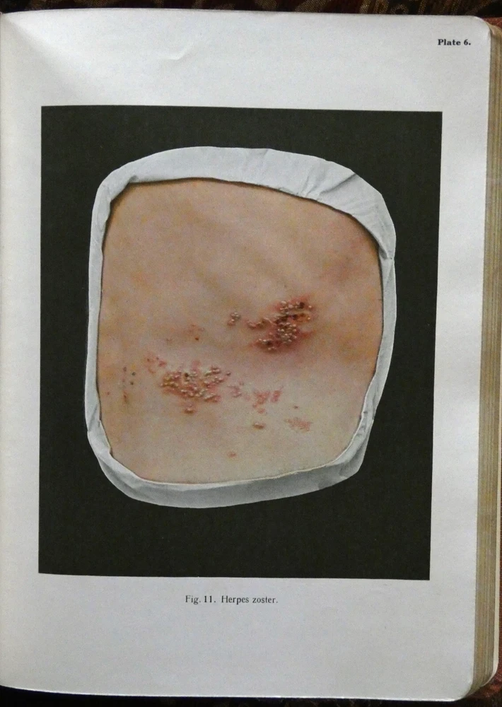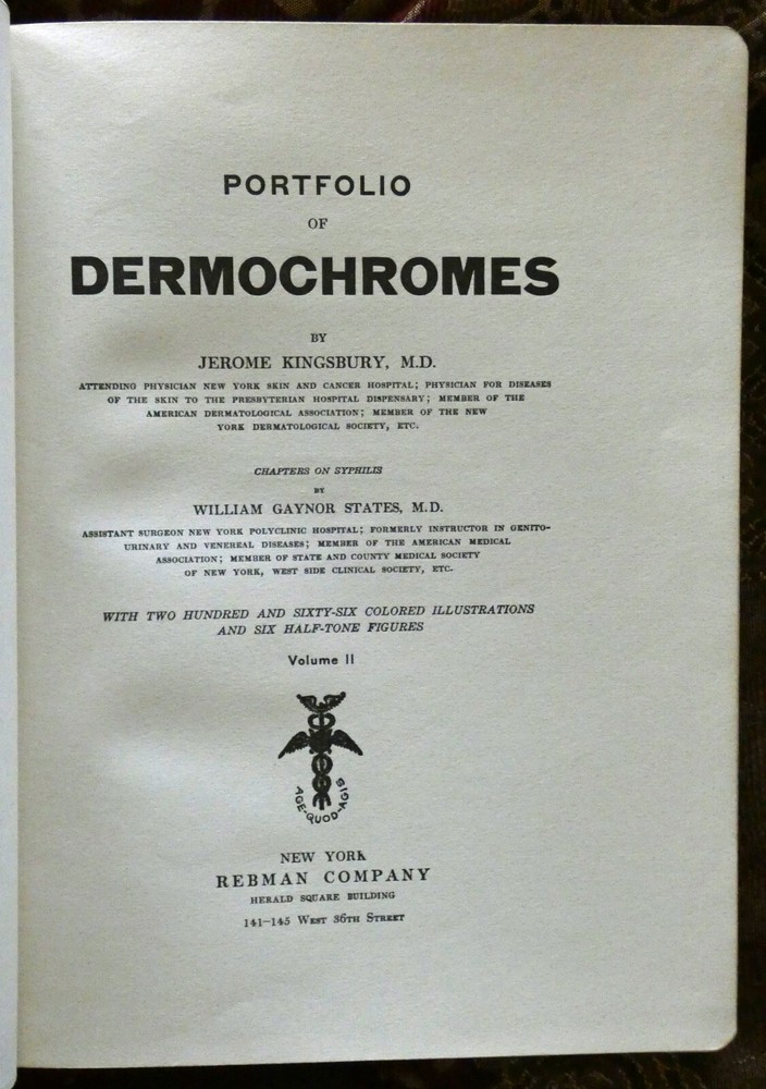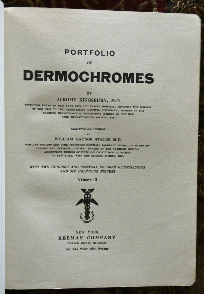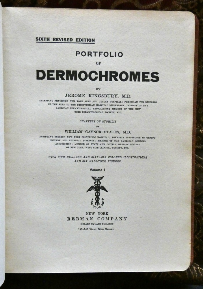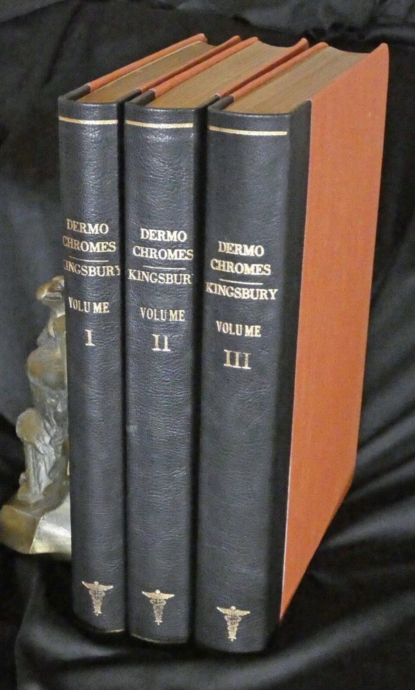 Portfolio of Dermochromes, Kingsbury, 6th edition 1921, in 3 volumes. Large 4to with all edges gilt. Rebound in brown goatskin with cloth boards. 266 plates in stunning lifelike color, 6 black and white plates. These illustrations were produced by Eduard Jacobi of Freiburg and published in 1904 with the revolutionary new "citochrome" process, allowing color quality never before possible. More plates were added in later editions like this one. These were widely distributed, and are still commonly available. However, the original leather bindings were not archival and are now usually found in very shabby condition. If you've wanted a handsome and sturdy copy of these illustrations, which are, in spite of the subjects, actually very beautiful, here is your chance.