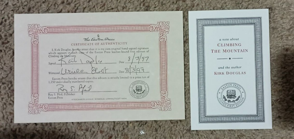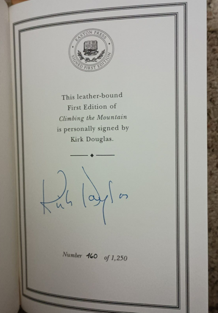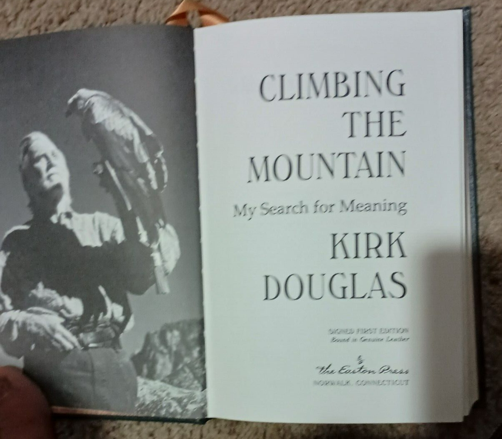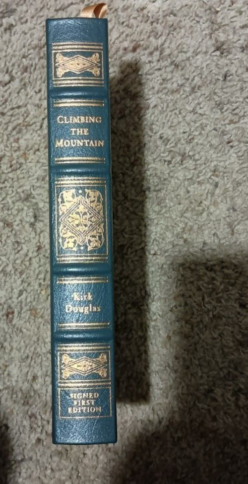The product is a first edition signed leather book titled "Kirk Douglas Climbing The Mountain" published by Easton Press in 1997. It is a biography written by Kirk Douglas himself, making it a valuable collectible for fans of the author or those interested in biographies and autobiographies. The limited edition nature of the book, with a COA number of 460/1250, adds to its exclusivity and appeal to collectors of rare and unique books. The fact that it is an original copy printed in the United States further enhances its value and significance in the world of antiquarian literature. Spot on 2nd picture is just a reflection from the lighting.