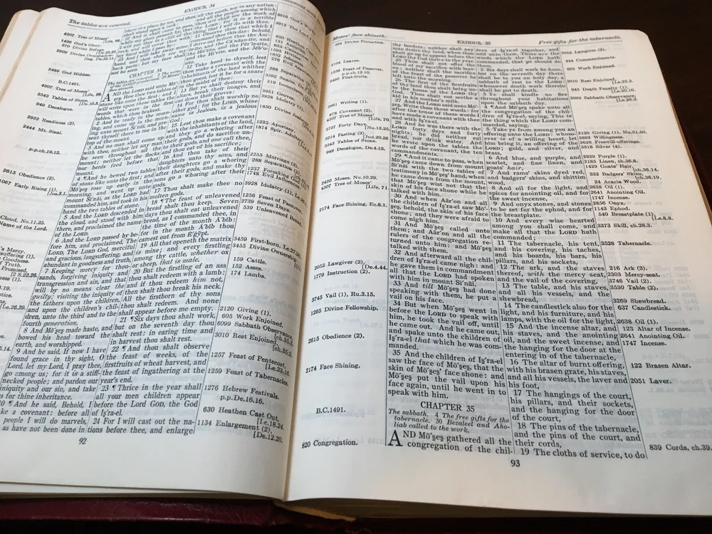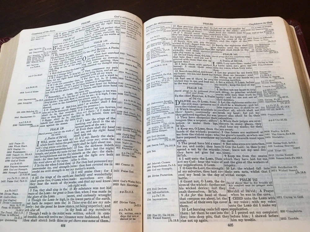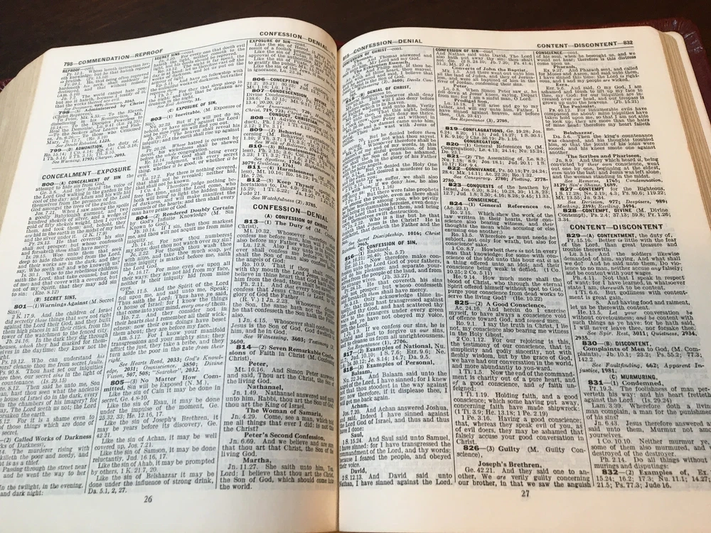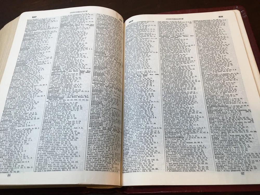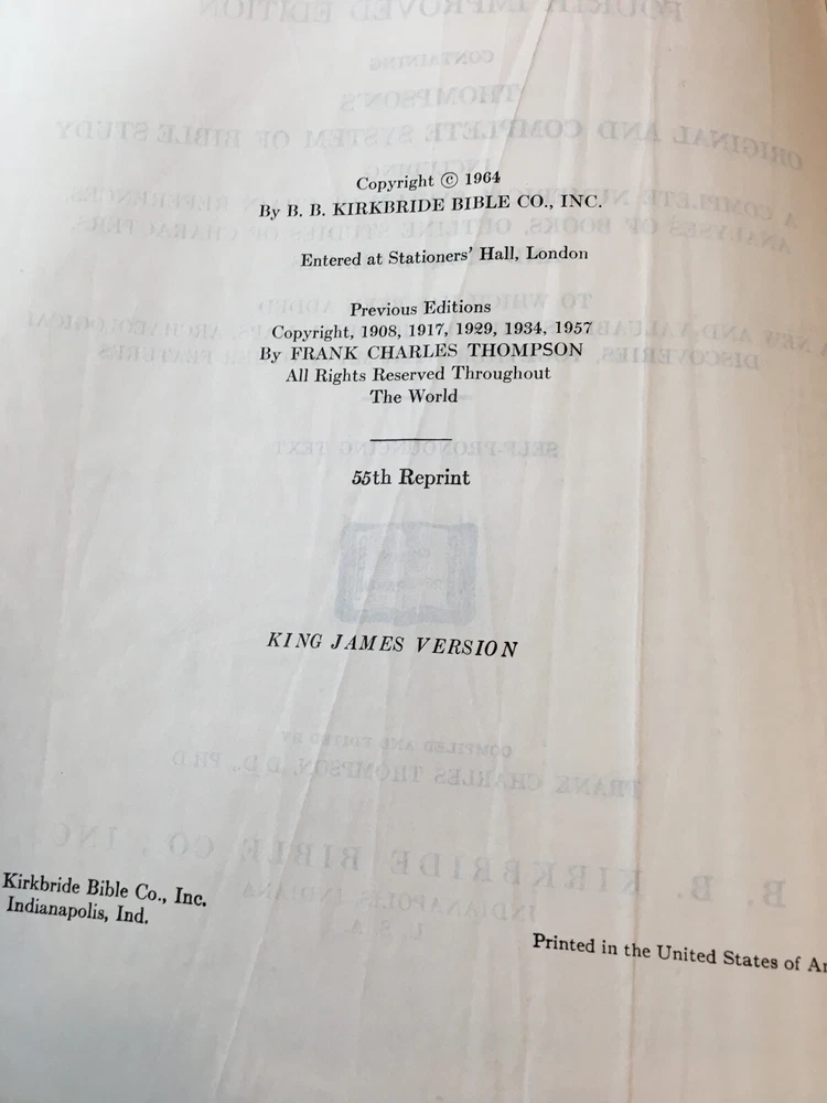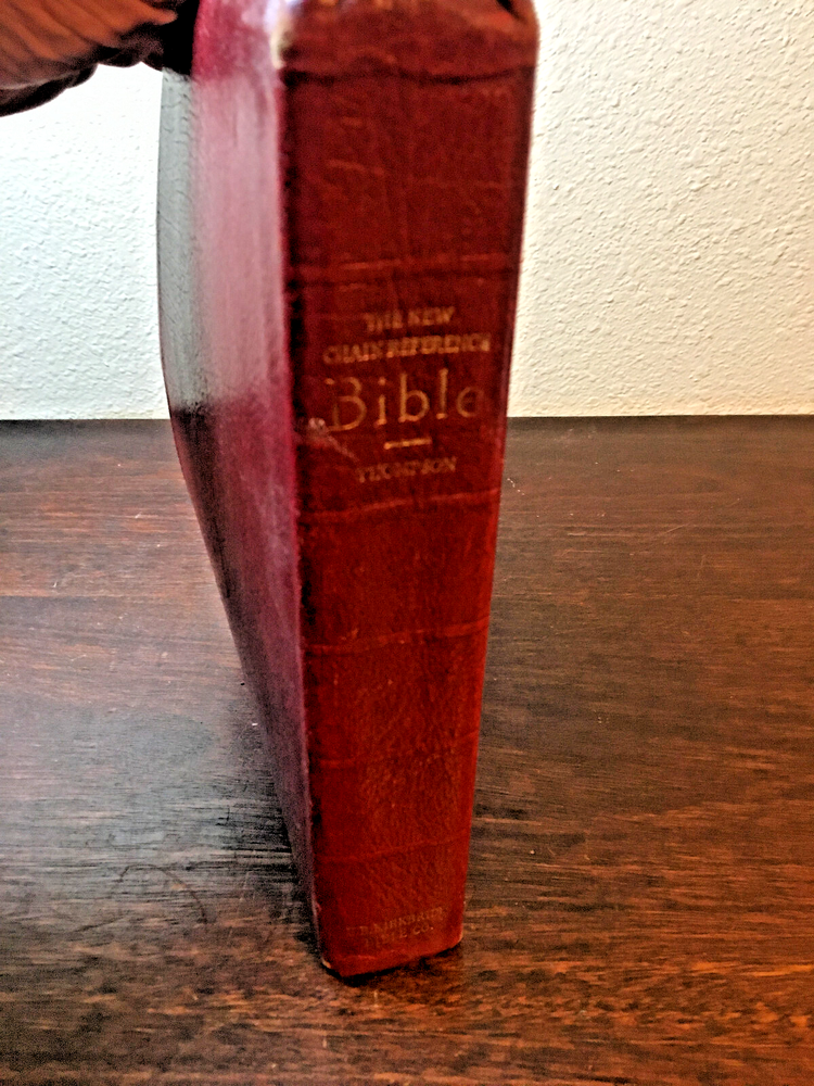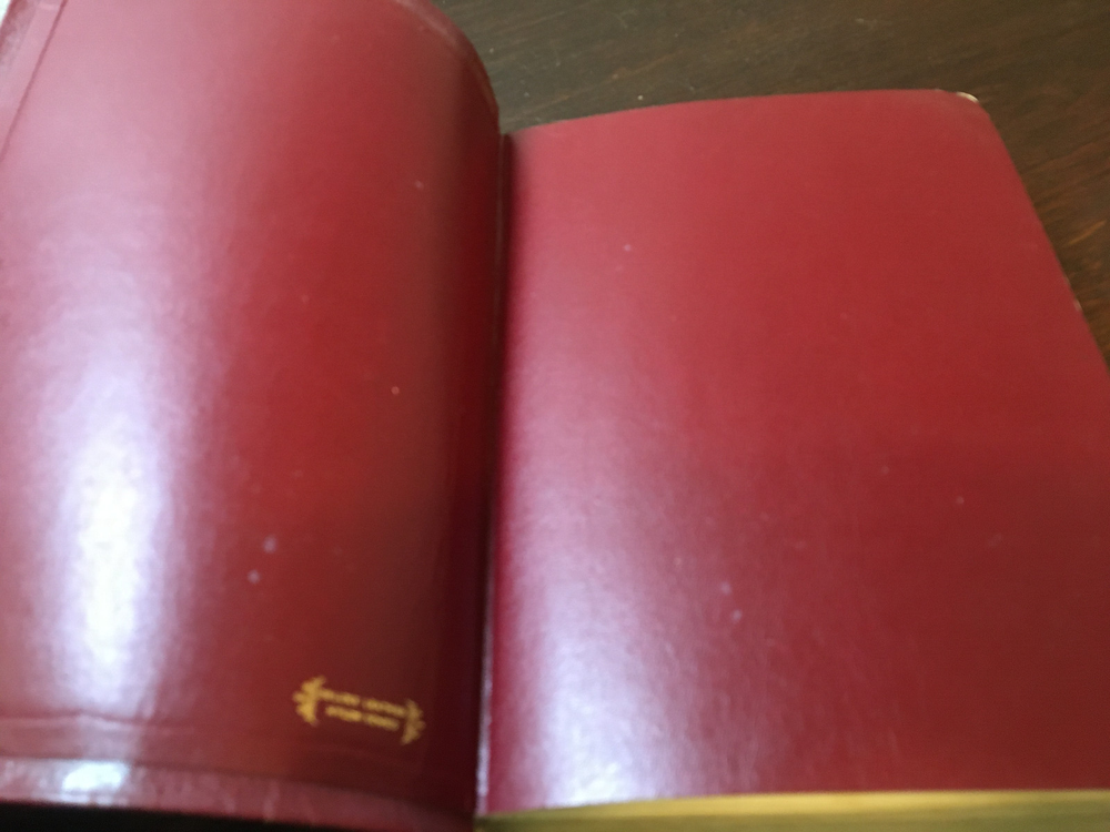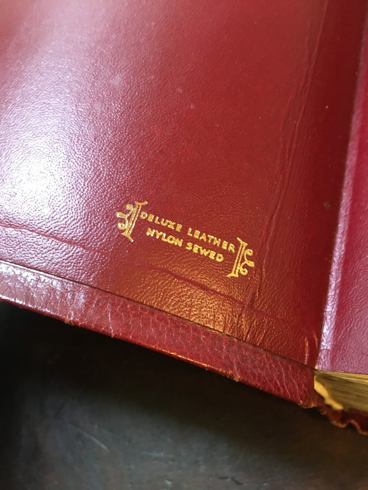 The Bible is fairly well used but not abused. The only mark I found is that 1980 date near the front. Some of the pages have some bit of wrinkling, not bad. Leather bound sewed as indicated. The previous owner name on the front cover has been scratched out. Bit of wear on the corners and edges. Leather is very flexible. Sewn in ribbon marker. Spine titles are kind of worn.
