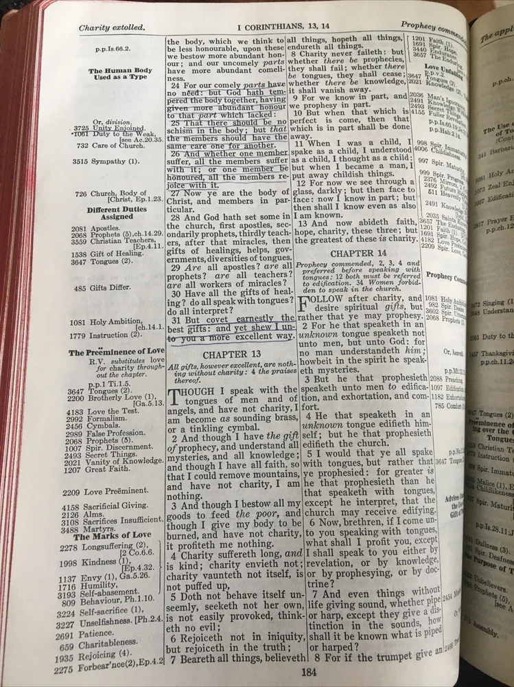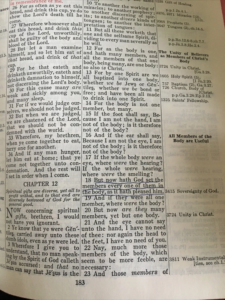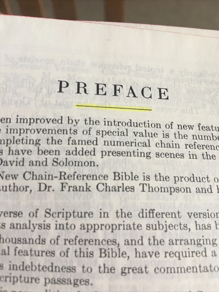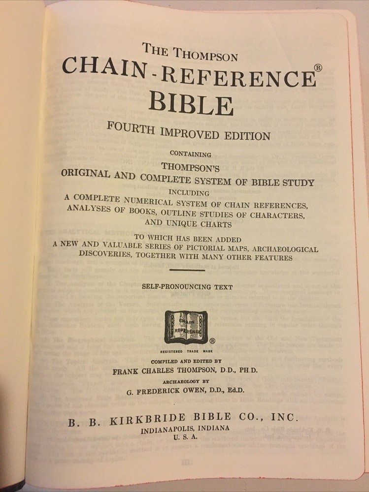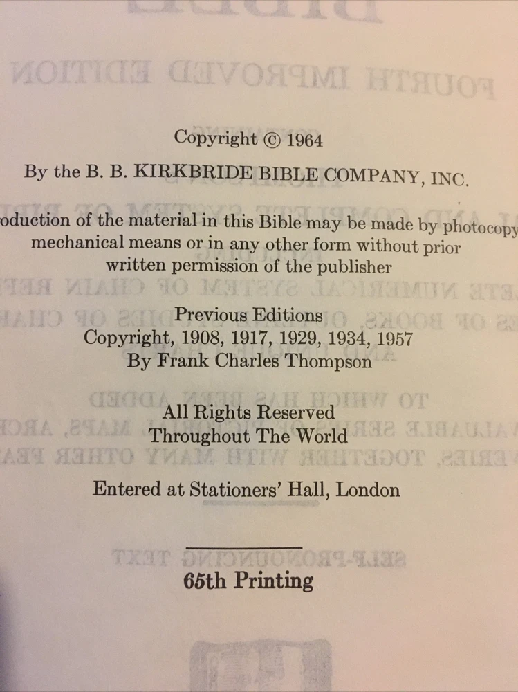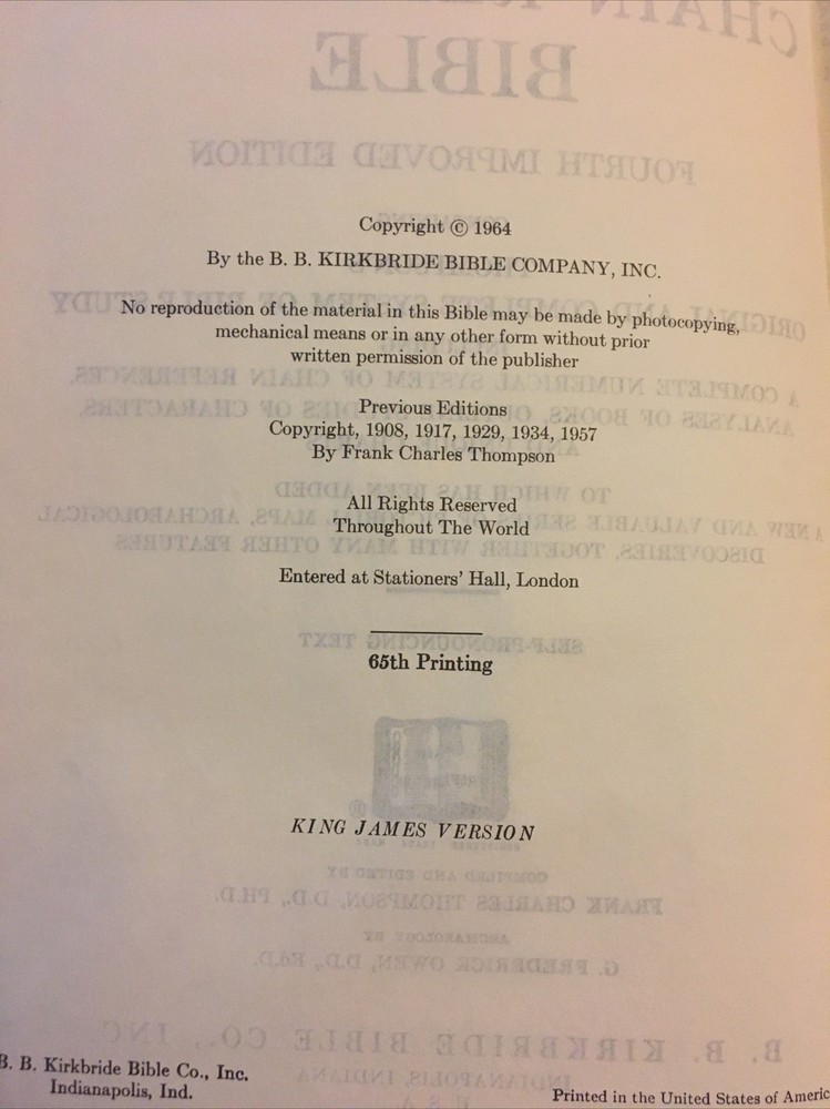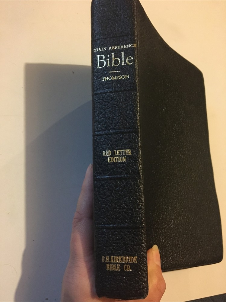 Up for grabs... B. B. Kirkbride Nelson Chain Reference Bible in black leather. This was published in 1964. It has very light wear on the outside. I flipped through each page and noticed 3 instances of underlining in the Bible and one spot of highlighting. I have included photos of each instance. A few pages in Matthew have some water wrinkling. It does have some light spotting on the top of the Bible. This item will come to you via USPS Media Mail from a smoke free home. Happy Shopping!