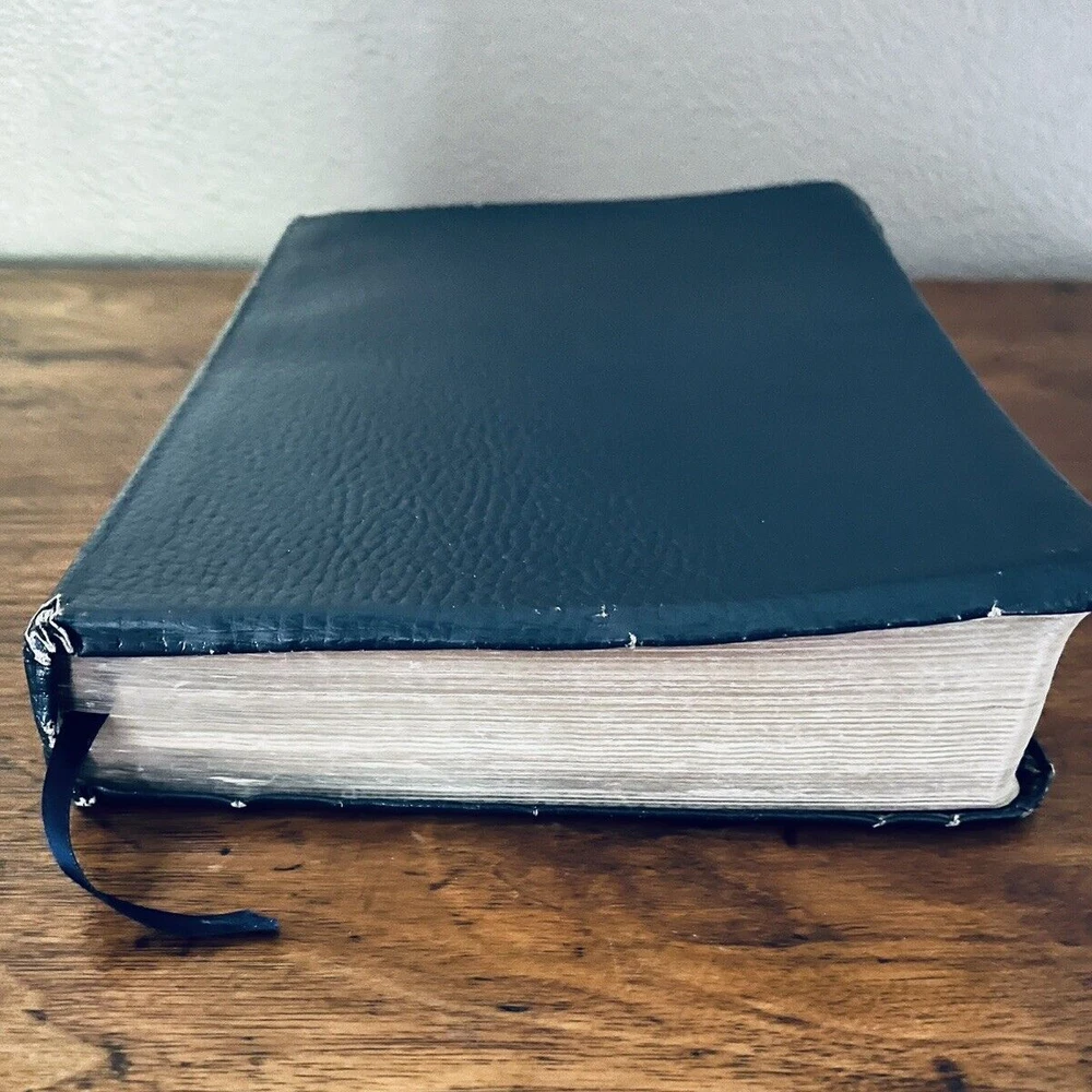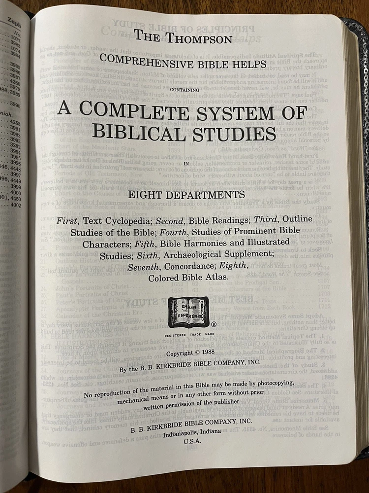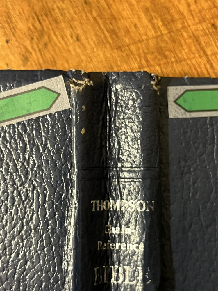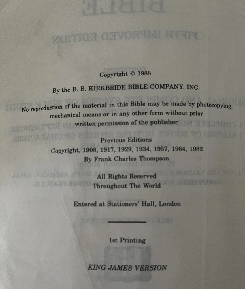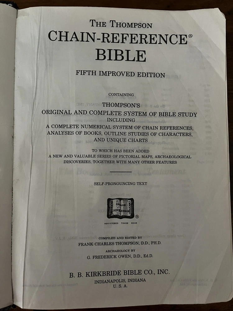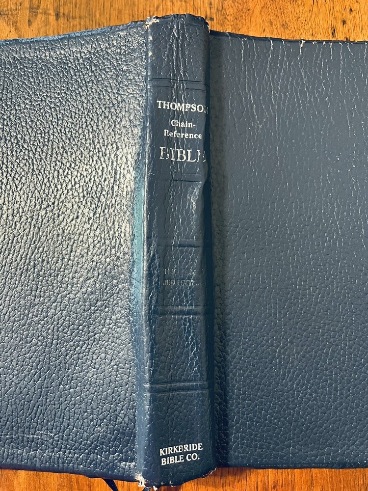 The Thompson Chain-Reference Bible King James Version Fifth Improved Edition Navy blue leather cover Thompson's original and complete system of Bible study Includes a complete numerical system of chain references, analyses of books, outline studies of characters, and unique charts Also maps, archaeological discoveries and other features Self pronouncing text Copyright 1988 1st printing B. B. Kirkbride Bible Co.