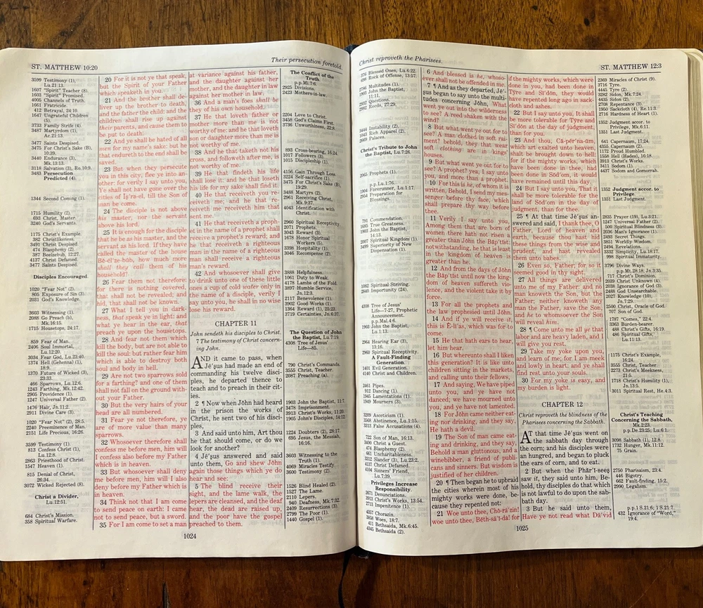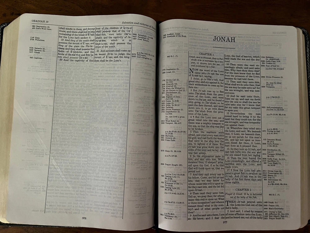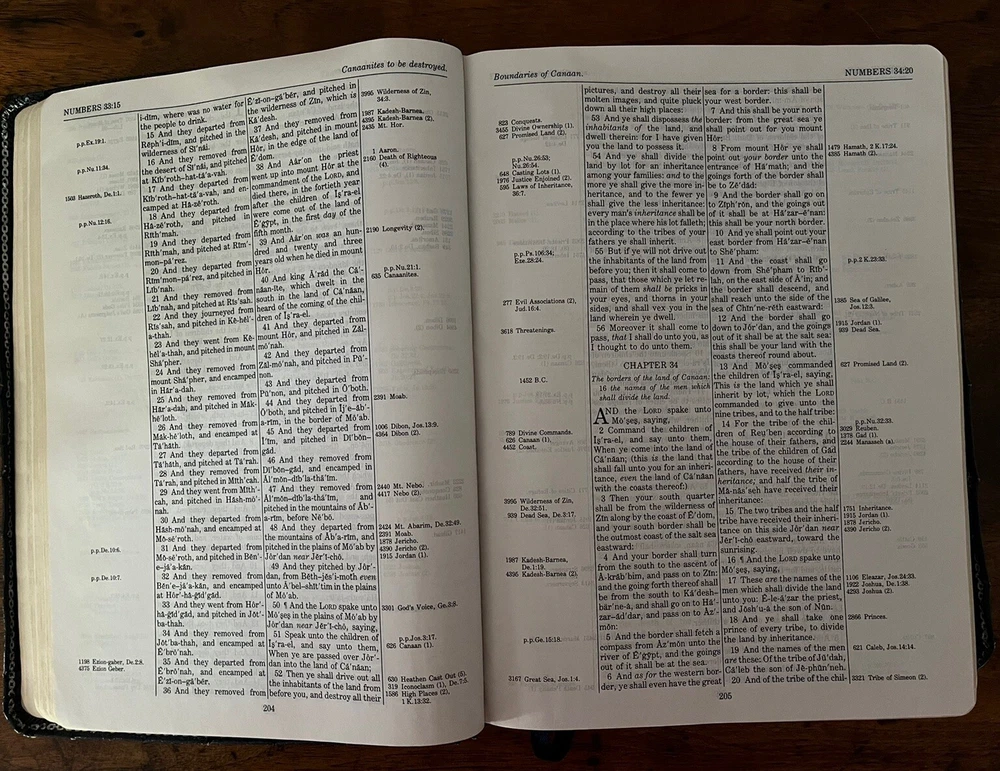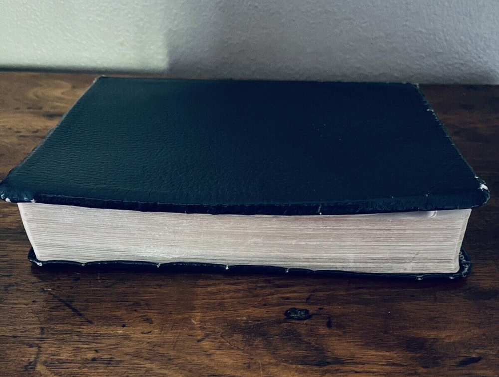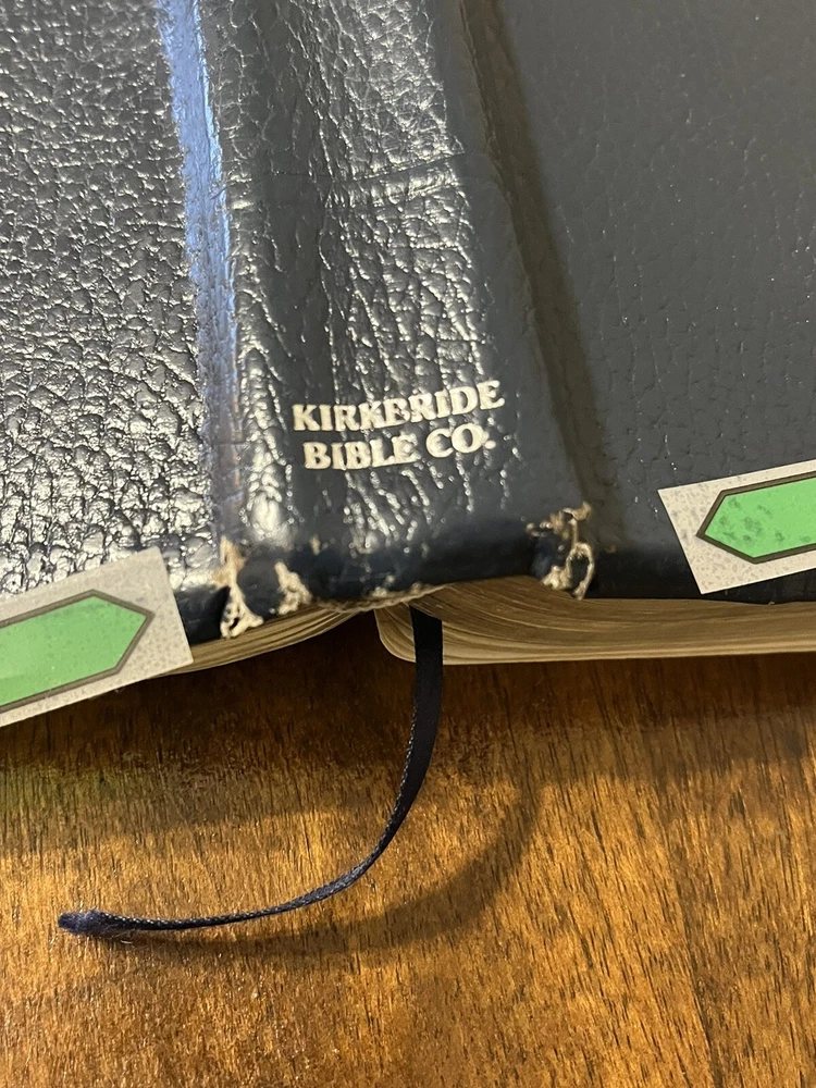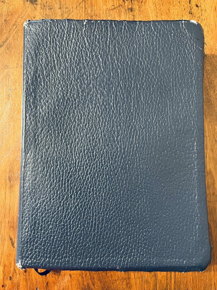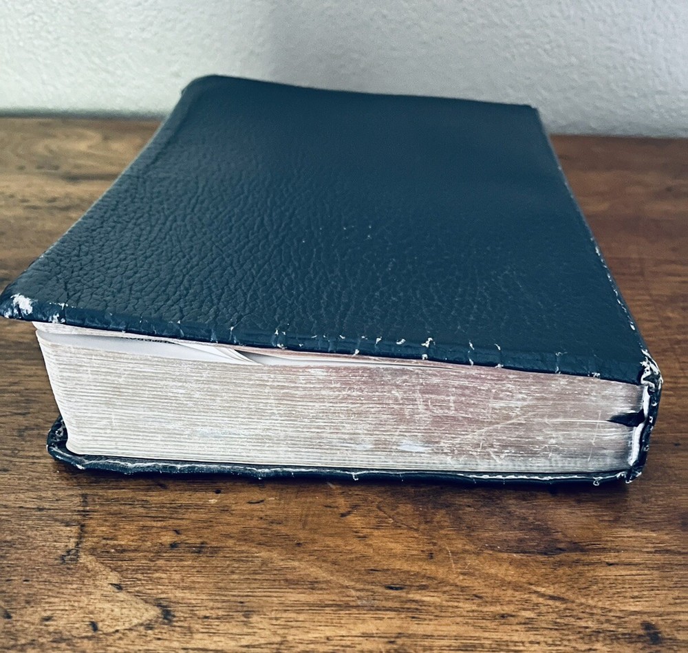 The Thompson Chain-Reference Bible King James Version Fifth Improved Edition Navy blue leather cover Thompson's original and complete system of Bible study Includes a complete numerical system of chain references, analyses of books, outline studies of characters, and unique charts Also maps, archaeological discoveries and other features Self pronouncing text Copyright 1988 1st printing B. B. Kirkbride Bible Co.