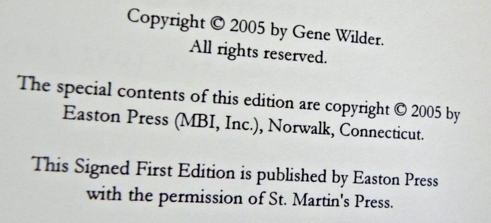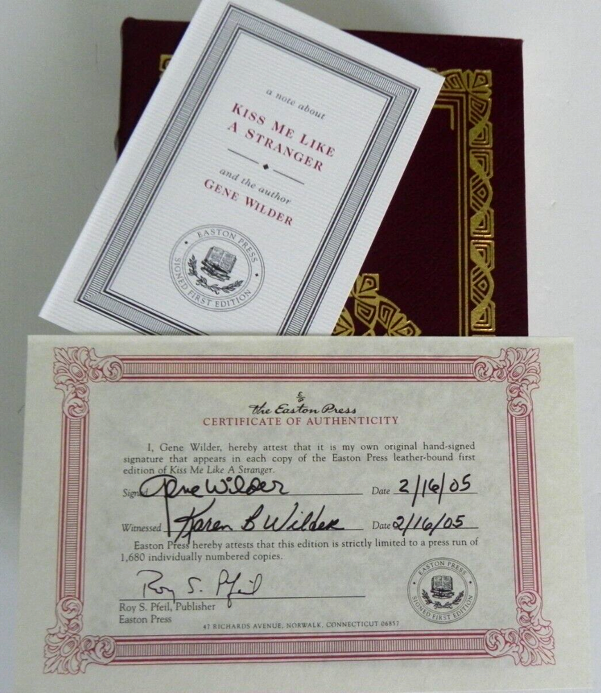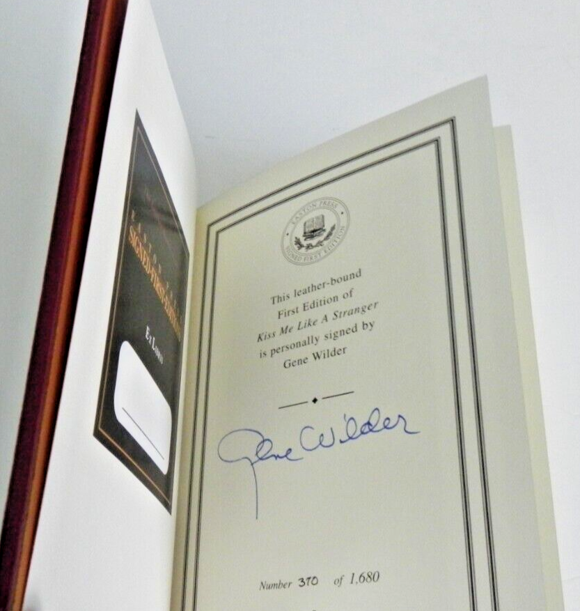 Kiss Me Like A Stranger by Gene Wilder Easton Press SIGNED by Gene Wilder COA also SIGNED by Gene Wilder Easton Limited Edition Publisher's Note Card Inc Moiré endpapers Genuine Leather Gilt edges on 3 sides Raised bands on spine Ribbon bookmark Please see pictures for more information and detail *****This volume is in very good to excellent condition. There are a few small scratches on gilt edges. There is a blank Easton Press Sign First Edition Bookplate opposite title page by previous owner. This volume has the appearance of never been opened or read. Bookends not included. Please see pictures for more information and detail. Very Nice!! Please feel free to contact me with any questions you might have. I will be glad to take additional pictures. I tried to describe the book through words and pictures the best I can but if you are not 100% satisfied with the purchase, please know you can return the book for full refund. Ships carefully wrapped in bubble wrap and packed securely in a box. Will ship within 1 business day of receiving payment. Thank you for looking! <meta name="viewport" content="width=device-width, initial-scale=1">