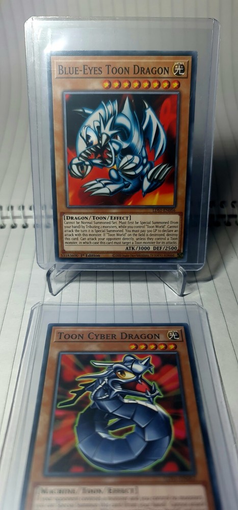 Cards Sleeved and Toploaded! Ungraded! Cards: • Blue-Eyes Toon Dragon 1st Edition LDS1-EN056 • Toon Cyber Dragon 1st Edition LDS1-EN062 Unleash the power of nostalgia with the Konami Yugioh TCG, featuring the iconic duo of "Blue-Eyes Toon Dragon" and "Toon Cyber Dragon" in their much-coveted 1st Edition release. These cards from the Legendary Duelists set are a must-have for both seasoned collectors and players looking to elevate their game with a touch of classic flare. Craft your deck with these common rarity Toon cards that showcase the beloved characters from the Yu-Gi-Oh! TCG universe. Whether you’re seeking to enhance your gameplay or complete your collection, these cards are a timeless addition that promises to bring both strategy and style to your next duel.