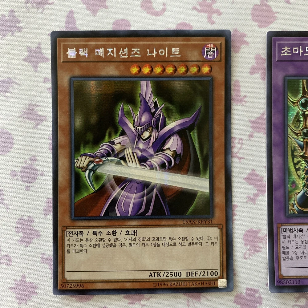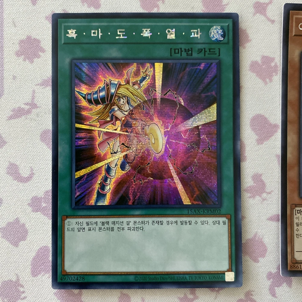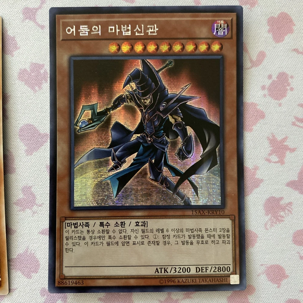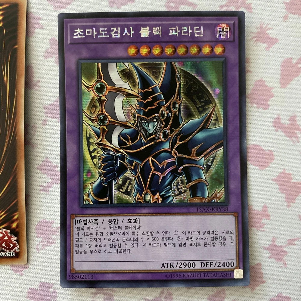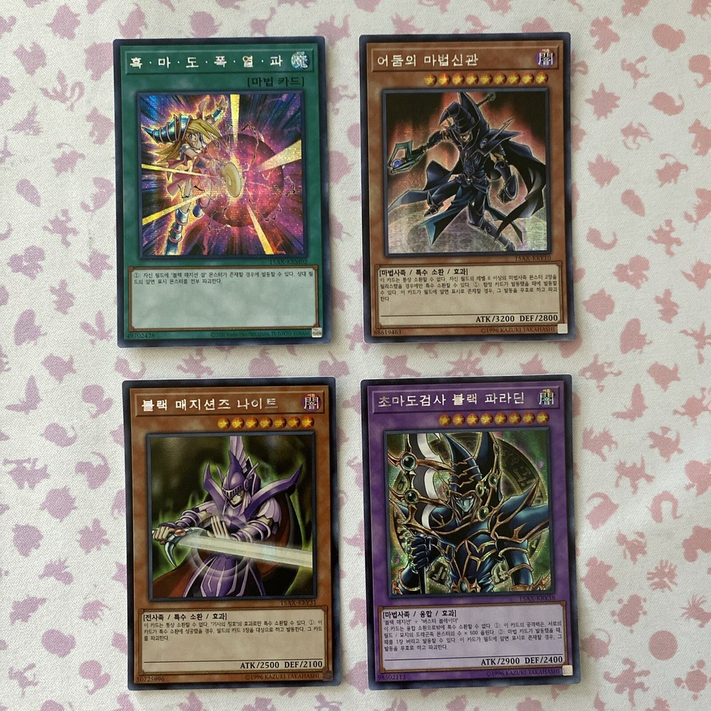 Korean Yu-Gi-Oh! TCG 4 Card Lot Secret Rares 15AX Set Shipped with USPS eBay Standard Envelope Dark Burning Attack 15AX-KRM02 Card is in Near Mint condition Very light edge wear on the face and back of the card No shuffle marks on the face or back of the card Corners are crisp When looking at the face of the card, centering is slightly thicker on the bottom border than the top Sorcerer of Dark Magic 15AX-KRY10 Card is in Near Mint condition There are two perpendicular print lines on the foil The foil itself also has a light bleeding effect to the face of the card Did best to picture Very light shuffle marks on the face and back of the card Light edge wear on the face and back of the card Corners are crisp When looking at the face of the card, centering is slightly thicker on the left side border than the right Dark Magician Knight 15AX-KRY31 Card is in Lightly Played condition There is a light bend close to the top right corner when looking at the face of the card Did best to picture it has a lighter effect on the back Very light shuffle marks on the face and back of the card Very light edge wear on the back of the card Corners are crisp When looking at the face of the card, centering is thicker on the top border than the bottom Dark Paladin 15AX-KRY38 Card is in Near Mint condition Very light shuffle marks on the face and the back of the card Very light edge wear on the back of the card Corners are crisp When looking at the face of the card, centering is thicker on the bottom border than the top Thanks for the view!!