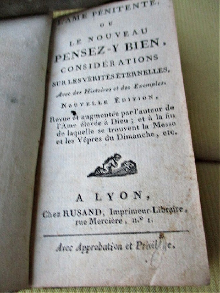 v629. Considerations sur Les Verites Eternelles, Nouvelle Edition, first written 1774, by V.G.Navarre......not date this edition, estimate early 19th century. Cez Rusand, A.Lyon. 5" tall, 207 pages, 1 page of ads. Full leather......corners worn through. Bright gilt spine and clean text in French. Book does not close tight. Good condition. Do not hesitate to e-mail with any questions. As Always, Satisfaction Guaranteed! I expect to receive payment within 10 days, unless we have made other arrangements. Shipping will be USPS Media or First Class, depending on weight. If you prefer Priority mail, I will be glad to make the adjustment. I'm glad to combine multiple purchases in order to minimize shipping costs. I WILL SHIP INTERNATIONALLY, and I try to be as economical as possible with the shipping costs. RETURN POLICY: Satisfaction Guaranteed! Track Page Views With Auctiva's FREE Counter