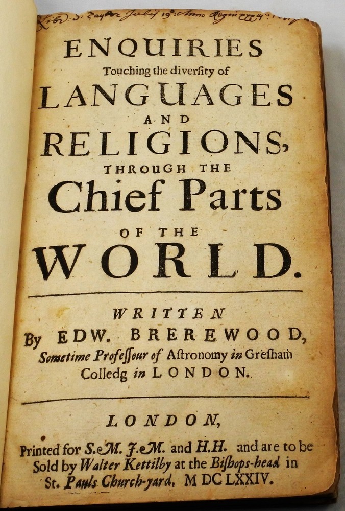 LANGUAGES AND RELIGIONS THROUGH THE CHIEF PARTS OF THE WORLD Written by Edw. Brerewood. 1674 London with 252 pages and table of contents. Original full leather hard cover binding is rebacked. Text is clean, tight and in good condition. Book measures 4 1/2 " x 7 "