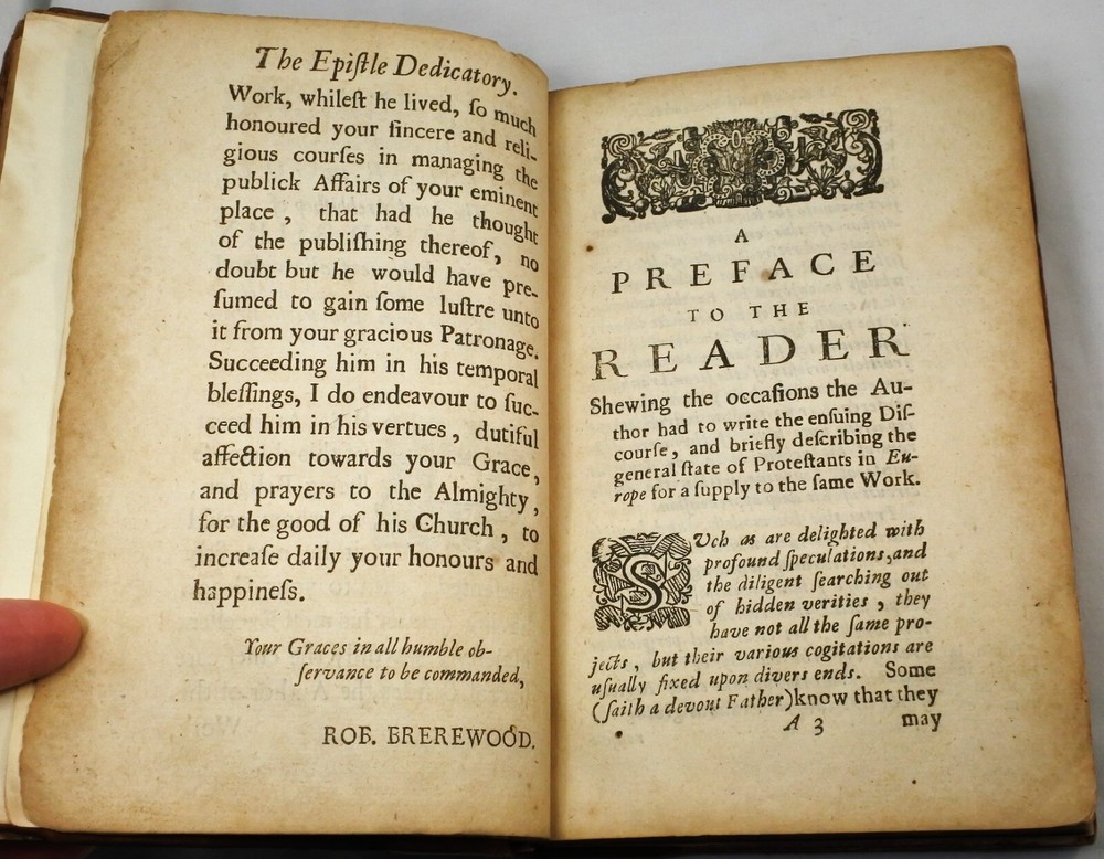 This fascinating 1674 book by Edw. Brerewood explores languages and religions across the world, featuring Latin, Greek, Armenian, and more. The original leather cover has been expertly rebacked, and the text remains clean and tightly bound. A rare and well-preserved historical gem!