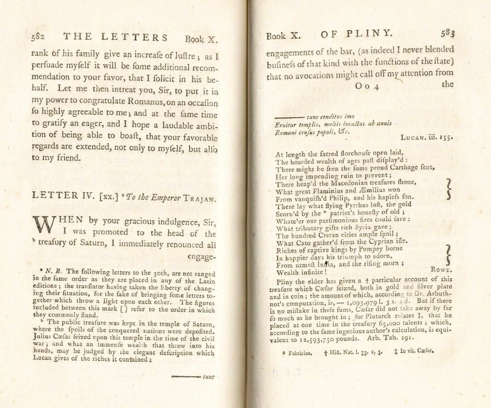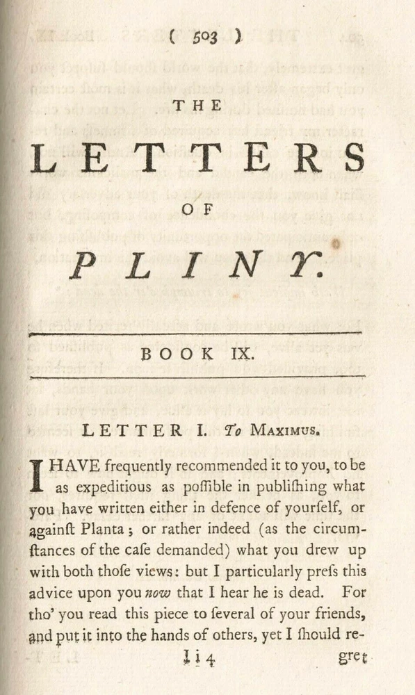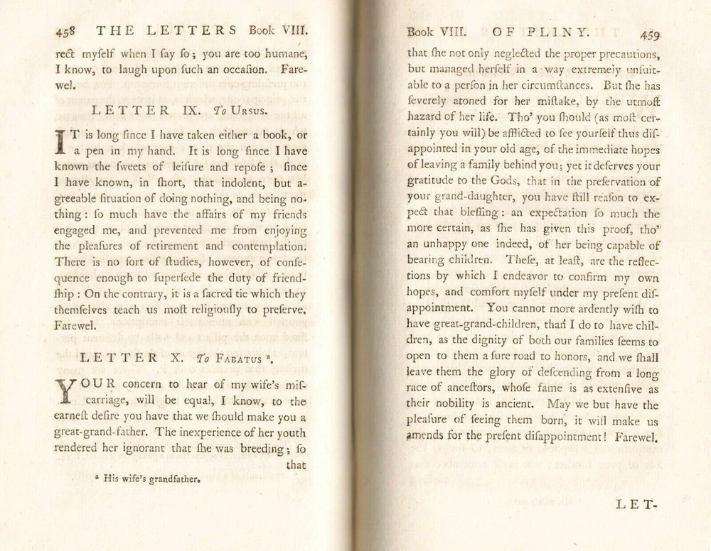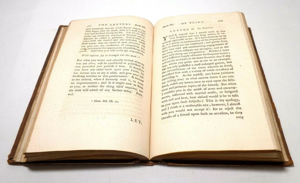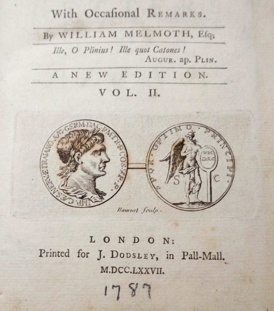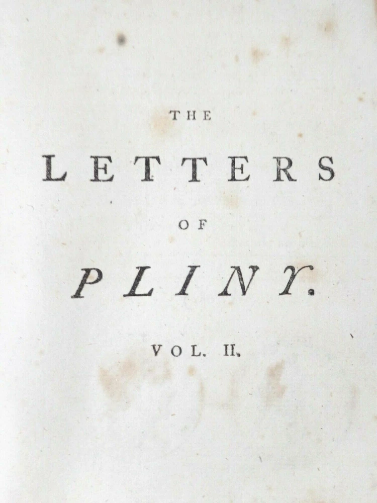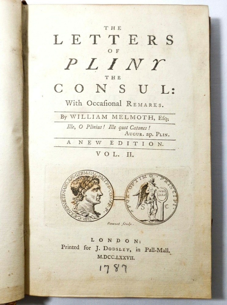 LATE 18TH CENTURY (1777) ANTIQUE VOL. 'THE LETTERS OF PLINY THE CONSUL,' (w/occasional remarks) VOLUME II, By WILLIAM MELMOTH LONDON, UK, Printed for J. Dondsley, in Pall-Mall MDCCLXXVII (1777) 18th century British correspondence DIMENSIONS: 8 ¼" Height x 5" Width x 1" Depth, 692 pages DESCRIPTION: There's minimal foxing on some of the interior cotton pulp pages. The previous owner had incorrectly written down the conversion of the year in ink (1787, instead of 1777) under the roman numerals on the title page. CONDITION: Fair to Good overall antique condition.