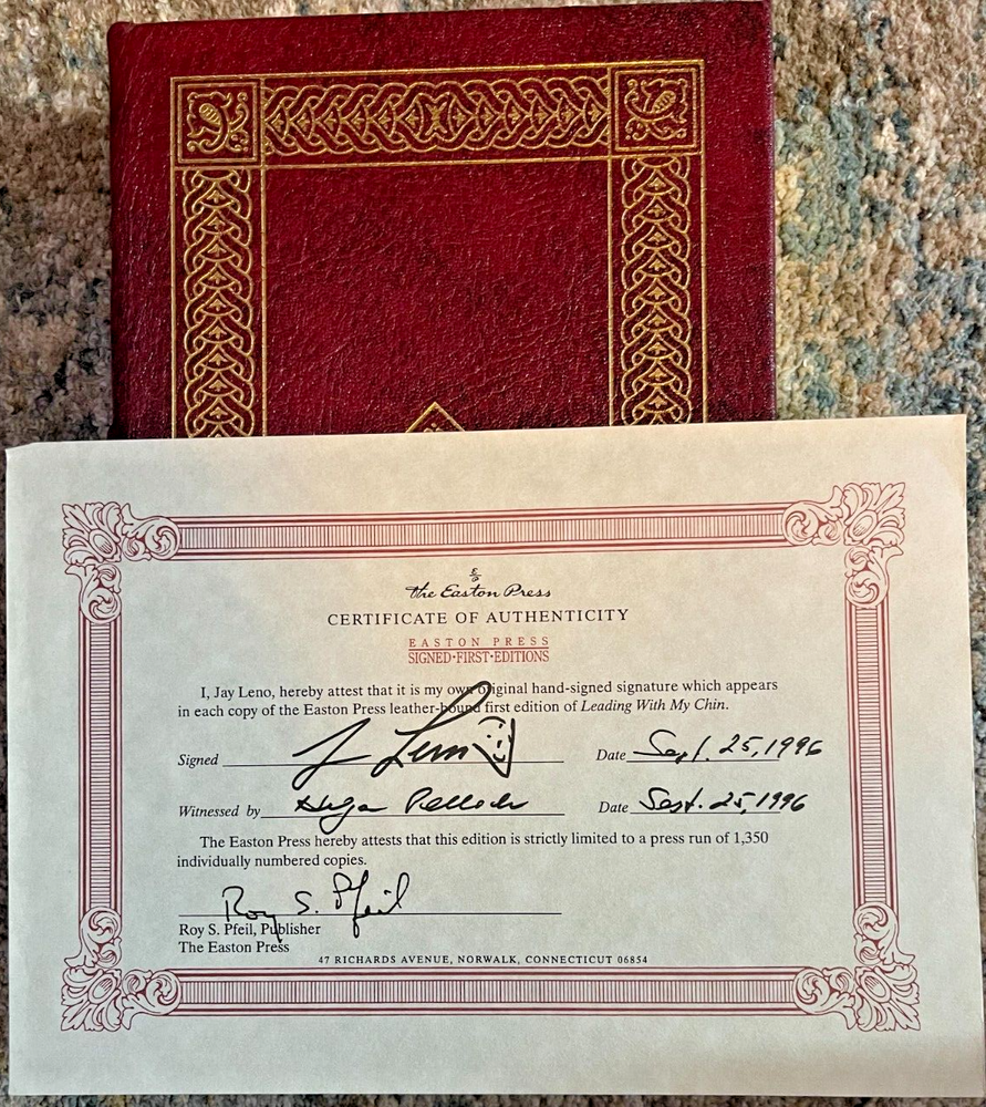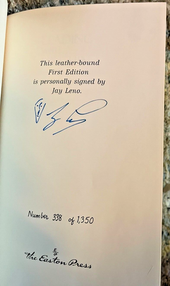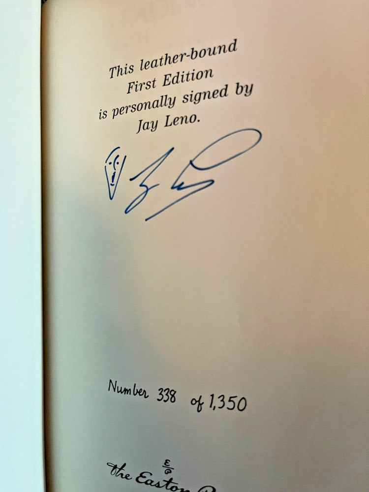 Hardcover. Condition: Very Good. Signed. First Edition. FIRST edition, SIGNED by Jay Leno on the limitation page. Full leather cover with gilt decoration and raised bands, decorative endpapers, all edges gilt, satin-ribbon bookmark. A copy in near fine condition. Jay Leno autobiography w/ Certificate of Authenticity. Book & Certificate signed by Leno. "This leather-bound First Edition is personally signed by Jay Leno. Number 338 of 1,350". Signed by Author.