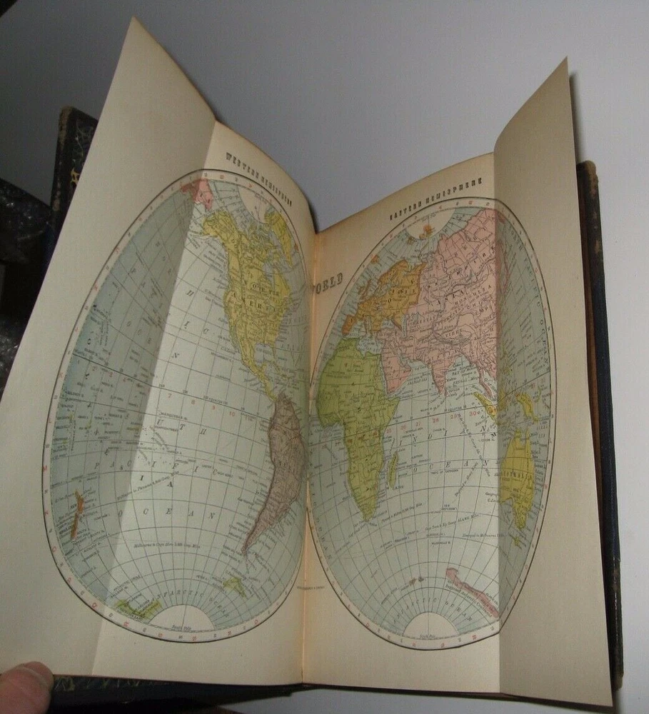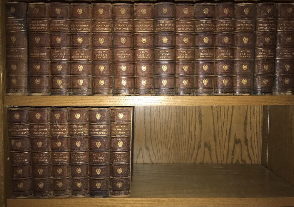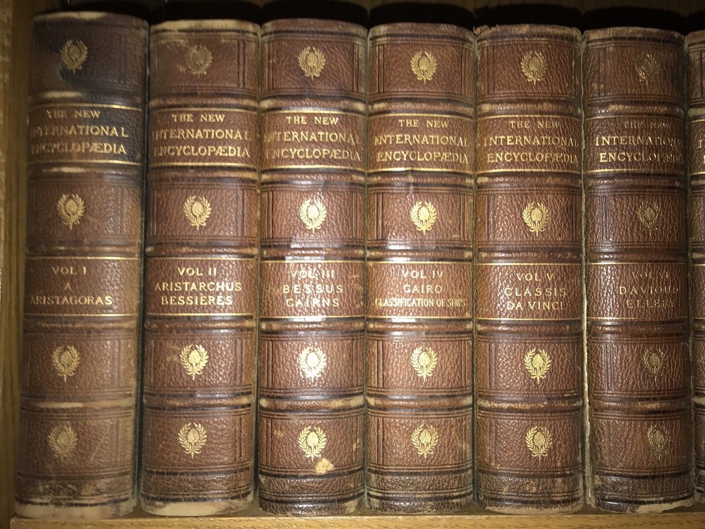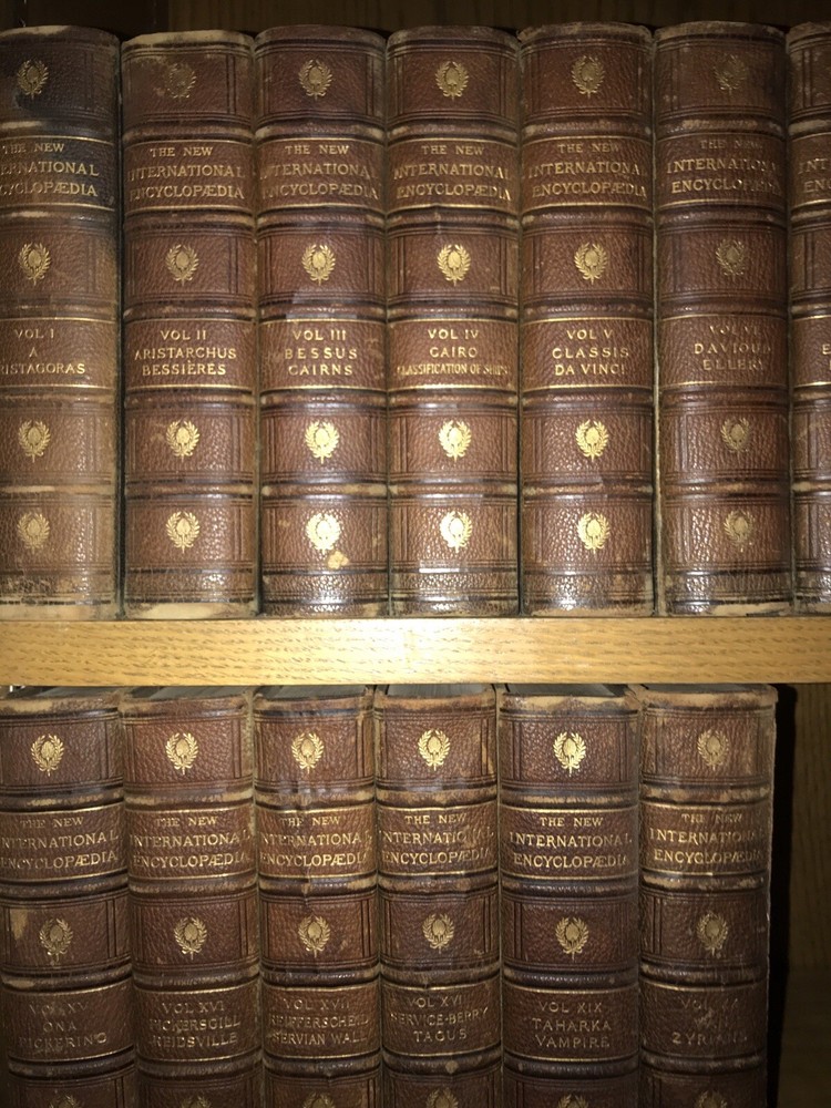 THE NEW INTERNATIONAL ENCYCLOPEDIA! COMPLETE in 20 MASSIVE VOLUMES! Some of the hinges are completely cracked externally, and only held on by the inside. See the last two pictures. This may be bothersome. On the shelf it’s hard to tell. Otherwise this is an exceptional set. If the hinge damage is bothersome please do not purchase thus set. Printed in 1910! This set is well over 100 years old! These are MASSIVE books! Measuring 10 inches tall and over 2 inches thick! Each book will be individually wrapped and well protected for shipping via Priority Mail. THE NEW INTERNATIONAL ENCYCLOPEDIA. Edited by: Frank Moore Colby, Daniel Coit Gilman, Harry Thurston Peck. Bound in the original leather bindings. Top edge gilded. Marbled end-papers. These are particularly large, heavy books at 10'' tall and over 2" thick. Complete 20 volume (extra thick volumes) set. Dodd, Mead and Company, New York. Printed in 1910. CONDITION: some of the hinges are completely cracked and only held on from the inside. This may be bothersome. If all the hinges were sound thus sells at $2000. Set is complete in 20 volumes. This is a MASSIVE and heavy set. Overall in excellent condition for it's age. All hinges attached, some are completely cracked, many are starting, held firmly in place internally, by publisher's extra reinforced hinges. Some general rubbing. Clean, bright interior. About free of foxing. Very tightly bound text blocks. No writing or signs of previous ownership. Some of the hinges are completely cracked externally, and only held on by the inside. See the last two pictures. This may be bothersome. On the shelf it’s hard to tell. Otherwise this is an exceptional set. If the hinge damage is bothersome please do not purchase thus set. CONDITION: Set is complete in 20 volumes. This is a MASSIVE and heavy set. Overall in excellent condition for it's age. All hinges attached, some are cracked or show starting, held firmly in place internally, by publisher's extra reinforced hinges. Some general rubbing. Clean, bright interior. About free of foxing. Very tightly bound text blocks. No writing or signs of previous ownership. Each volume contains many color plates and fold-out maps. Stunning illustrations. Vol. I contains a two-page fold-out world map frontis. An in-depth, comprehensive encyclopedia comparable or superior to the Encyclopedia Britannica. Covers history and content from all around the world. Spine contents are particularly compelling, spelled out with titles vs letters, with the likes of: Classics, Da Vinci,... Vampire, etc.. as opposed to the more common lettering, A-B C-D... This is set limited #6491, according to publisher's stamp on copyright page. A well preserved set for it's age, no other sets presently listed elsewhere. 3488 The New International Encyclopedia From Wikipedia, the free encyclopediaJump to navigationJump to search The New International Encyclopedia was an American encyclopedia first published in 1902 by Dodd, Mead and Company. It descended from the International Cyclopaedia (1884) and was updated in 1906, 1914 and 1926. Contents 1History 2References 2.1Sources 2.2Sources 3External links First edition, volume eight The New International Encyclopedia was the successor of the International Cyclopaedia (1884). Initially, The International Cyclopaedia was largely a reprint of Alden's Library of Universal Knowledge , which was a reprint of the British Chambers's Encyclopaedia . The title was changed to The New International Encyclopedia in 1902, with editors Harry Thurston Peck, Daniel Coit Gilman, and Frank Moore Colby.[1] The encyclopedia was popular and reprints were made in 1904, 1905, 1907 (corrected and expanded to 20 volumes), 1909 and 1911. The 2nd edition appeared from 1914 to 1917 in 24 volumes. With Peck and Gilman deceased, Colby was joined by a new editor, Talcott Williams.[1] This edition was set up from new type and thoroughly revised. It was very strong in biography.[2] A third edition was published in 1923, however this was mostly a reprint with the addition of a history of the First World War in volume 24, which had previously been a reading and study guide. A two-volume supplement was published in 1925 and was incorporated into the 1927 reprint, which had 25 volumes. A further two volumes supplement in 1930 along with another reprint.[3] The final edition was published in 1935, now under the Funk & Wagnalls label. This edition included another updating supplement, authored by Herbert Treadwell Wade. Some material from The New International would be incorporated into future books published by Funk and Wagnall's books such as Funk & Wagnalls Standard Encyclopaedia .[3] The 1926 material was printed in Cambridge, Massachusetts, by Yale University Press. Boston Bookbinding Company of Cambridge produced the covers. Thirteen books enclosing 23 volumes comprise the encyclopedia, which includes a supplement after Volume 23. Each book contains about 1600 pages.[4] Like other encyclopedias of the time, The New International had a yearly supplement, The New International Yearbook , beginning in 1908. Like the encyclopedia itself, this publication was sold to Funk and Wagnalls in 1931. It was edited by Frank Moore Colby until his death in 1925, and then by Wade. In 1937 Frank Horace Vizetellybecame editor.[3] The yearbook outlasted the parent encyclopedia, running to 1966.[5][ incomplete short citation ] More than 500 men and women submitted and composed the information contained in The New International Encyclopedia . New American Cyclopædia From Wikipedia, the free encyclopediaJump to navigationJump to searchTitle page from the New American Cyclopædia (1858) The New American Cyclopædia was an encyclopedia created and published by D. Appleton & Company of New York in 16 volumes, which initially appeared between 1858 and 1863. Its primary editors were George Ripley and Charles Anderson Dana. The New American Cyclopædia was revised and republished as the American Cyclop