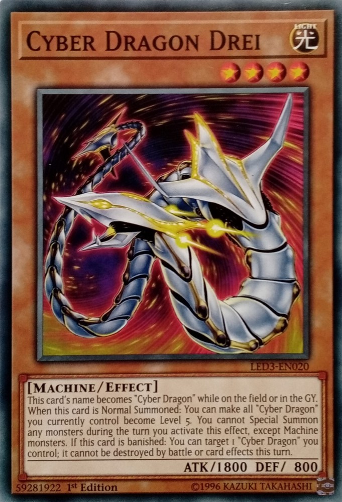 LED3-EN020 CYBER DRAGON DREI COMMON 1ST EDITION ALL YU-GI-OH CARDS I SELL ARE KONAMI TOURNAMENT LEGAL. CARDS ARE ALL NEAR MINT TO LIGHTLY PLAYED CONDITION. POSTAGE IS FREE SO YOU CAN BUY AS MANY CARDS AS YOU WANT FROM US AND NOT PAY A PENNY POSTAGE. IF YOU HAVE ANY QUESTIONS PLEASE FEEL FREE TO CONTACT ME. Track Page Views With Auctiva's FREE Counter