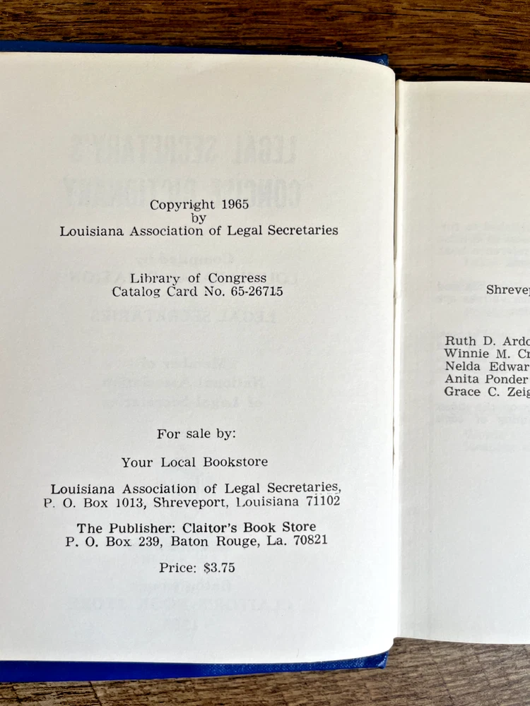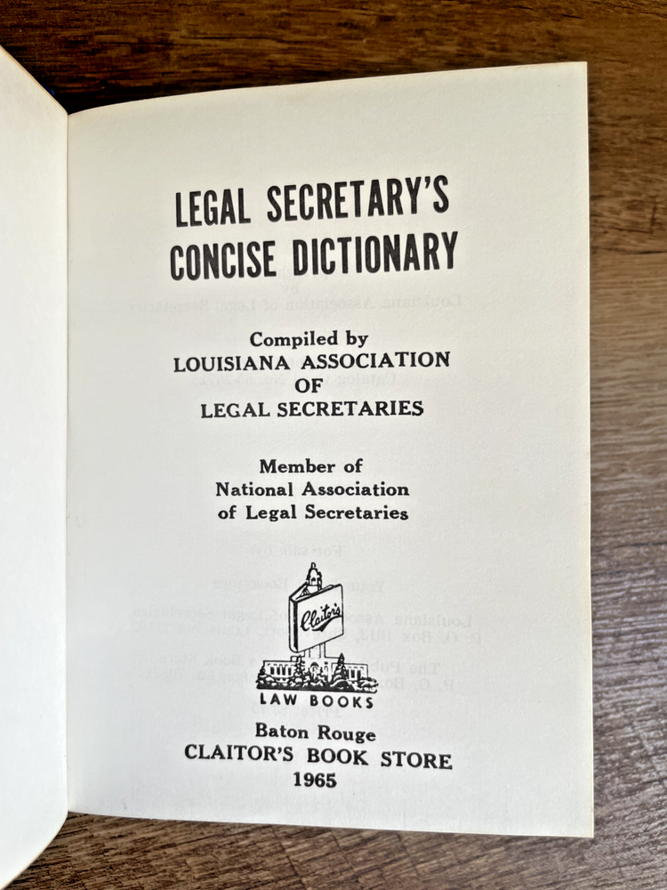 Legal Secretary's Concise Dictionary by Louisiana Association of Legal Secretaries (1965, Baton Rouge) A specialized reference book designed for legal secretaries, this concise dictionary provides clear definitions of legal terminology, procedural terms, and commonly used phrases in the legal field. Published by the Louisiana Association of Legal Secretaries, it serves as a valuable resource for those working in law offices or studying legal administration. An essential addition for legal professionals, students, and collectors of vintage legal reference books. Expected signs of age and use, including minimal wear to the cover . Please see photos for visual inspection.