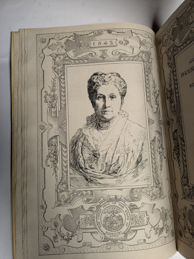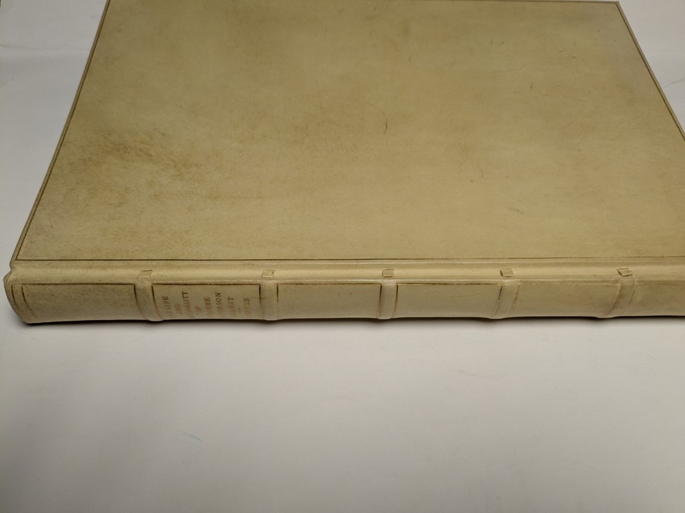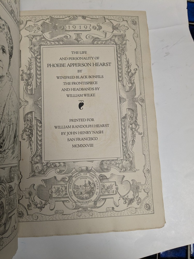 The Life and Personality of Phoebe Apperson Hearst by Winifred Black Bonfils. Publisher: John Henry Nash for William Randolph Hearst, 1928. Limited Edition of 1,000 copies. Fully bound in vellum. Raidsd bands on the spine and top page edges gilt . Some bowing to the boards - more so the front. Foxing to endpapers , then lighter and sporadic to pages of text. Unmarked. 155 pages. In brown flannel cloth bag custom made to fit the book and presumed to be on it since publication. Really, a gorgeous production of a book and well-preserved. Mother of William Randolph Hearst and founder of National PTA - Parent Teacher Association
