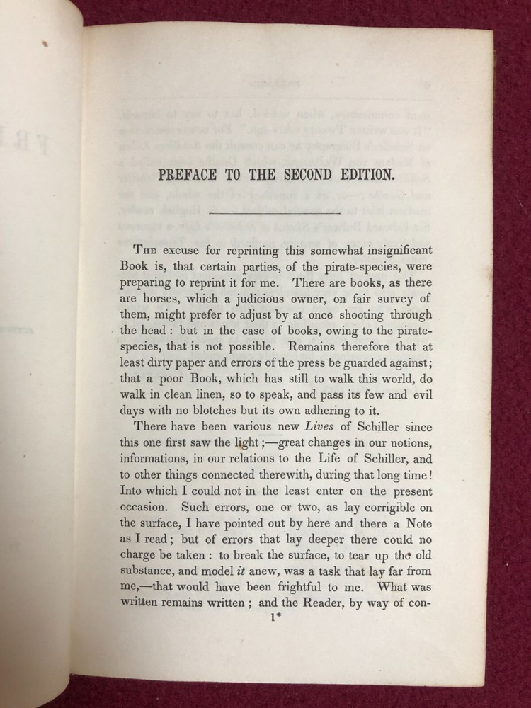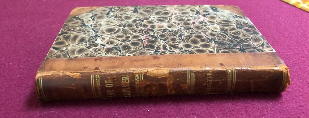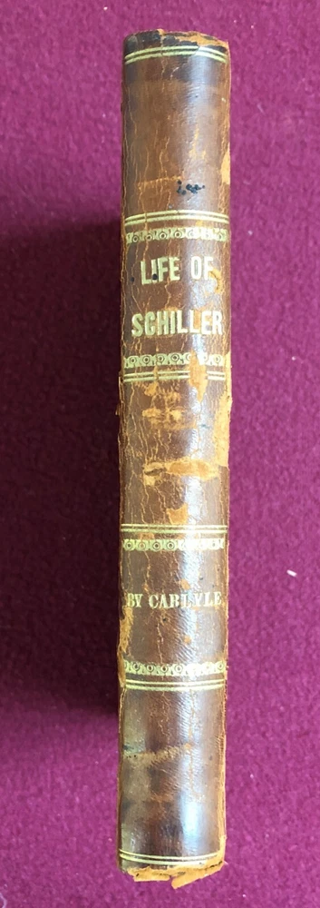 THE LIFE OF FRIEDRICH SCHILLER: COMPREHENDING AN EXAMINATION OF HIS WORKS . By Thomas Carlyle. “From the Second London Edition.” D. Appleton & Co., New York. 1846. 280 pages. Hardcover. Leather-covered spine and corners. CONDITION NOTES: Very good antique hardcover. Leather is somewhat distressed. Bumped corners. Substantial foxing on inside covers and facing page. Price penned on inside front cover and also on facing page. Otherwise, except for occasional foxing, the book is clean inside. Binding is tight. Please check the included images for more details on contents and condition. This item comes from a private collection in a smoke-free home. Sold AS IS. SKU:136PM