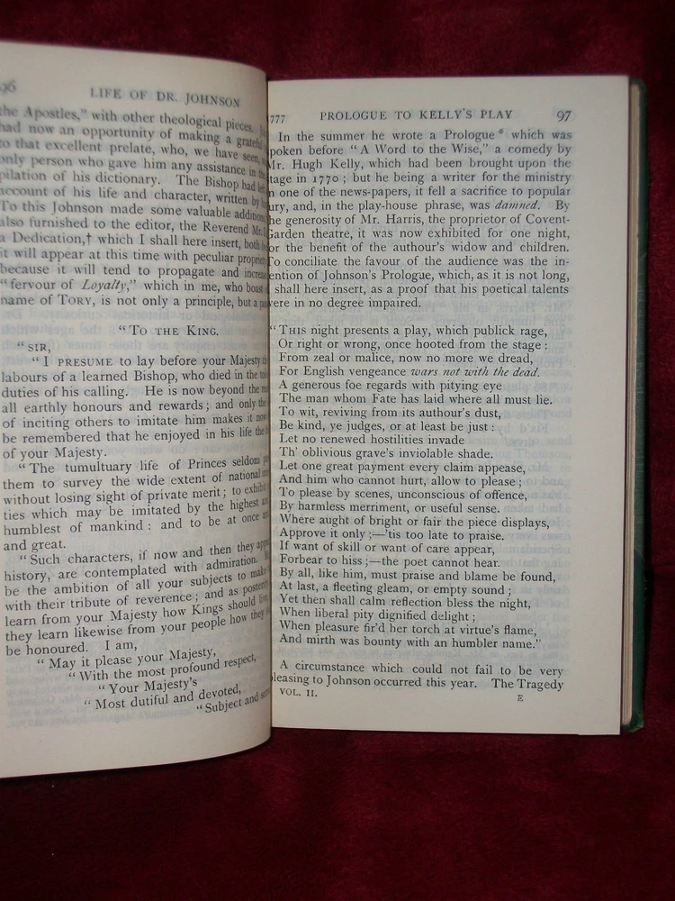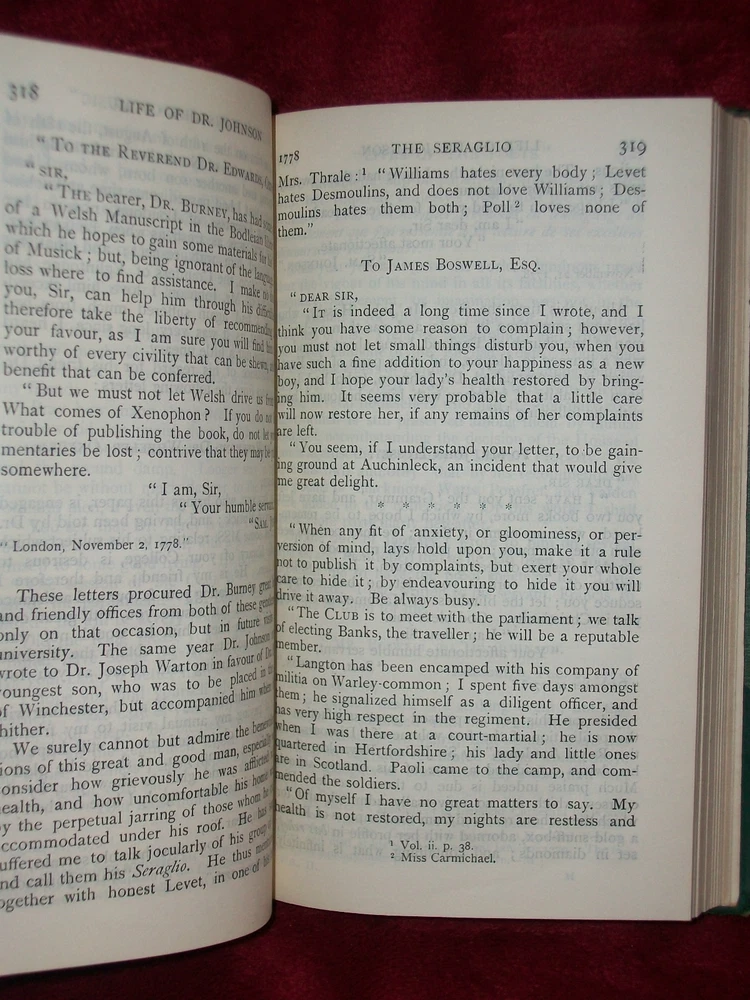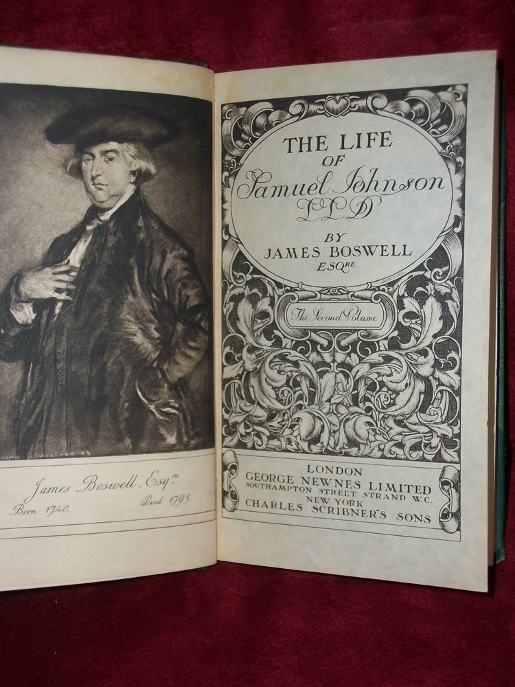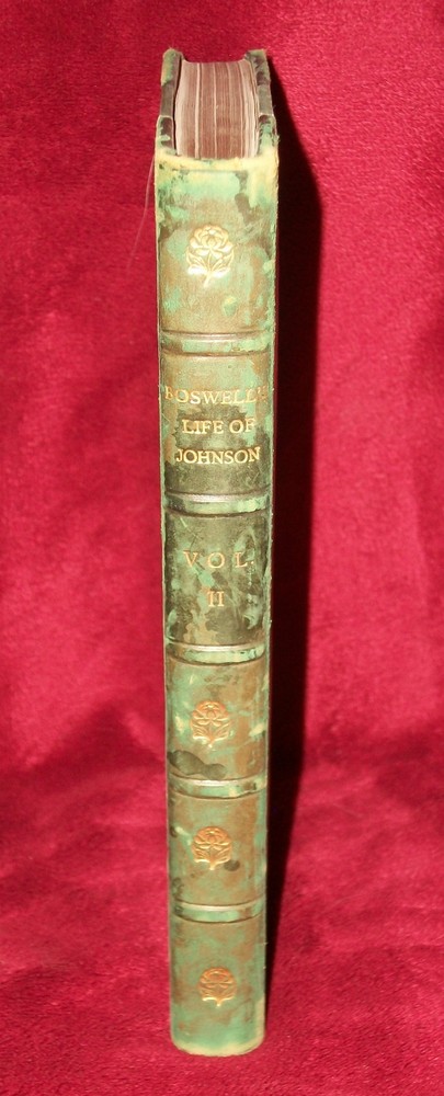 THE LIFE OF SAMUEL JOHNSON by James Boswell The Second Volume London George Newness Limited Printed by William Clowes and Sons, Limited, London and Beccles no print date It measures 4" x 6 3/4" and is 844 pages. Condition: Used, Very Good The hardback cover has leather corners and spine. The leather has rubbing to the corners and edges and light chipping to the corners. The binding is tight. It has a tag on the inside front cover. The pages have no noticed writing, tears, or creases. SEE MY STORE FOR MORE GREAT ITEMS Please read description carefully and look closely at all pictures. If you have questions or concerns ALWAYS send messages through Ebay messaging and NOT my email address. I am happy to entertain offers but NEVER include shipping in your offer price. Shipping cost is always as stated in item listing. Shipping and Handling Shipping is figured by exact USPS shipping cost, delivery confirmation cost, and $2.00 packaging and handling fee. * I do offer combined shipping based on the weight of the books. To receive the shipping discount items MUST be paid for together. This is an Ebay rule, not mine . To do this, please place items in your Ebay cart and then you will be invoiced for all items together * If item is extremely large or needs special attention the packaging and handling fee might be more, this is very rare!