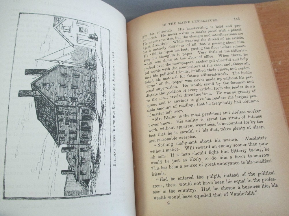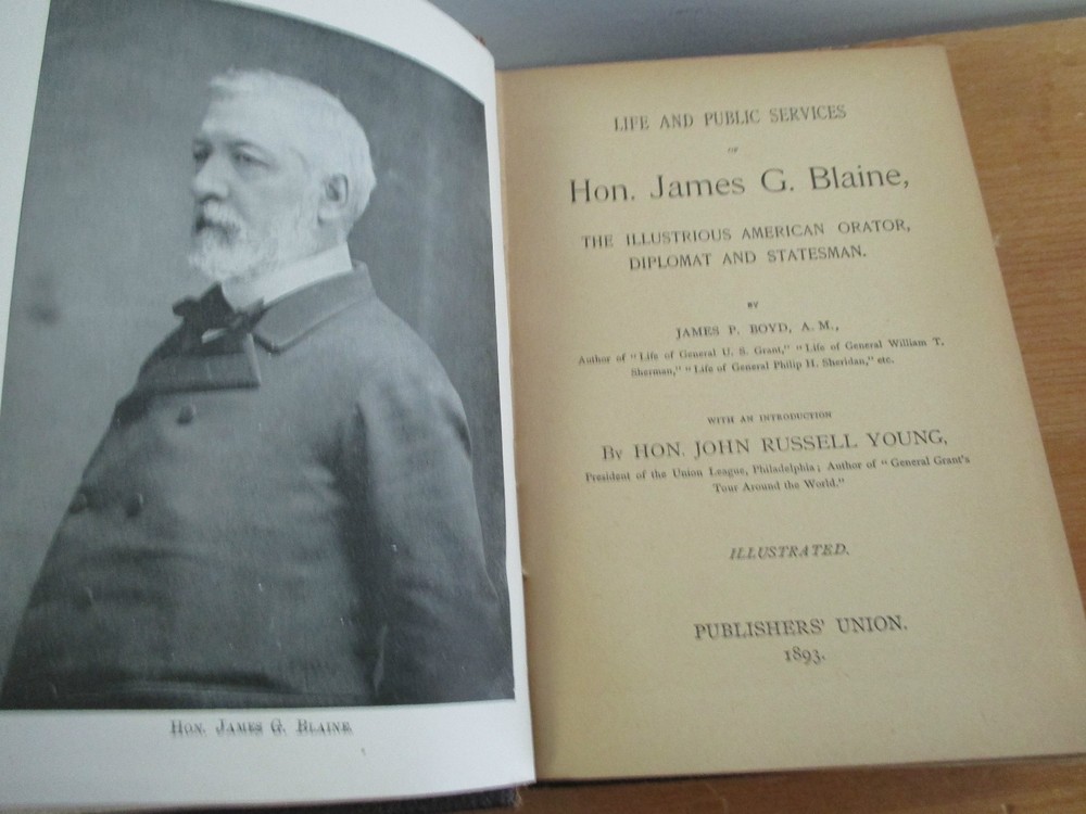 Life and Public Services of HON JAMES G BLAINE The Illustrious American Orator, Diplomat and Statesman by James P Boyd with an Introduction by Hon John Russell Young was published 1893 by the Publishers' Union, 1st edition measuring 8" x 5 3/4" with leather binding, 704 pages, b+w photos and illustrations, all page edges gilt, James G Blaine was narrowly defeated for President by Grover Cleveland in 1884. Leather worn and rubbed at extremities; spine faded; gilt page edges dulled; text browned but not brittle ; otherwise solid and clean. Thank you.