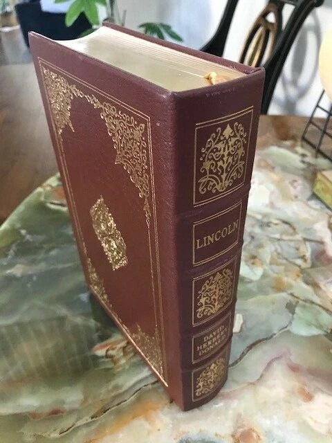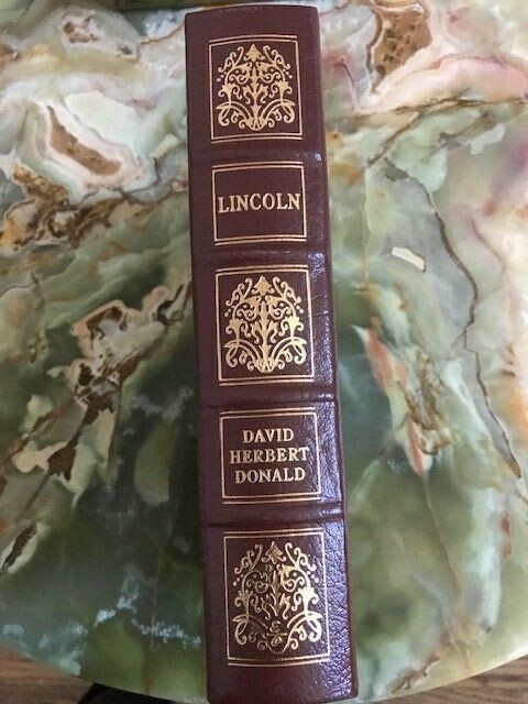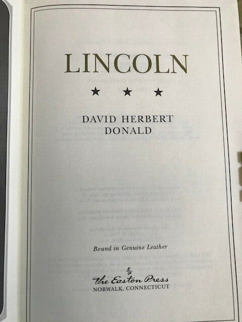 LINCOLN , David Herbert Donald, Published by Easton Press, Norwalk, Connecticut, Leather-bound, 1996. About the photograph in the front page made by Alexander Hesler of Chicago in February 1857, President Lincoln considered "a very true me", but Mary Lincoln and others did not like it. "My impression" Lincoln said, "is that their objection arises from the disordered condition of the hair." This book is printed on archival quality paper especially milled for this edition. It is acid neutral and conforms to all guidelines established for performance and durability by the Council of Library Resources and the AmericanNational Standards. Hardcover bound in genuine leather with 22 karat gold decorations, all page edges gilded with 22 karat gold, raise spine hubs, sew-in satin ribbon book markers, archival quality acid-free paper, silk moire fabric endpapers, thread-sewn pages for strength and durability. Brand new book, mo marking, no writing, pages are clean and tight, unread. Size of the book: 9.5X6.5X2 inch; Weight: 3 lb.; Pages: 714 Will be shipped via USPS Media Mail with tracking number.