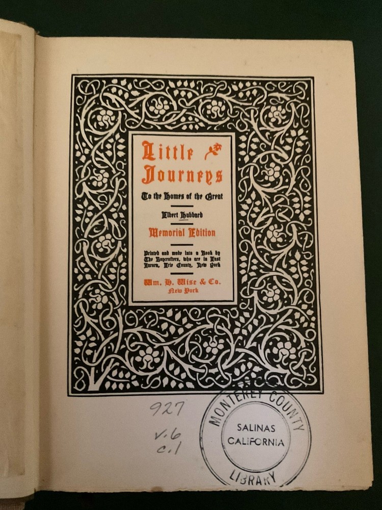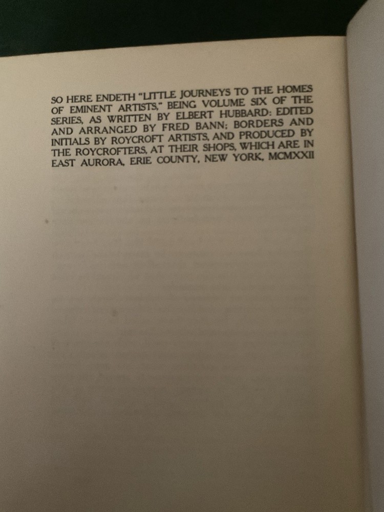 *LITTLE JOURNEYS TO THE HOMES OF EMINENT ARTISTS," BEING VOLUME SIX OF THE SERIES, AS WRITTEN BY ELBERT HUBBARD: EDITED AND ARRANGED BY FRED BANN; BORDERS AND INITIALS BY ROYCROFT ARTISTS, AND PRODUCED BY THE ROYCROFTERS, AT THEIR SHOPS, WHICH ARE IN EAST AURORA, ERIE COUNTY, NEW YORK, MCMXXII