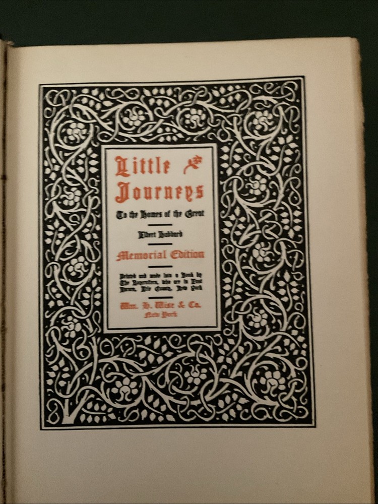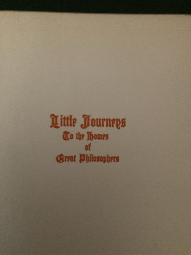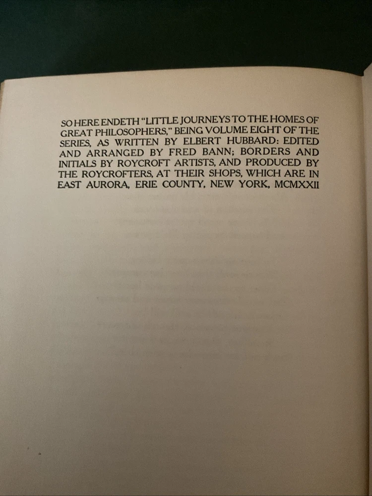 "LITTLE JOURNEYS TO THE HOMES OF GREAT PHILOSOPHERS," BEING VOLUME EIGHT OF THE SERIES, AS WRITTEN BY ELBERT HUBBARD: EDITED AND ARRANGED BY FRED BANN; BORDERS AND INITIALS BY ROYCROFT ARTISTS, AND PRODUCED BY THE ROYCROFTERS, AT THEIR SHOPS, WHICH ARE IN EAST AURORA, ERIE COUNTY, NEW YORK, MCMXXII