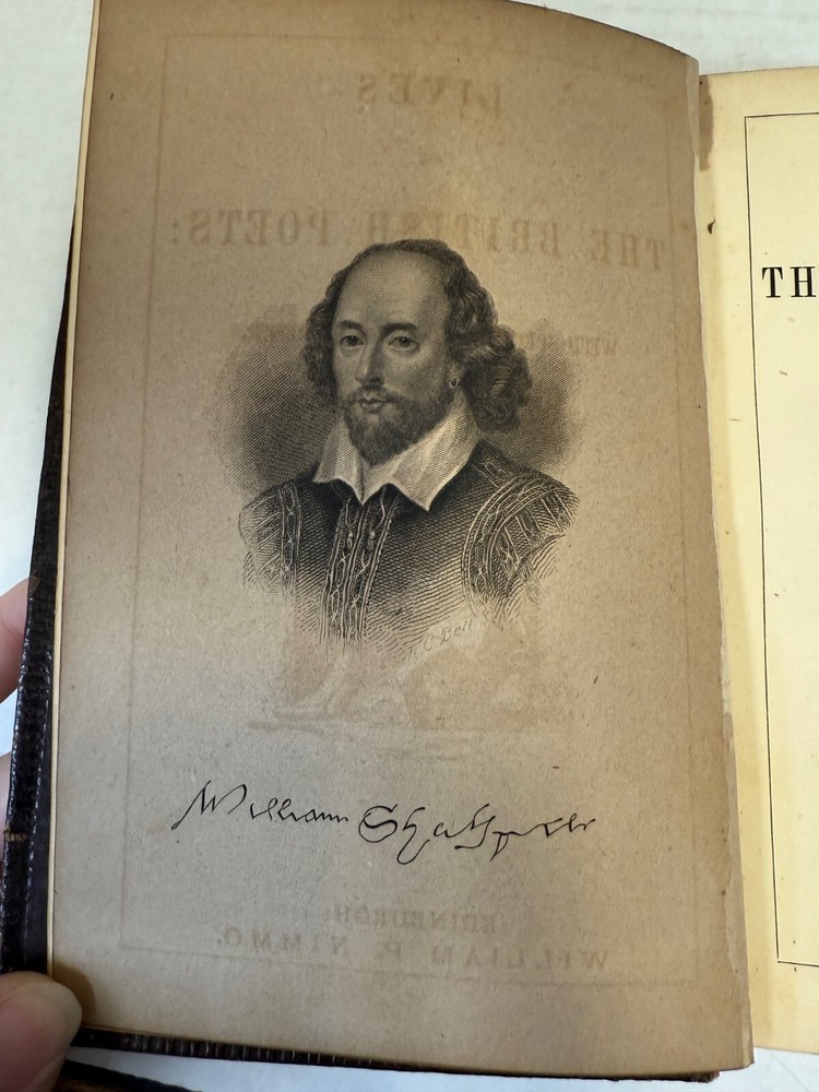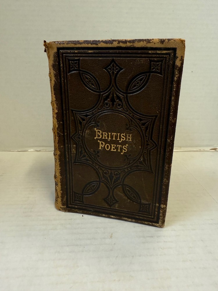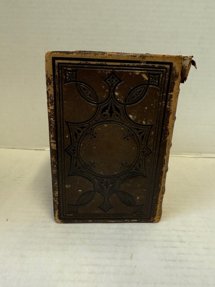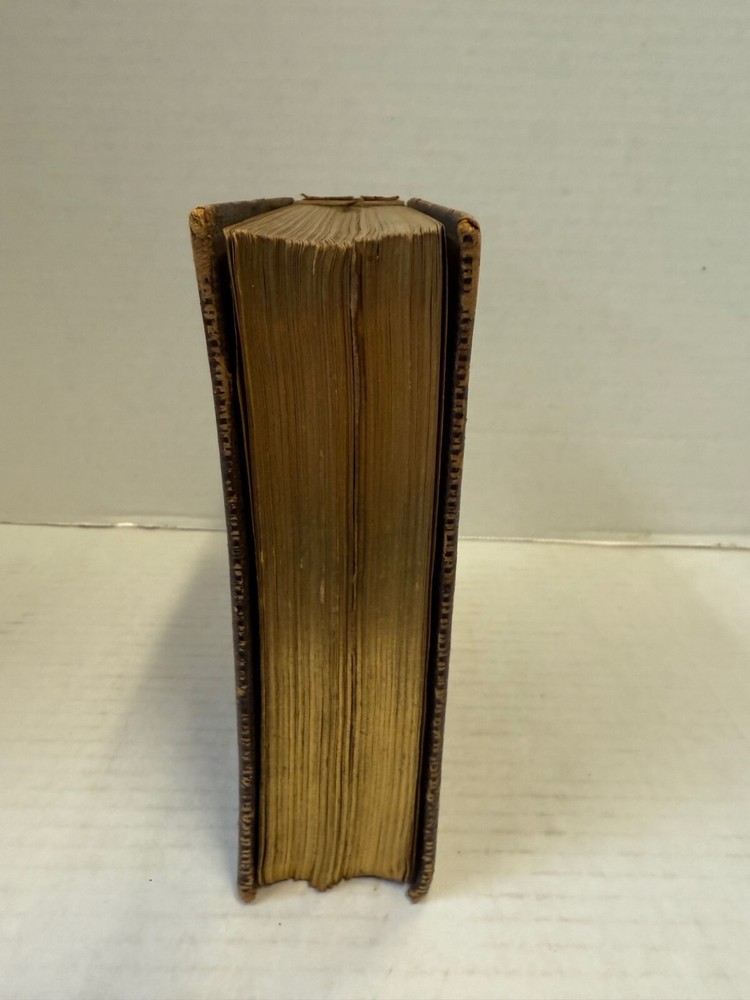 Brown, sculpted leather cover has gold embellishments on the front and on the spine. Leather has significant edge-wear, with a tear in the leather at the spine's head. Hand-sewn text block is strong/secure, and it is unmarked. Text block has gilt edges. Front and back hinges have partial cracks.