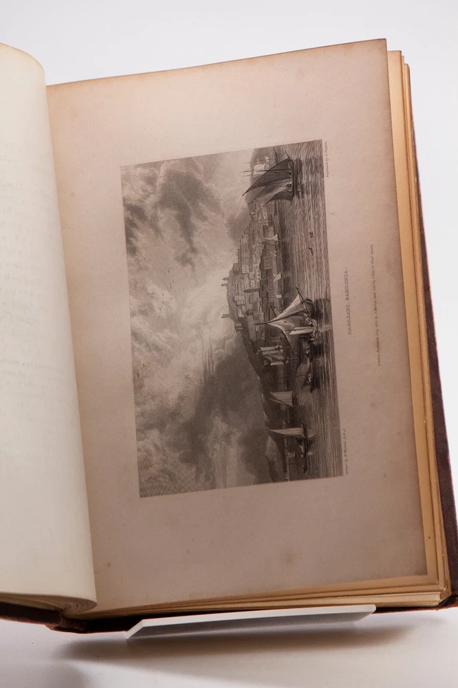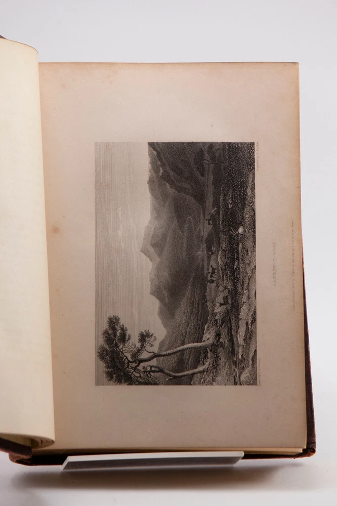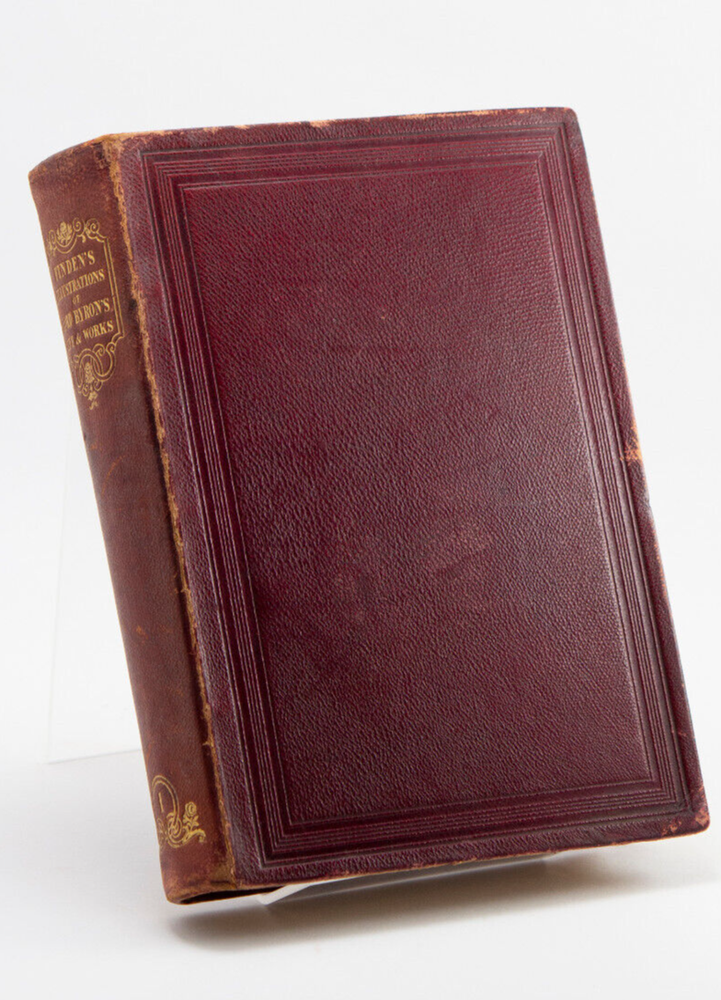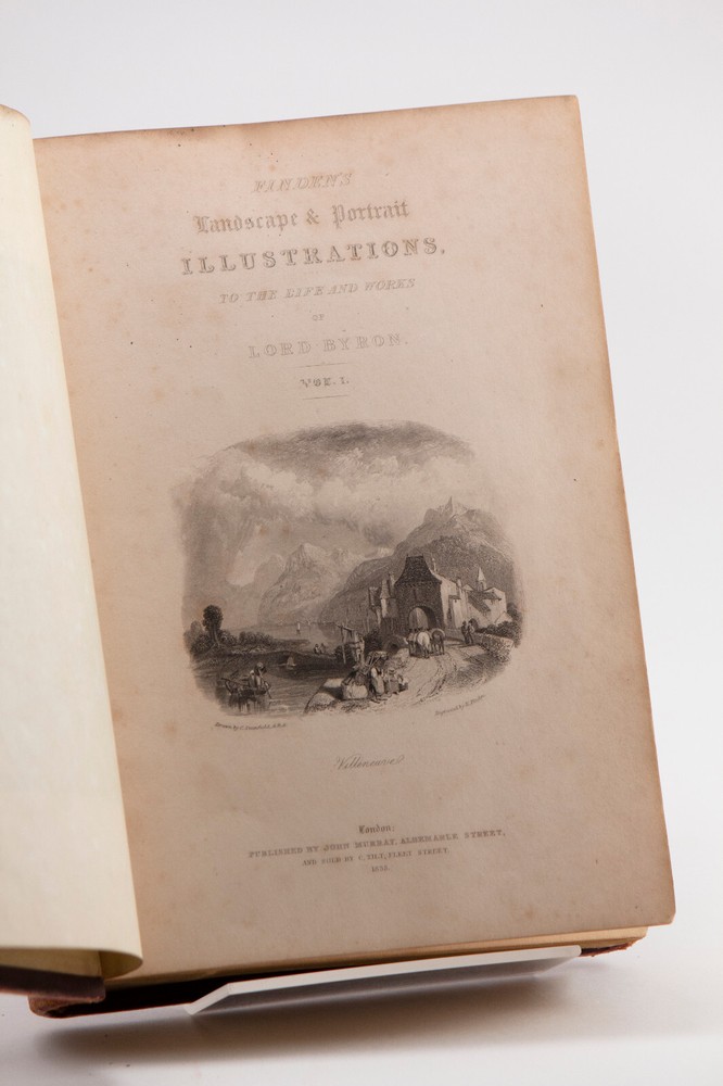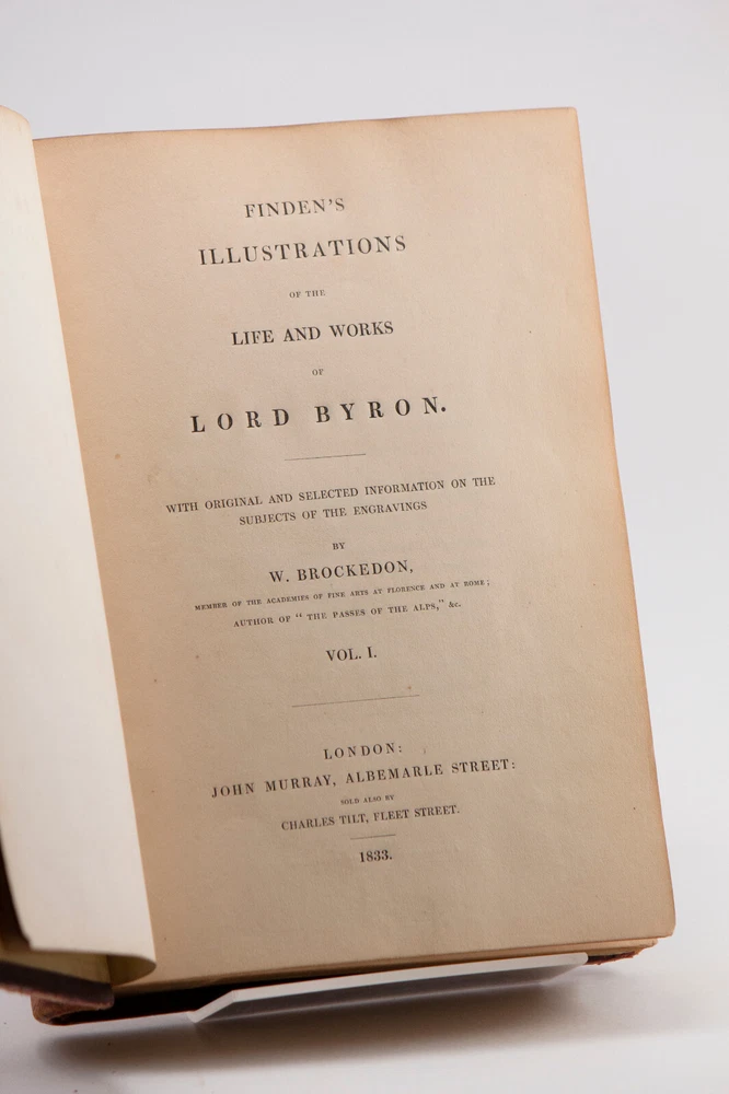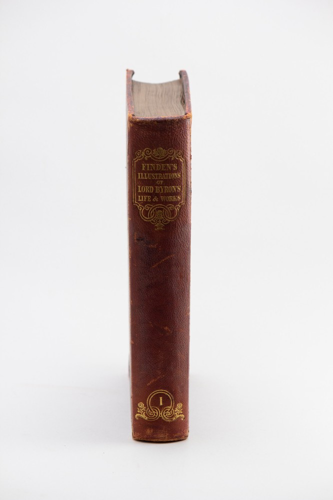 First Edition. Octavo, original burgundy leather over boards, gilt edges. Black and white plates throughout relating to the English romantic poet Lord Byron, engraved by brothers William and Edward Francis Finden, with information supplementing the illustrations edited by English painter and writer William Brockedon. Volume 1 only.