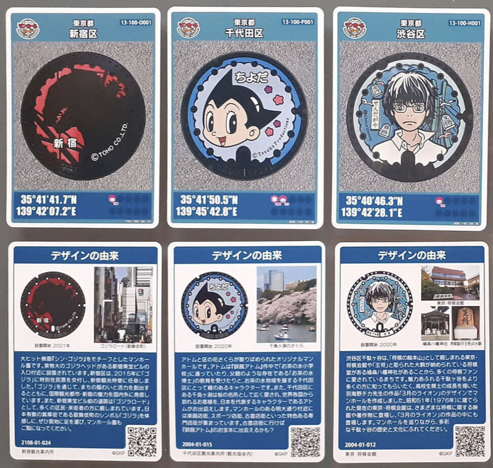 A LOT of 3 collectible manhole cover cards: Godzilla, Atom (Astro Boy) & Chica Umino's "March Comes In Like a Lion" . They were collected in person on various locations in Tokyo. The cards feature a picture of a manhole cover and the coordinates where the manhole can be found. On the reverse is a description of the manhole's design. The cards are available only at specific tourist locations and have become hugely popular with locals and tourists alike. Manhole cover cards are collectible items and they compliment Japan's famous colorful designer manhole covers. Each region has unique manhole cover designs, featuring local landmarks, historical events, characters, etc. TRADE IS POSSIBLE! Condition is excellent (the cards were kept in hard protective sleeve all the time). Shipped from Europe in a protective cardboard with tracked airmail (please allow 2-3 weeks for delivery). Also available separately (save on combined shipping!): - Rare manhole cover card with Hayao Miyazaki's Poki character • • • Please ask if you have any questions! Please BE PATIENT while awaiting the arrival of your item (it usually takes 2-3 weeks for delivery to the USA). Upon receipt of item please leave positive feedback to indicate arrival and your satisfaction with it. NO REFUNDS or EXCHANGES!