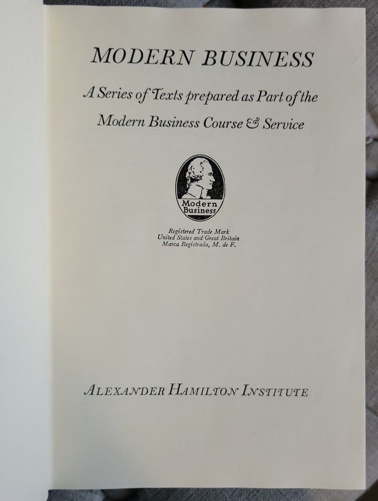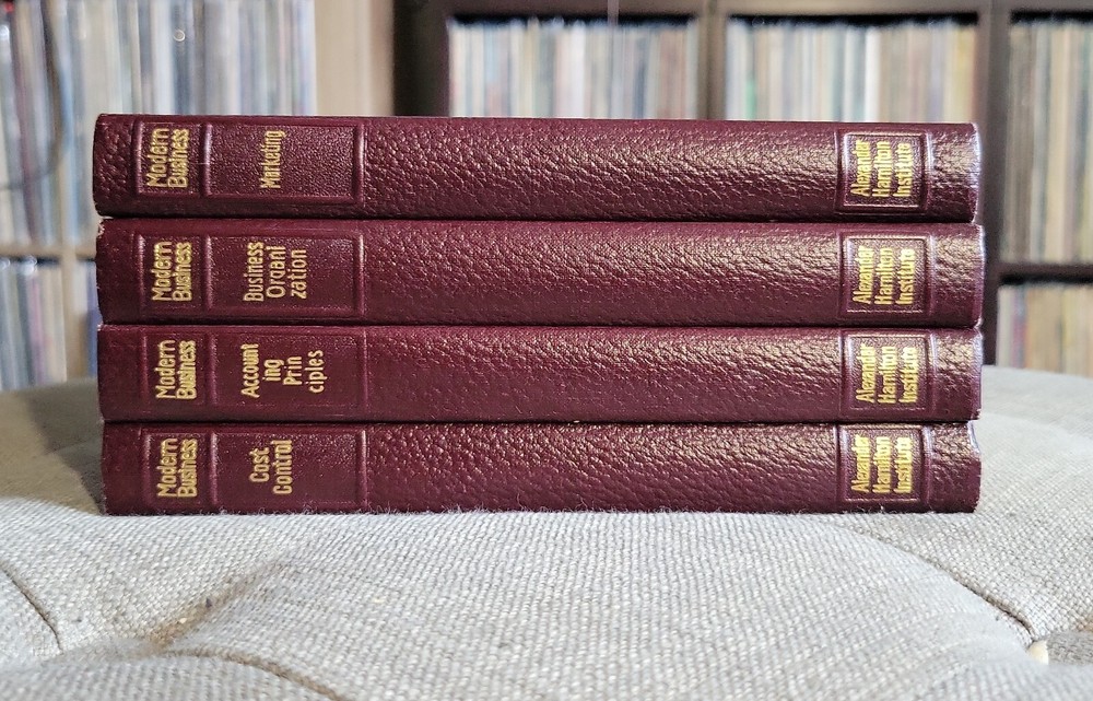 4 titles from the 1960 edition of the Modern Business correspondence course published by the Alexander Hamilton Institute. Like New, Collectible Condition Well-cared for and obviously unread Includes: Accounting Principles Cost Control Business Organization Marketing All Books are Carefully and Properly Packed. Shipped in a Box.