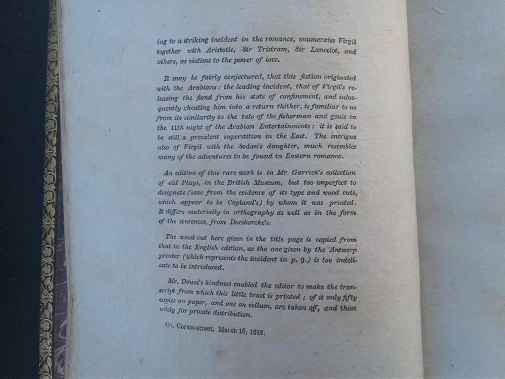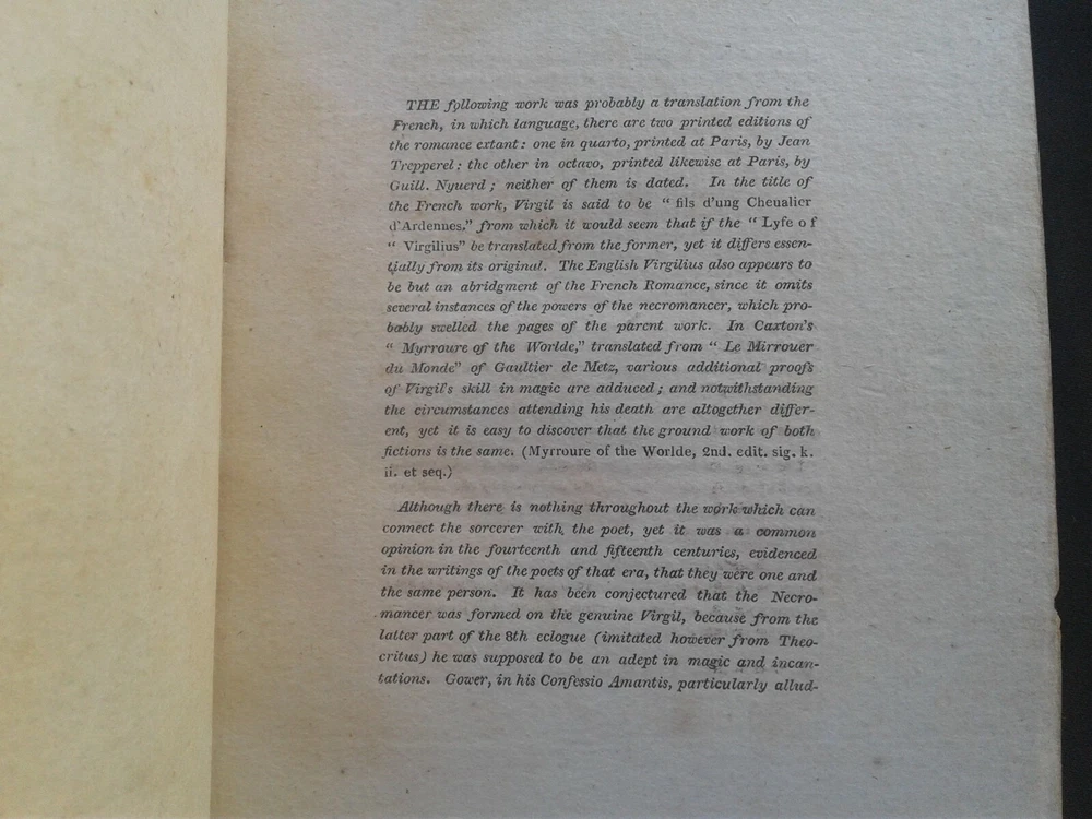 This is a remarkably rare volume. It is a reprint of a likely French 13th-14th century edition of the Life of Virgil. This edition is limited to 50 printed on paper and one printed on vellum for private collectors of the time. There have been no auction records within the last 80 years suggesting that very few of the original 50 paper volumes remains extant. This volume was owned by William Horatio Crawford of the Lakelands, County Cork Ireland as his book-plate attests. It is in very good condition. It is tight in the binding and has some wear on the corners of the leather binding (see pics). It's size is duodecimo or twelvemo (5 x7 3/8) with gilt edging on the leather binding. Please e-mail me with any queries and please peruse my other items for sale. I accept Paypal. Thank You.