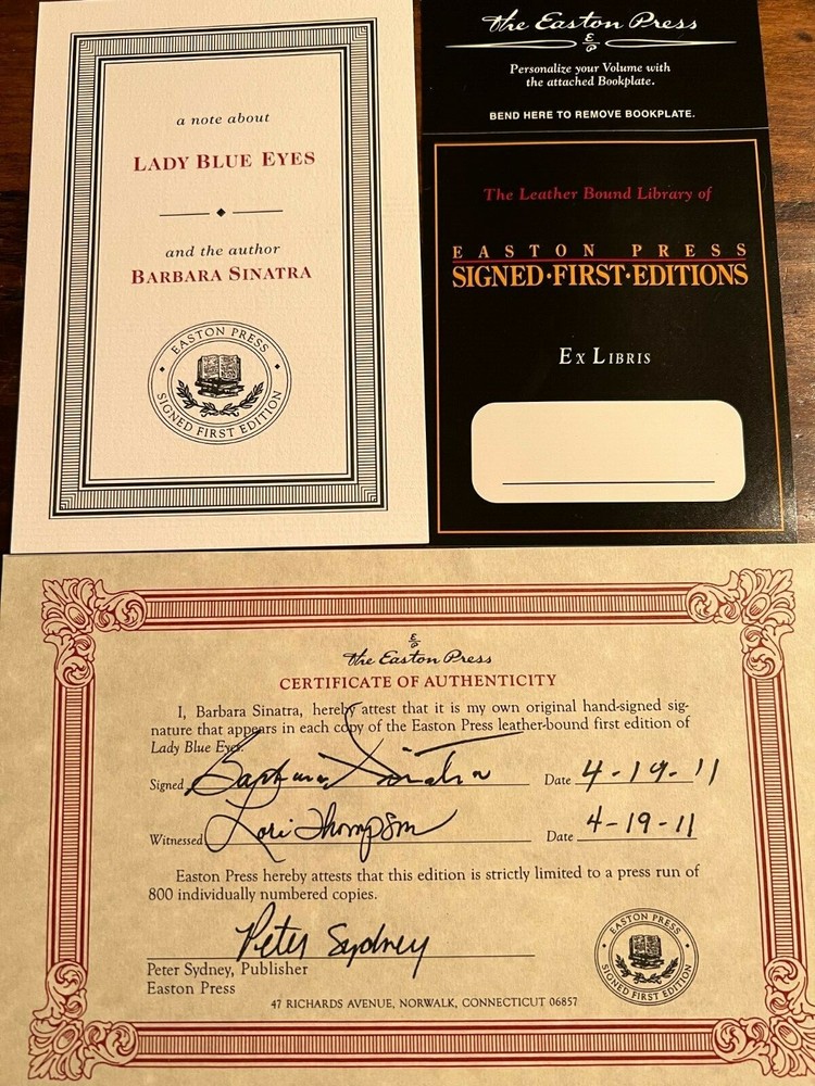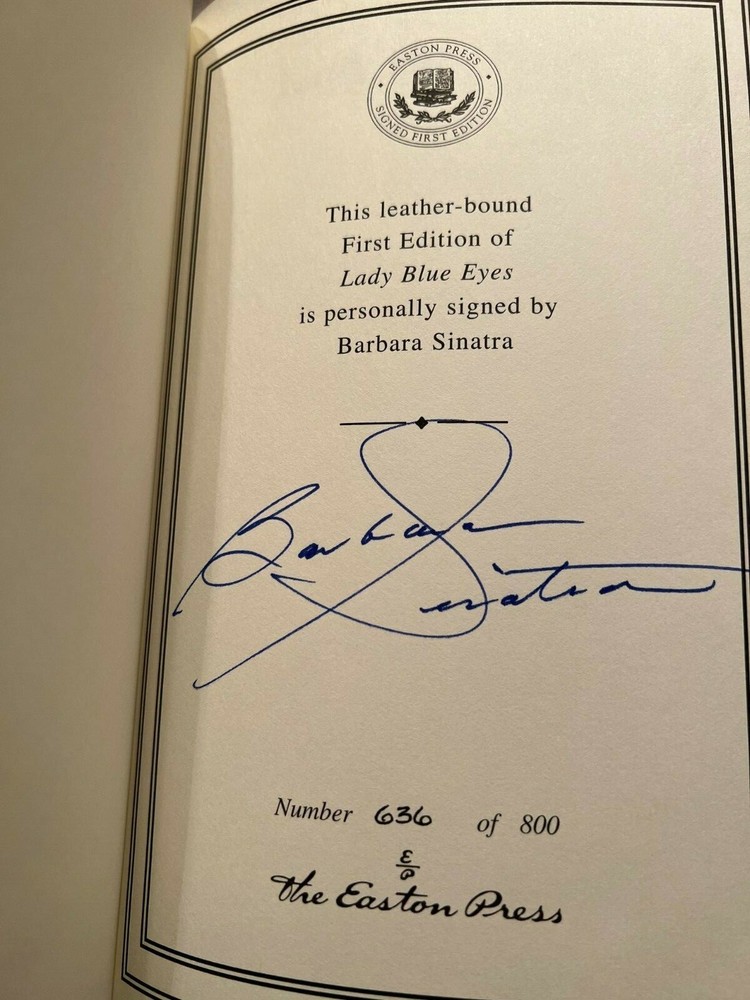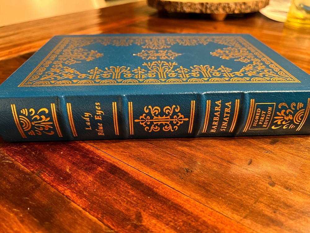This is a beautiful leather bound, gilded page book from Easton Press' Limited Signed First Edition Series of Barbara Sinatra's best-selling memoir - "Lady Blue Eyes." The book is unread and like brand new - only just now opened from the original plastic shrinkwrap to check the numbered edition. There are no owner's marks, writing, etc. in the book. The book carries no scent from smoking, pets, etc. Certificate of authenticity from the publisher included. Number 636 of 800. ALSO, BE SURE TO CHECK OUT THE LISTINGS FOR OUR OTHER SIGNED EASTON PRESS FIRST EDITION BOOKS!! Overview of the book: Barbara Sinatra’s first public love letter to the husband she adored, she celebrates the sensational singer, possessive mate, sexy heartthrob, and devoted friend that she found in Frank in Lady Blue Eyes . For over two decades, Barbara was always by Frank Sinatra's side, traveling the globe and hosting glittering events for their famous friends, including presidents, kings, queens, Hollywood royalty, and musical legends. In this memoir Barbara Sinatra reveals a life lived with passion, conviction, and grace.