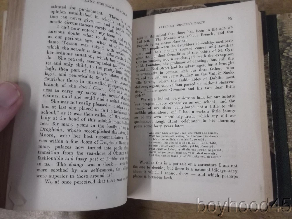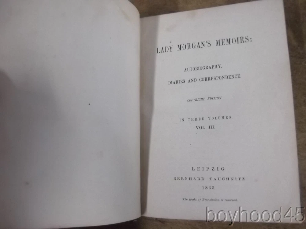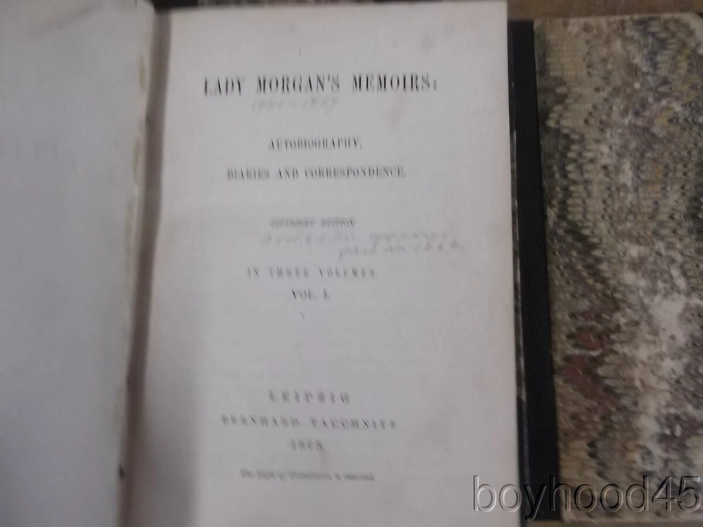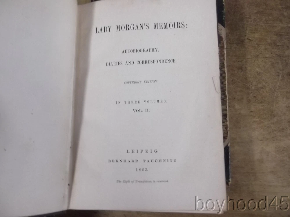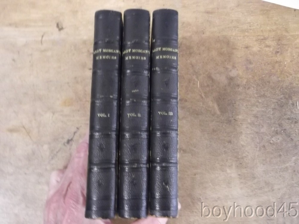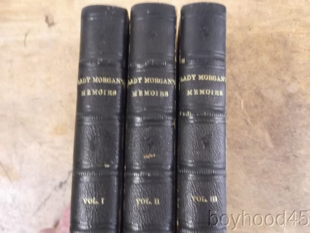 Lady Morgan's Memoirs: Autobiography, Diaries and Correspondence-3 V., 1863 Lady Morgan's Memoirs: Autobiography, Diaries and Correspondence-3 V., 1863 Click images to enlarge Description This is "Lady Morgan's Memoirs: Autobiography, Diaries and Correspondence." Published in Three Volumes by Bernard Tauchnitz, Leipzing, 1863. Lady Morgan was an Irish, and later, English literary figure whose personality often led her to engage in conflicts and literary debates with her male peers. This edition of the memoirs appears to be the second edition, the first having been published in two volumes in 1862. The volumes are bound in half-leather with paper over board covers. There is some gutter wear present and Vol. II shows a small, partial front gutter crack. The paper over board covers hsow expected wear/rubbing. Internally the books are clean, tight and complete with the exception of a torn half-title page to Volume I. I will call the set Very Good. Books measure 4 5/8 X 6 1/4, app 980 total pages. I will offer this slightly worn, but very sound, very usable set for only $90.00 plus $6.00 S&H in the US. Shipping costs to Canada will be considerably less that the general international rate quoted. (Rm 1, L, Case 5, Shelf 2) Condition Notes: Shows slight wear. Clean and quite usable!!! Payment Paypal Shipping Domestic shipping: Fixed Shipping Charges. International shipping: Fixed Shipping Charges. Shipping Carrier Domestic International Shipping Locations Usps First Class $6.00 - - Usps First-Class Intl - $40.00 Worldwide I will ship to: United States, Worldwide Vendio Images: More than just a pretty image. 250+ Mobile Responsive & Active Content Free Listing Templates with Vendio Sales Manager. Vendio provides powerful selling automation for sellers of all sizes. Get business information that counts! - Vendio Counters are active content free.