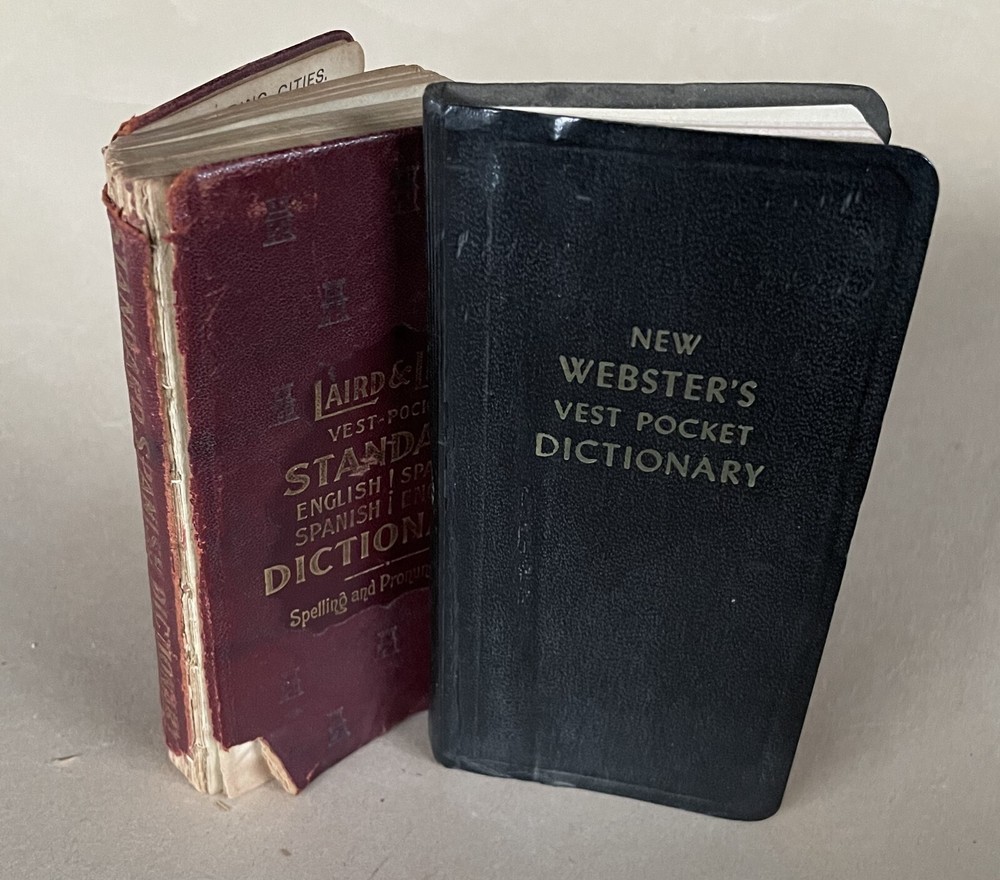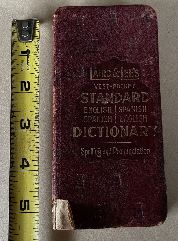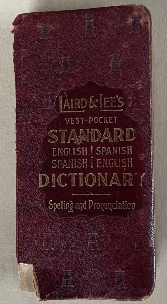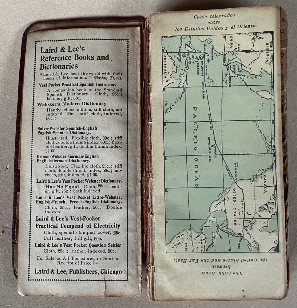 Lot of 2 Antique / Vintage VEST POCKET DICTIONARIES 1900 Laird & Lee's Standard English / Spanish Dictionary English-Spanish and Spanish-English By F. M. de Rivas , Published by Laird & Lee's in 1900 - 123 year old antique Leather binding, cover has separated as well as first title page, but all pages are there for repairing. Includes Map of the Cable Route between the US and the Far East (see photo). Other maps inside, mostly of South American countries as it is a Spanish English dictionary. Made for Vest pockets, only about 5" x 2 1/2". 374 pages 1956 New Webster's Vest Pocket Dictionary Published by Ottenheimer Publishers , Baltimore Maryland Very good condition, only yellowing of pages, some minor wear on back cover. Little bit bigger than the other, about 5 1/2" X 3" 239 pages Thank you for reviewing this listing from the FOLSOMHOUSE