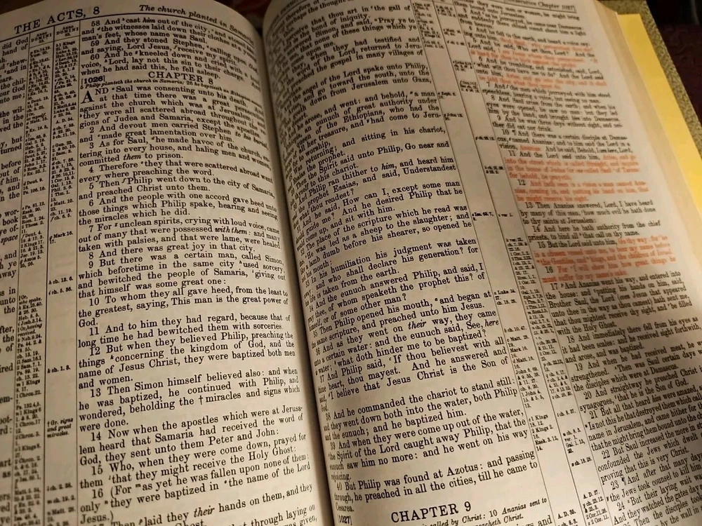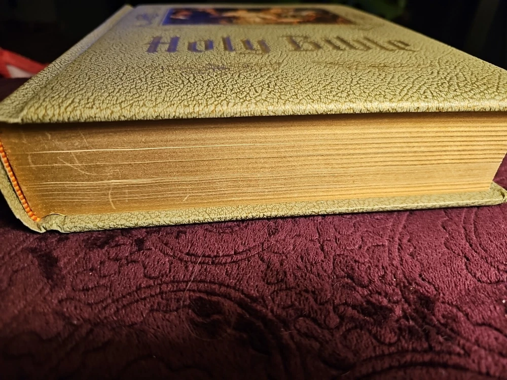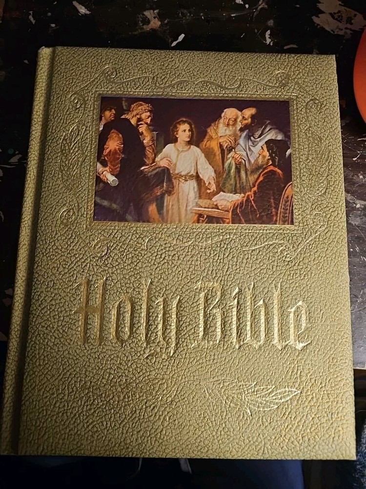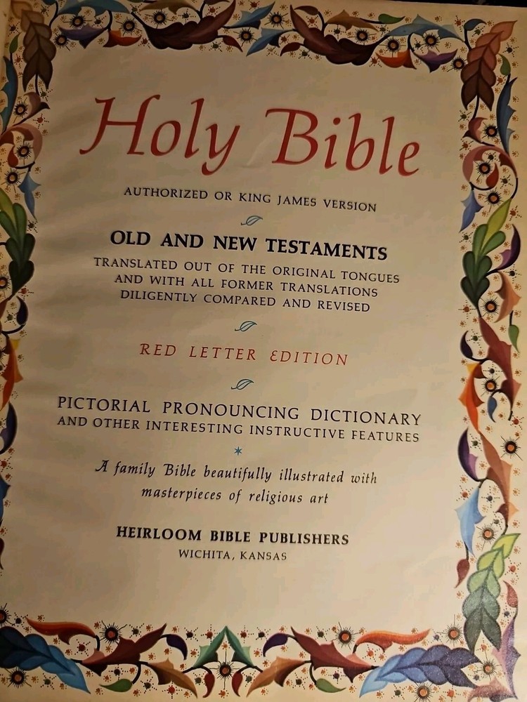 This large heirloom family Holy Bible is a must-have for any home library. The red letter edition, published in 1971 by Devore & Sons Inc., features a faux leather bound and is beautifully illustrated with a pictoral pronouncing dictionary. The book is written in English and the original language is Greek. This illustrated book is perfect any ages that are interested in religion and spirituality. The Bible is a reference book that provides answers to many questions about Christianity. It is a non-fiction narrative type and has special attributes that make it unique. The book measures 11 1/2 inches in height and 9 inches in width. There is a presentation page that has NOT been written on.