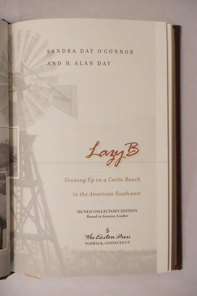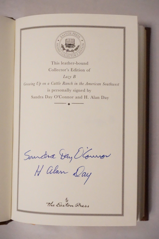 Wonderful signed copy of Lazy B: Growing Up On A Cattle Ranch In The American Southwest by Sandra Day O'Connor and H. Alan Day. Published in 2009 by Easton Press of Norwalk, Connecticut. The leatherbound book is in very good condition for its age, with minimal wear to the cover and edges. Great find at a great price! Please note the S&H charges, which include USPS postage, materials, and handling. Pictured bookends are not included in the sale. View our other eBay listings at Weiss Lane Books! https://www.ebay.com/str/Weiss-Lane-Books