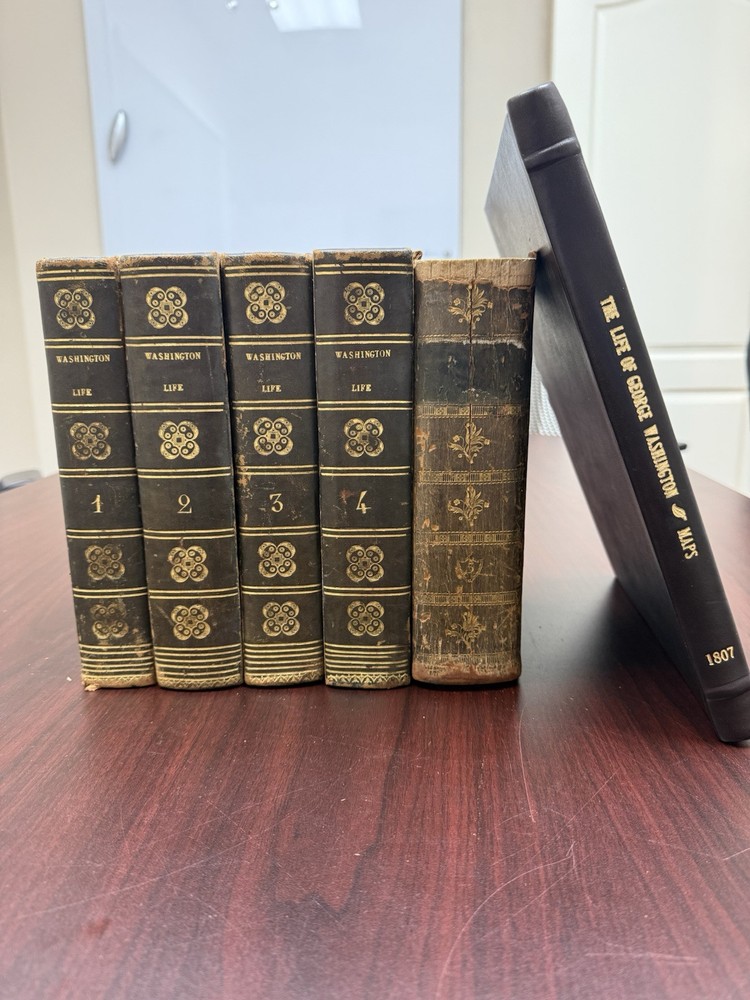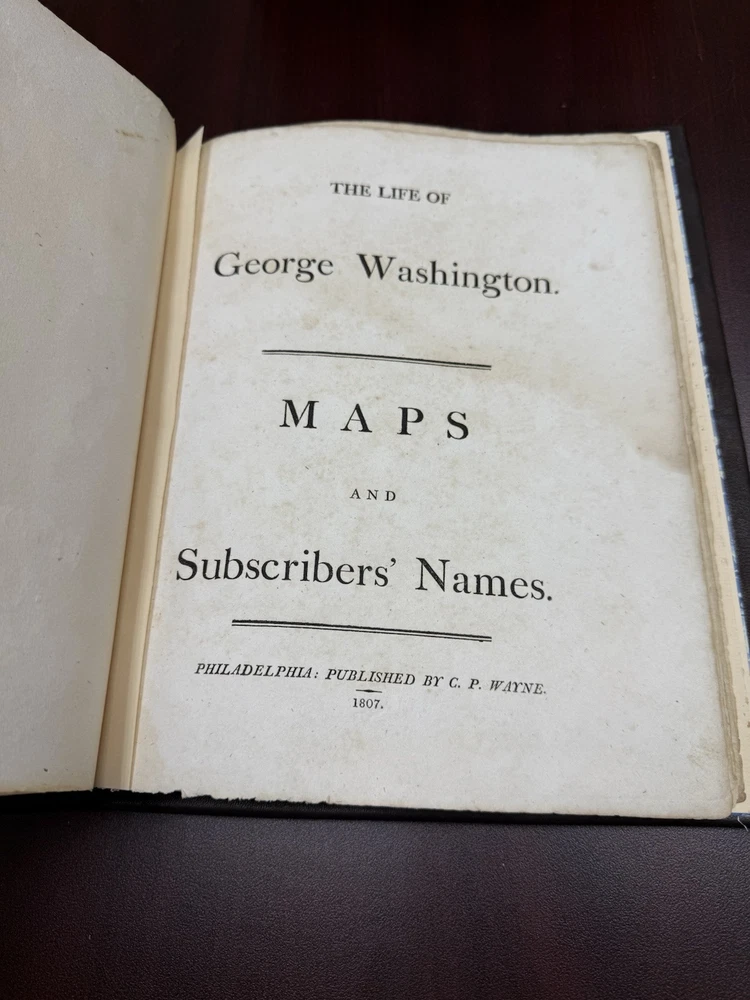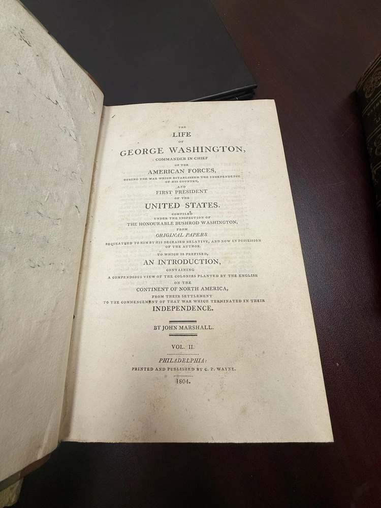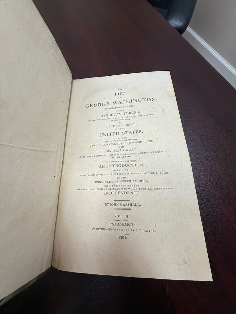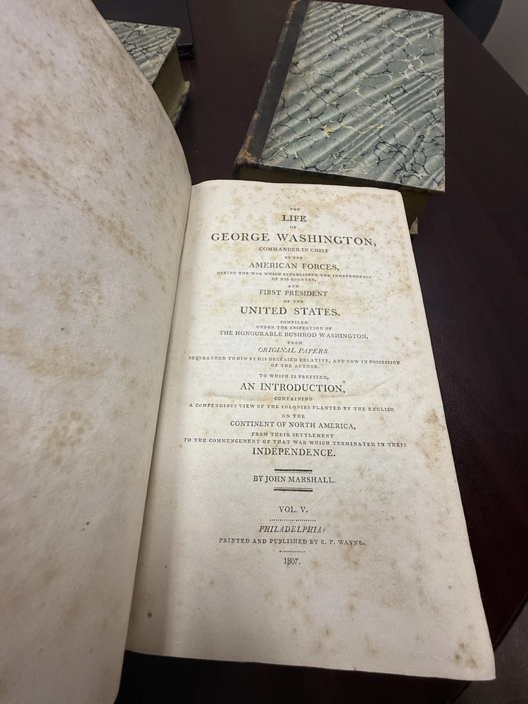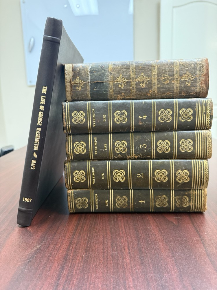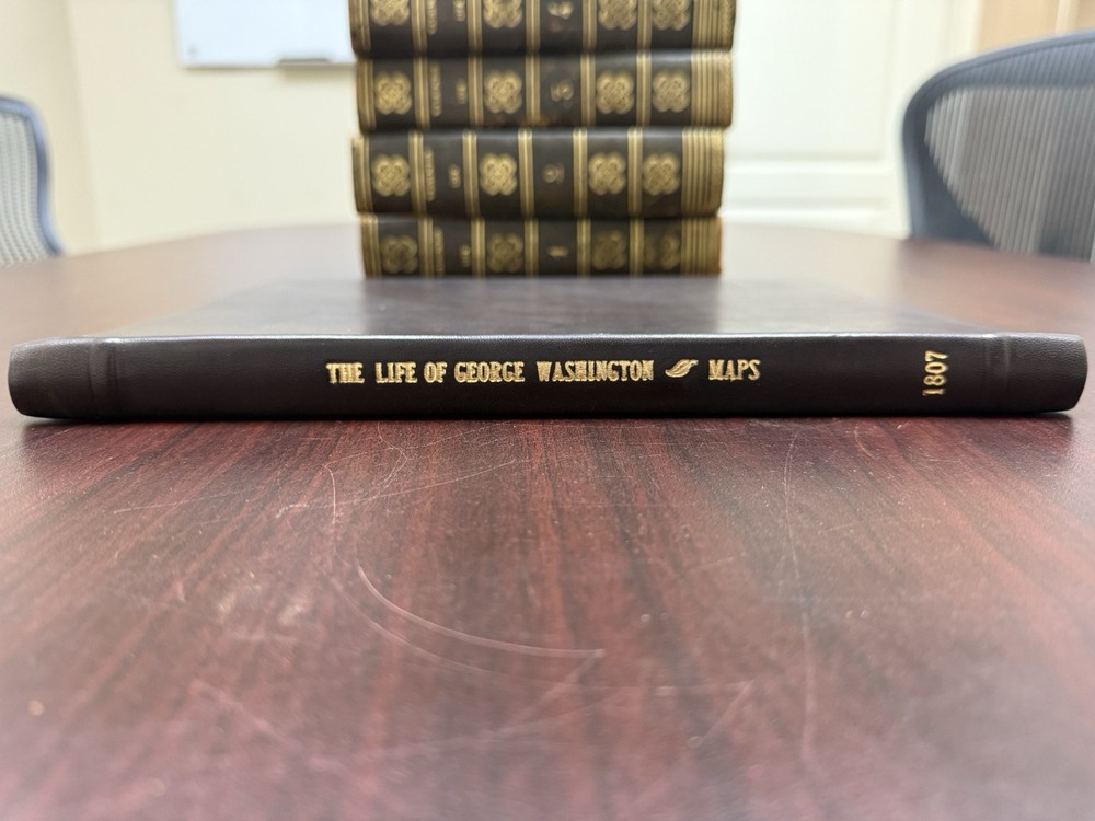 This is a rare and valuable first edition leather-bound set titled "The Life of George Washington" written by John Marshall from 1804-1807. Published in Philadelphia, Pa. by C P Wayne, this collection also includes the very rare original 1st edition atlas from 1807 with all 10 maps professionally cleaned/rebound. It is illustrated and focuses on George Washington's role in the American Revolutionary War, making it a notable piece of North American historical literature. Volume 5 is mismatched in terms of binding, as illustrated in the photos. Please feel free to ask any questions, or request additional photos, prior to purchasing.