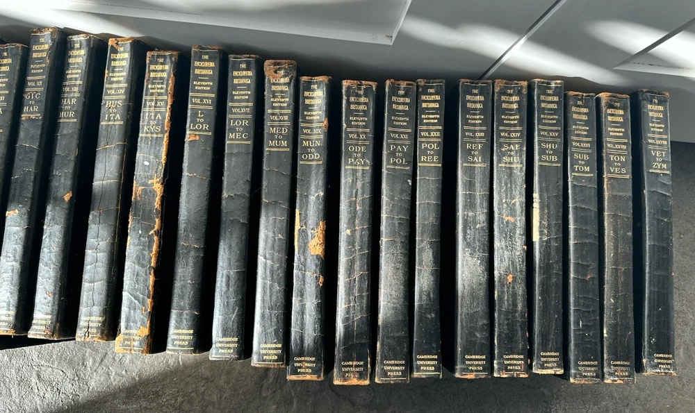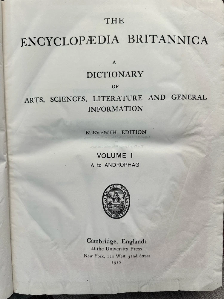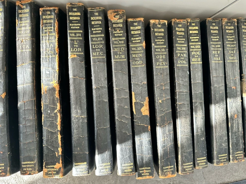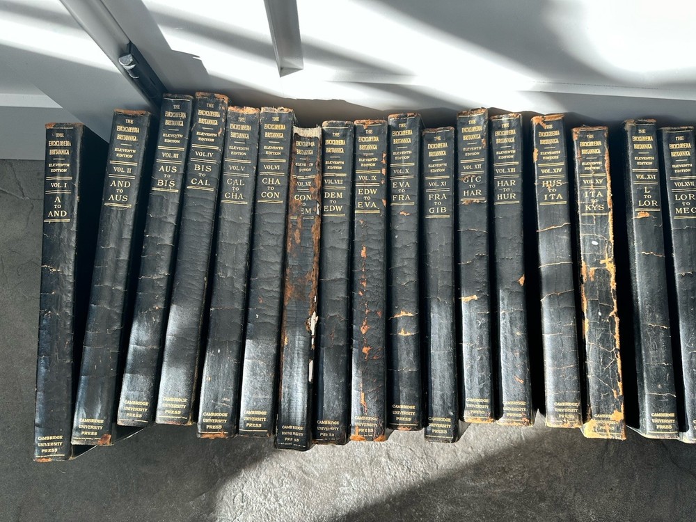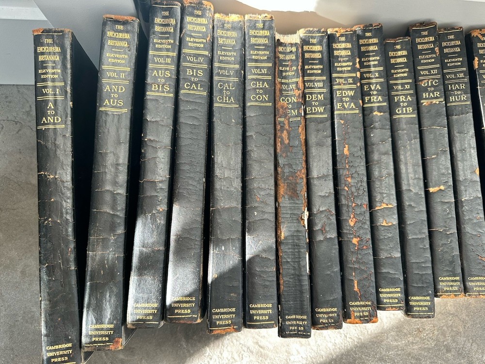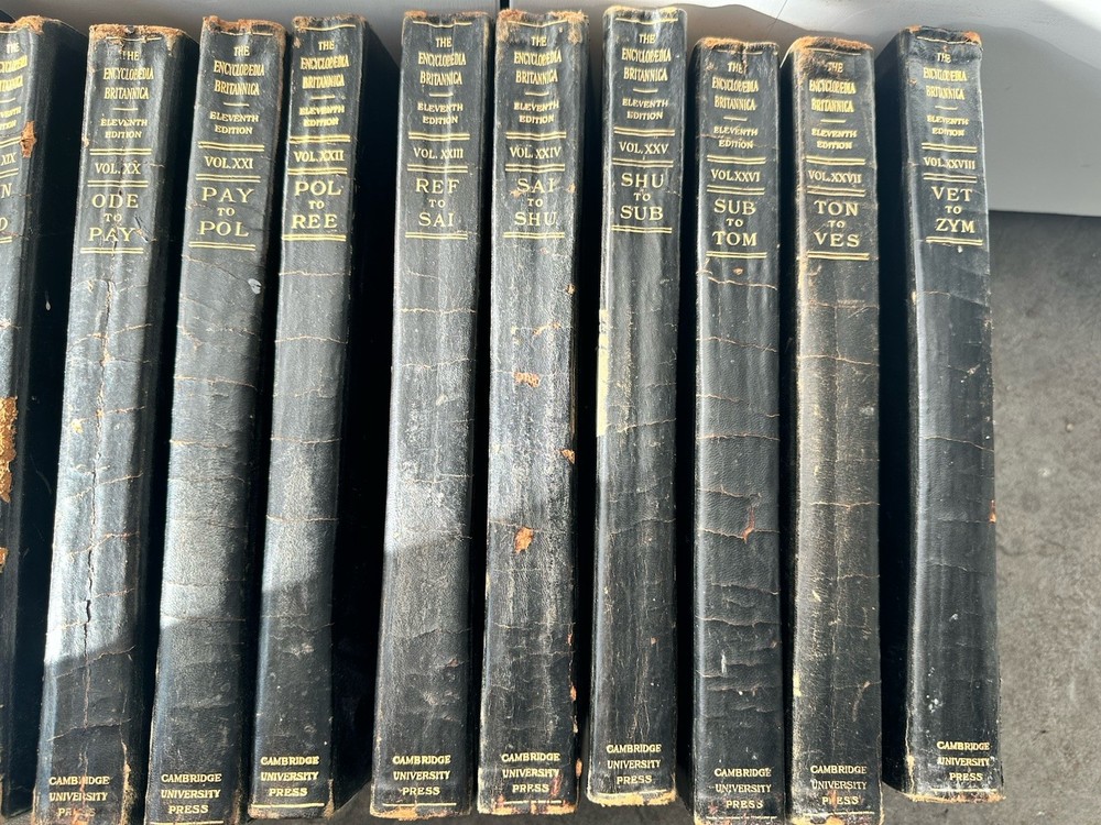 Good condition for vintage leather bound encyclopedia Britannica eleventh edition. VERY RARE set and in good condition for the age. Please see all pictures. Includes 28/29 books. missing volume 29- index. CONDITION: This set has some exterior spine wear/damage. Books themselves are in good condition. Some pages have some staining- looks like pink/red around the page (see photos) and minor tearing on some pages throughout volume. bindings in good condition and intact on all books. SHIPPING: Will ship in multiple boxes due to quantity and weight. Order will require signature. All orders are packed carefully to ensure a safe arrival. Please review carefully and ask any questions. We do not accept return orders. Ships fast and with care. We ship weekdays within 1 business day. Be sure to check out our other vintage books and listings.