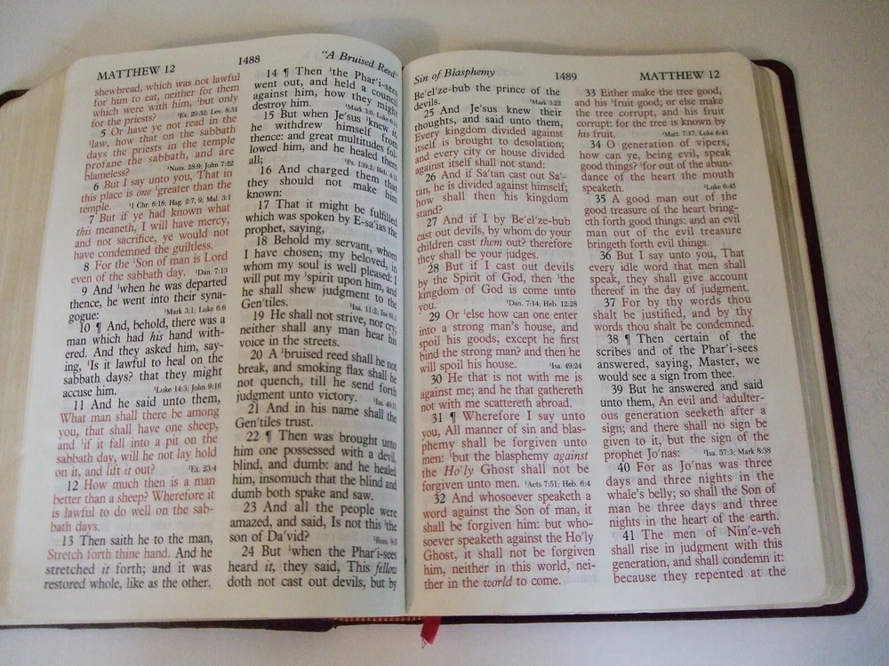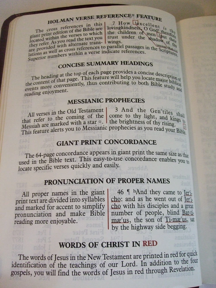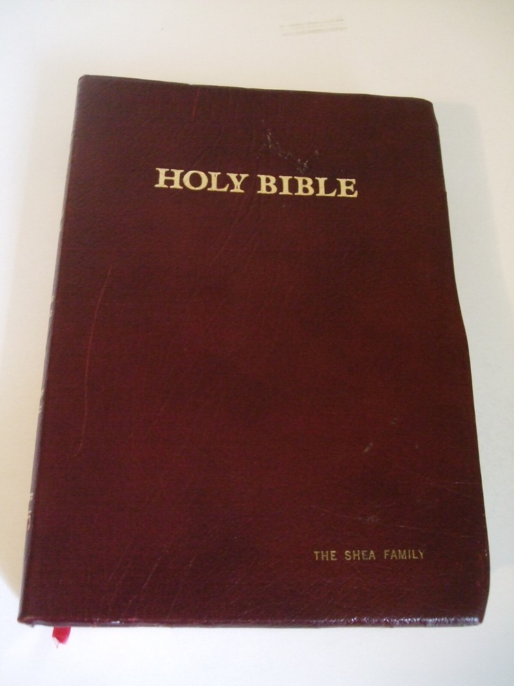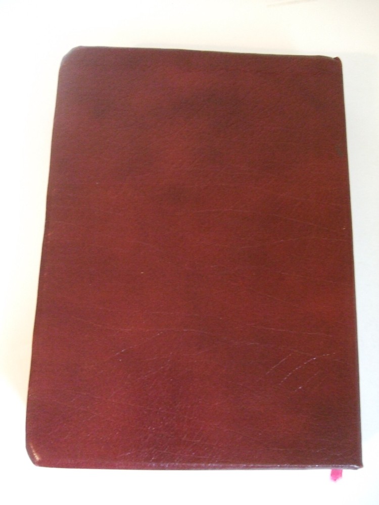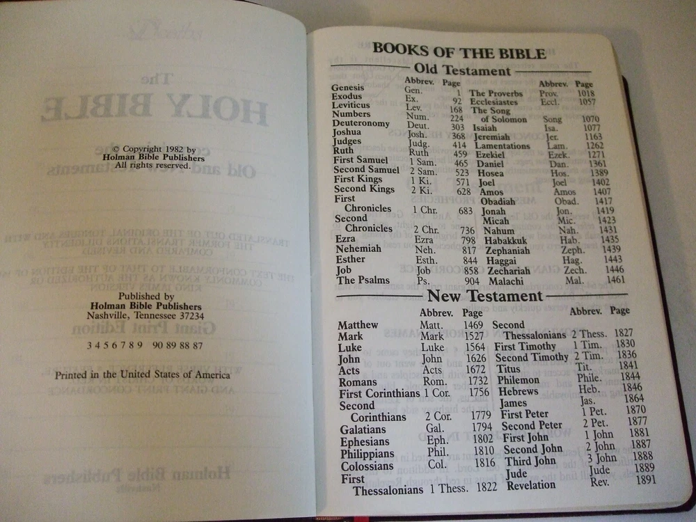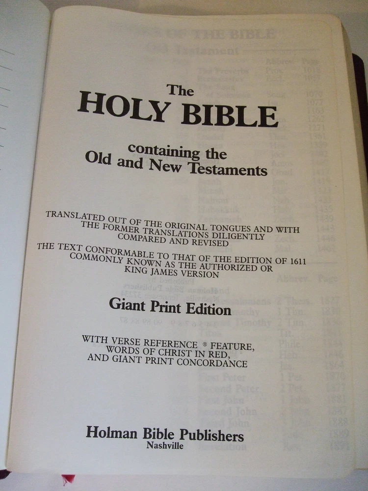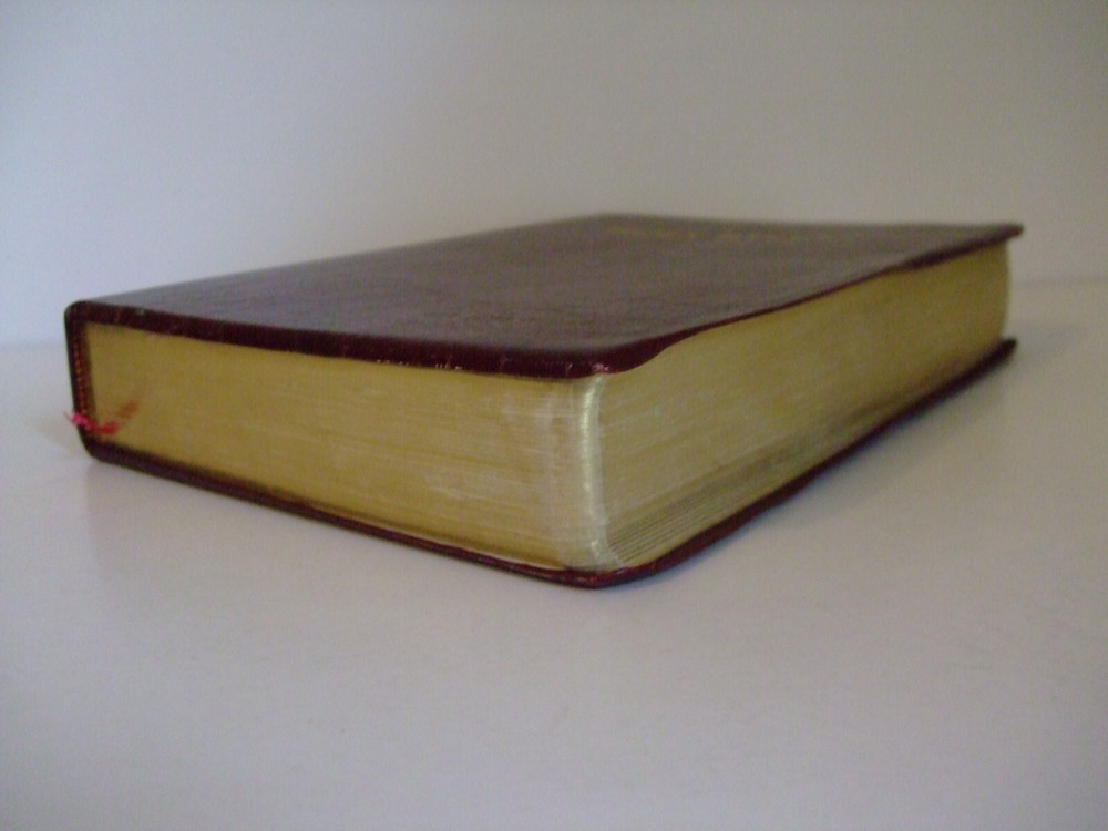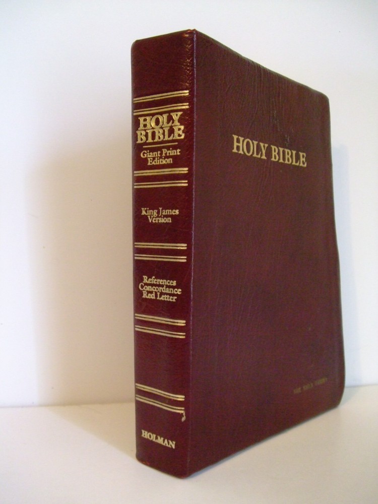 The Holy Bible Containing the Old and New Testaments. King James Version. Giant Print Edition. Nashville, TN: Holman Bible Publishers, 1987. Leather, no dust jacket, 1982 pages. 8vo: 9 1/2'' x 6 3/4'' Good+ condition: Dark red genuine leather cover, gilt lettering on spine and front cover, dark red endpapers, gilt page edges, red satin page marker (it is short), and fine India (Bible) paper. Previous owner's name gold stamped on front cover. Cover has some wear, rubbing, and tiny cracks. Fore edge has a small oil stain, which has caused some age toning on outer margin of some pages (text unaffected). Tightly bound copy with clean interior having no markings, writing, underlining, or highlighting in margins or text block. Inventory number 11721 POSTAGE and PAYMENT OPTIONS If you want to insure parcel against damage, please request this option and I will adjust your invoice. If you want to upgrade shipping for expedited delivery, just ask. Payment is due within 72 hours of winning the auction/Buy It Now Books are shipped within 3 business days. I have no control over delivery time once the package leaves my hands.
