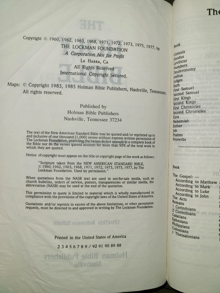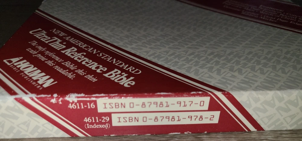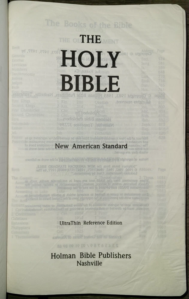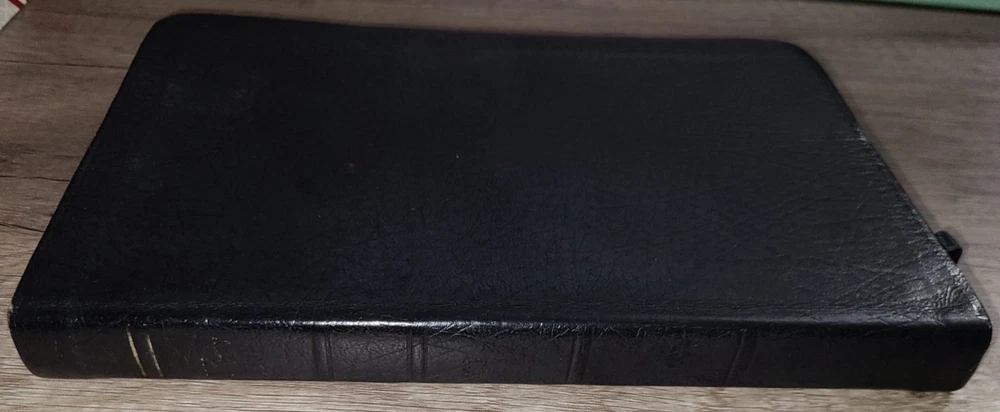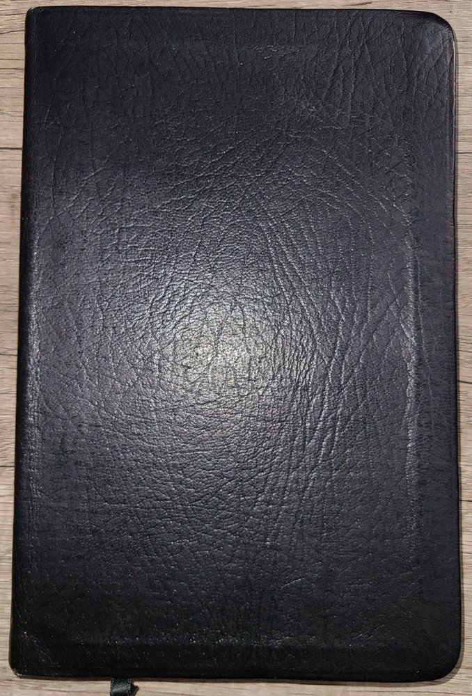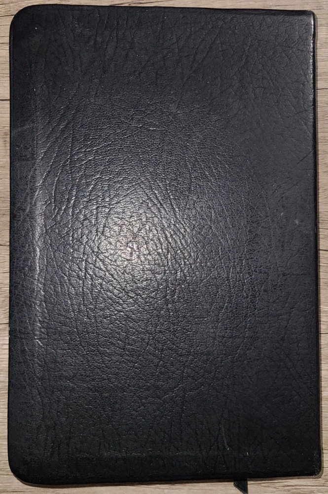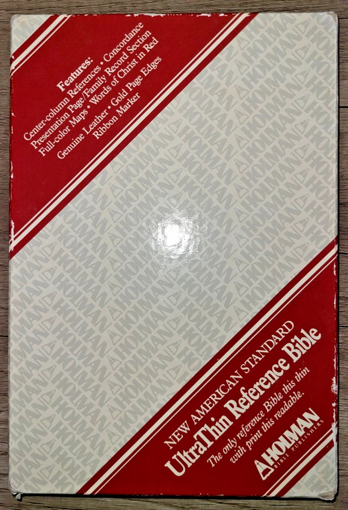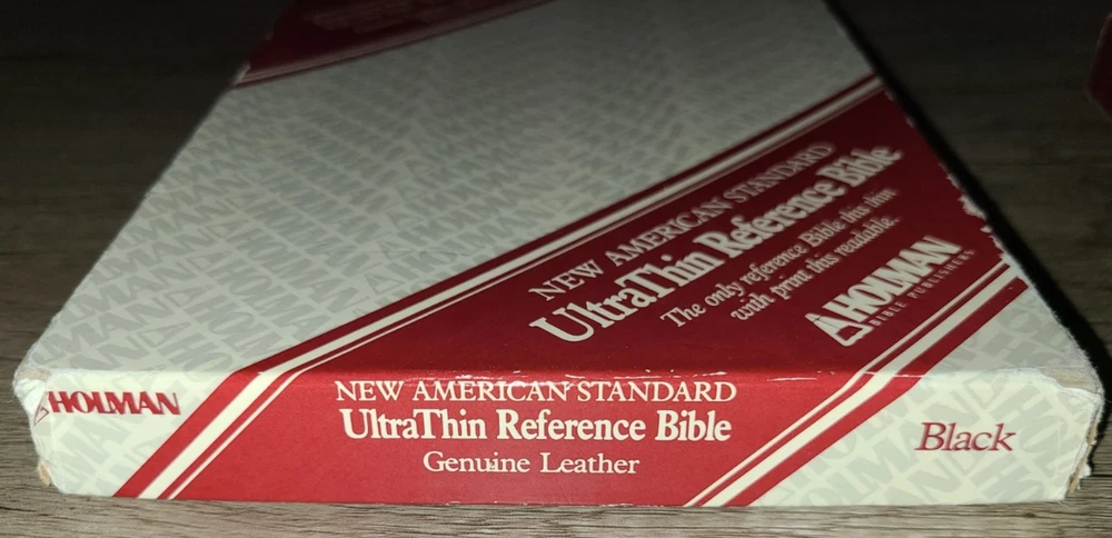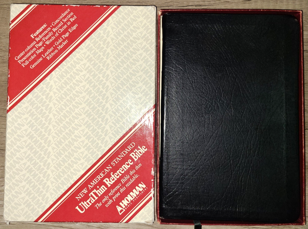 Vintage leatherbound book, The Holy Bible: New American Standard, UltraThin Reference Edition, 1988. Published by Holman Bible Publishers, Nashville. Black genuine leather cover; with original box. Measures 6" x 9". Minor wear as shown in photos. Sent to you from my smoke and pet free household in the US. No returns except in cases of incorrect info (I do my best to list all defects clearly, but I do occasionally miss things). Please see my other listings - now with FREE domestic shipping on all items! Please note that all my orders ship within ONE business day after payment is received (no Saturday shipping). 0879819170