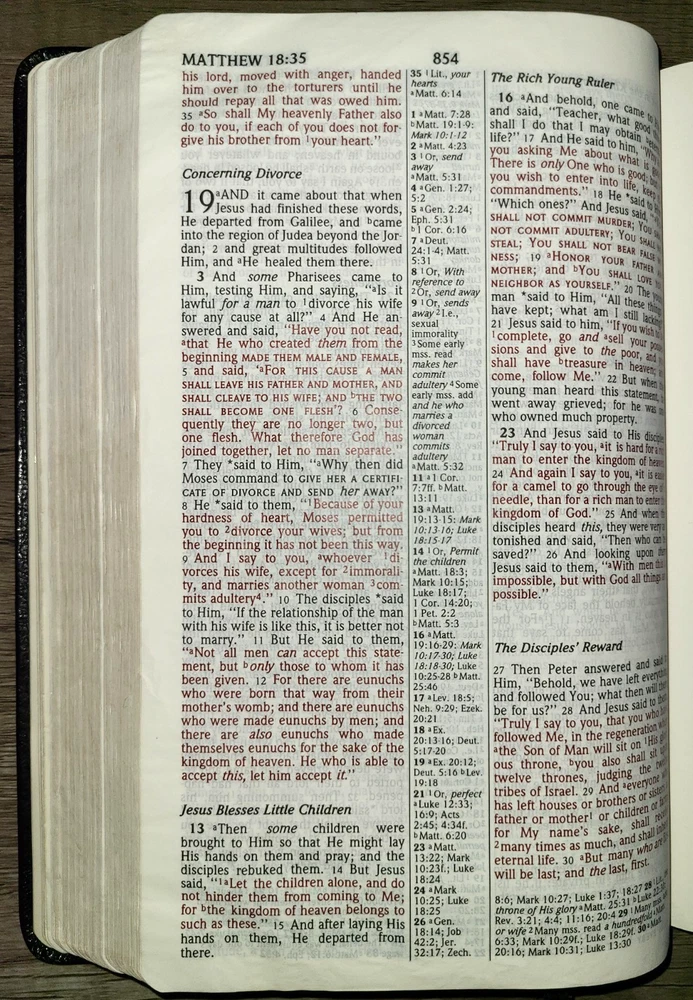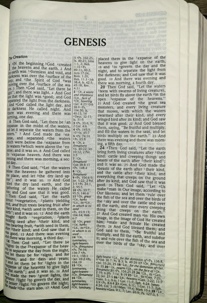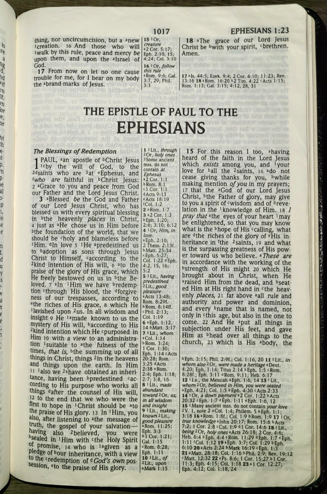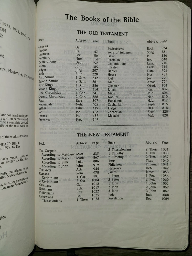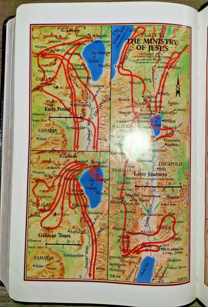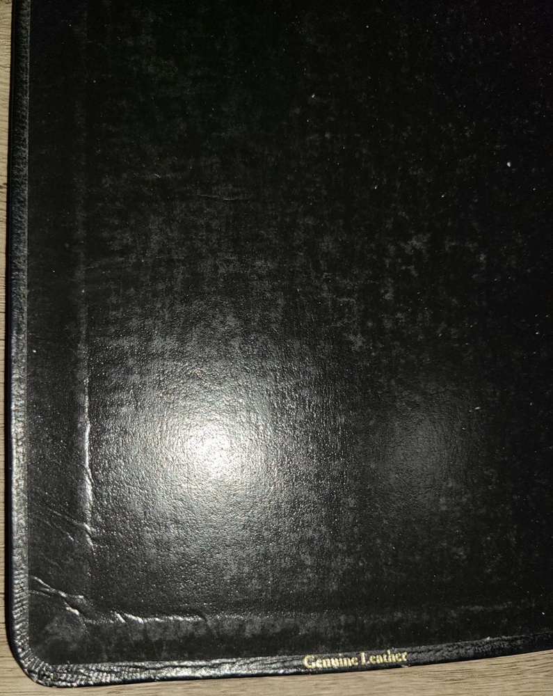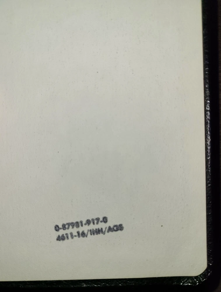 Vintage leatherbound book, The Holy Bible: New American Standard, UltraThin Reference Edition, 1988. Published by Holman Bible Publishers, Nashville. Black genuine leather cover; with original box. Measures 6" x 9". Minor wear as shown in photos. Sent to you from my smoke and pet free household in the US. No returns except in cases of incorrect info (I do my best to list all defects clearly, but I do occasionally miss things). Please see my other listings - now with FREE domestic shipping on all items! Please note that all my orders ship within ONE business day after payment is received (no Saturday shipping). 0879819170