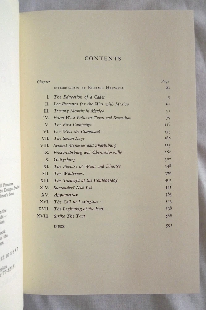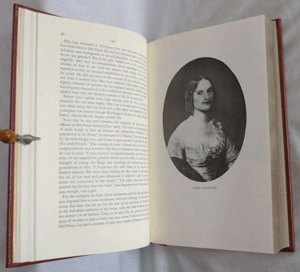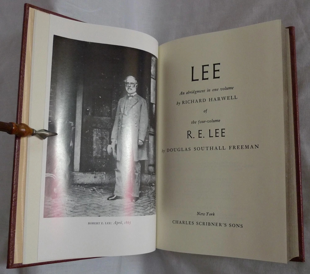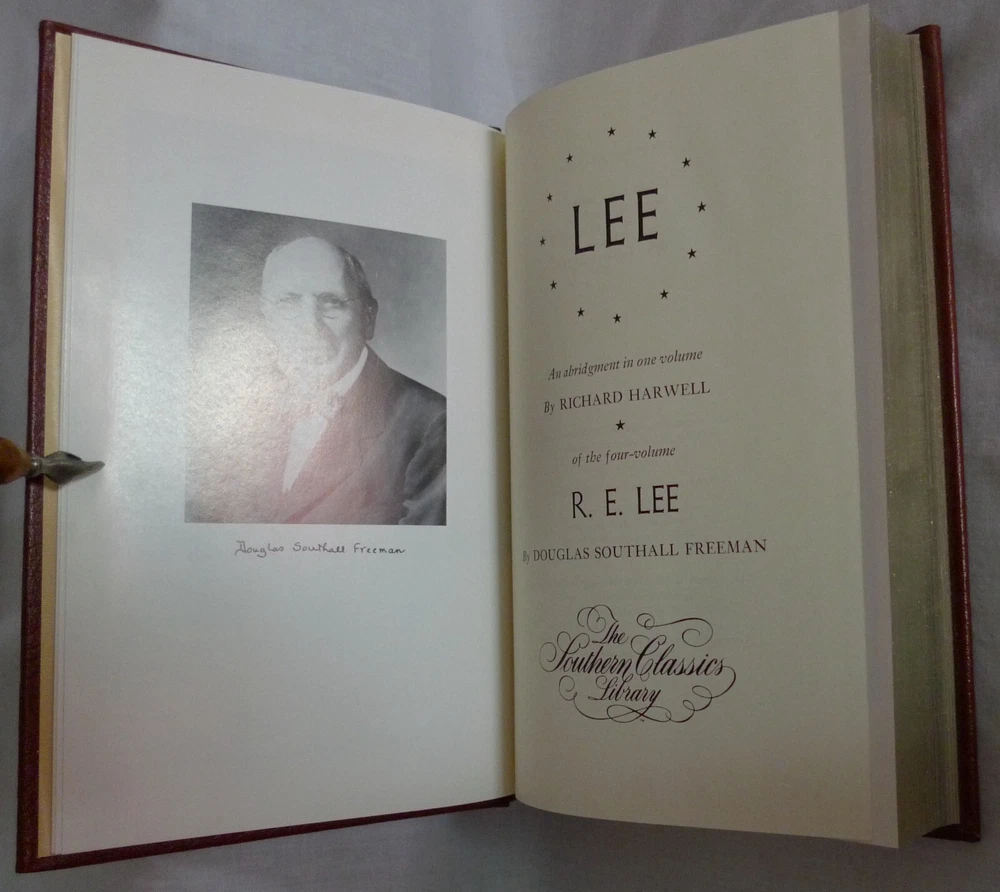 Title: Lee. An Abridgement in One Volume of the Four Volume R.E. Lee. Author: Douglas Southall Freeman, Richard Harwell. Publisher: The Southern Classics Library. Origin: Birmingham, Alabama. Publication date: 1982 (Reprint). Description: 601 p. 8vo. Publisher's leatherbound hardcover, gilt title/design on boards and spine cover, illustrated text. Reprint of the 1934/1935 Charles Scribner's edition. Measures: 1.5 W x 6.5 D x 9.5 H inches. About the work: Harwell's abridgment of Douglas Freeman's 4 volume biography entitled "Lee" was published in 1961. Freeman's history of General R.E. Lee was published 1934-35 and won a Pulitzer. The abridgment faithfully captures Freeman's writing, presents a remarkable flow, and is inspiring. This is a "must" read for students of the Civil War and for those who love biographies of exceptional people.